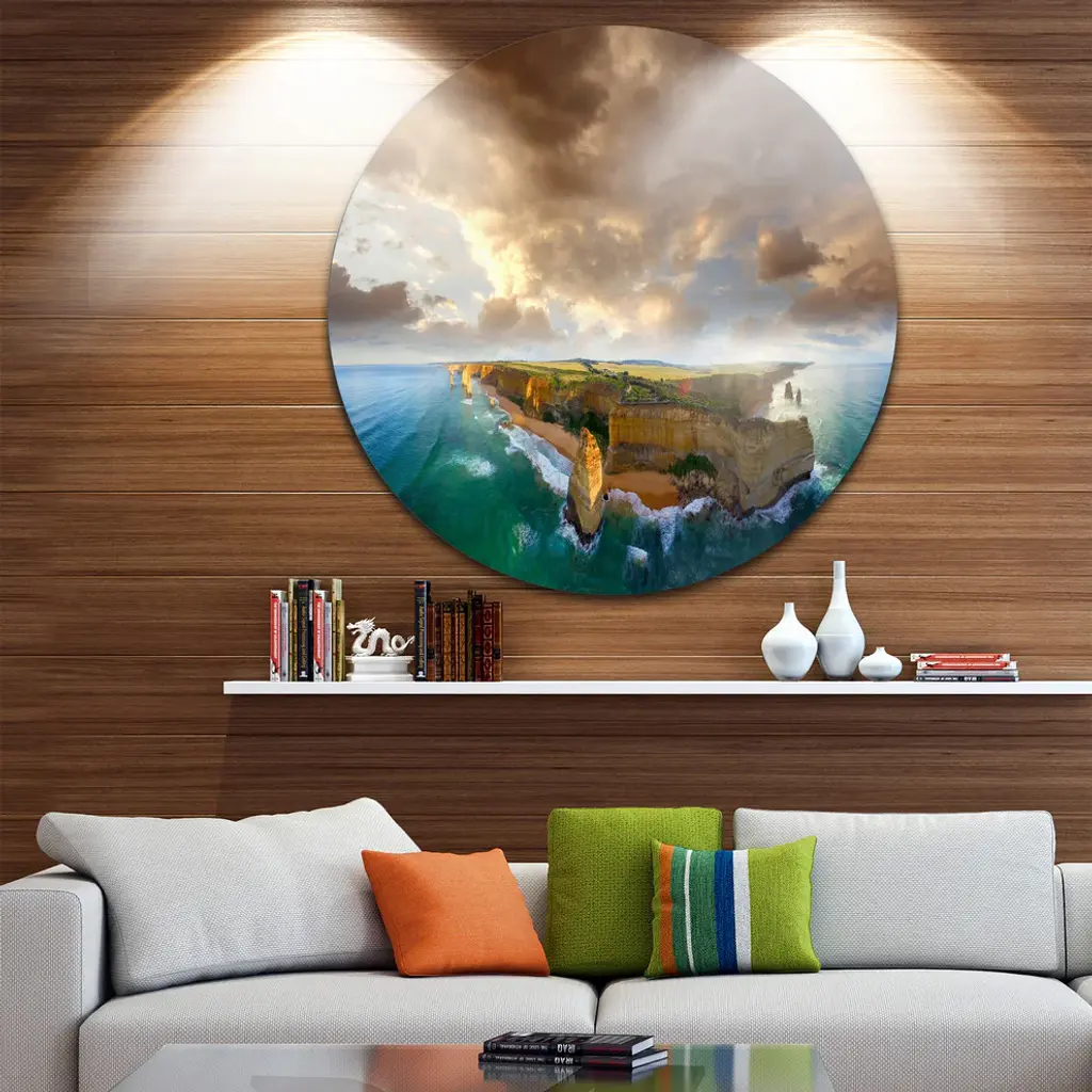 Bring Contemporary Abstraction to your home with this large Circle Metal wall art. This Great Ocean Road Australia Blue Metal Artwork makes it the focal point of any room or office. - White Gloss Coating ensures colors are extra vibrant with light reflection.- Aluminum grade Sheet Metal with 1 inch mounting frame on the back giving the illusion that the artwork is floating on the wall..- Mounting Brackets are included along with instructions.- High Quality Digital images are created directly into a glossy aluminum panel producing a stunning and captivating print into the glossy finish of the metal.- Water, Fire and Scratch resistant HD Aluminum panels.- Looks better than any photo paper and guaranteed to last at least 20 years- Easy to clean with a microfiber cloth. Colors are far superior to regular Canvas Art. - Easy to Hang