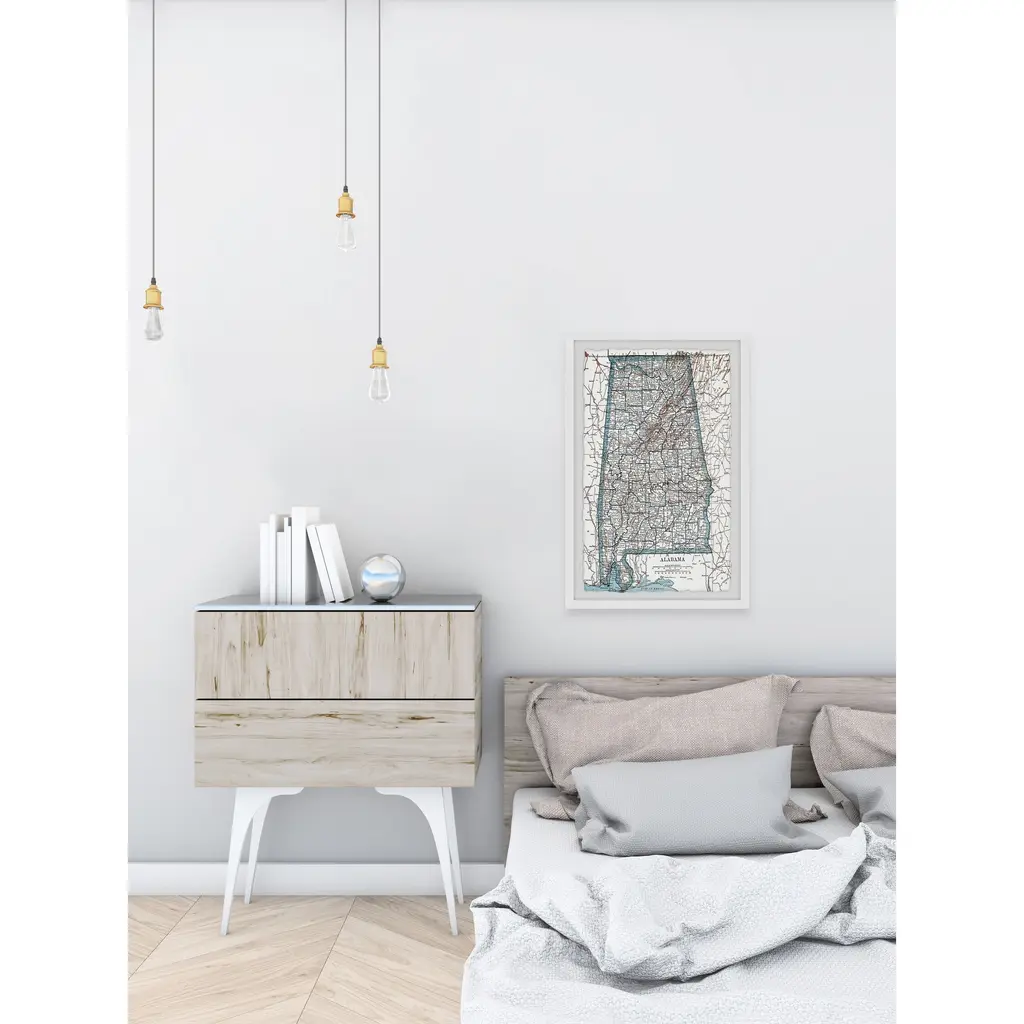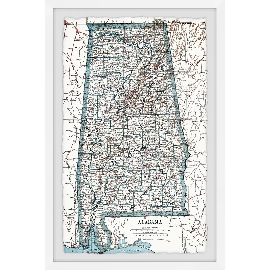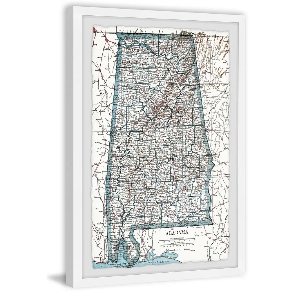 Known for its historical memorial parks and civil rights landmarks, this detailed map of Alabama will show you all of the state's best towns and places to visit. This piece is printed on high quality archive paper and professionally hand-framed. With wall-mounting hooks included, this artful accent is ready to hang up as soon as it reaches your front door. • Top quality Giclee print on high resolution Archive Paper • Hand cut deckled edges • High quality durable non-warping frame • Finished under shatter resistant plexiglass • Arrives ready to hang • Includes a certificate of authenticity • Printed the USA