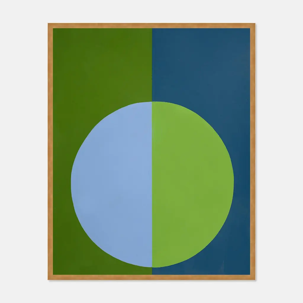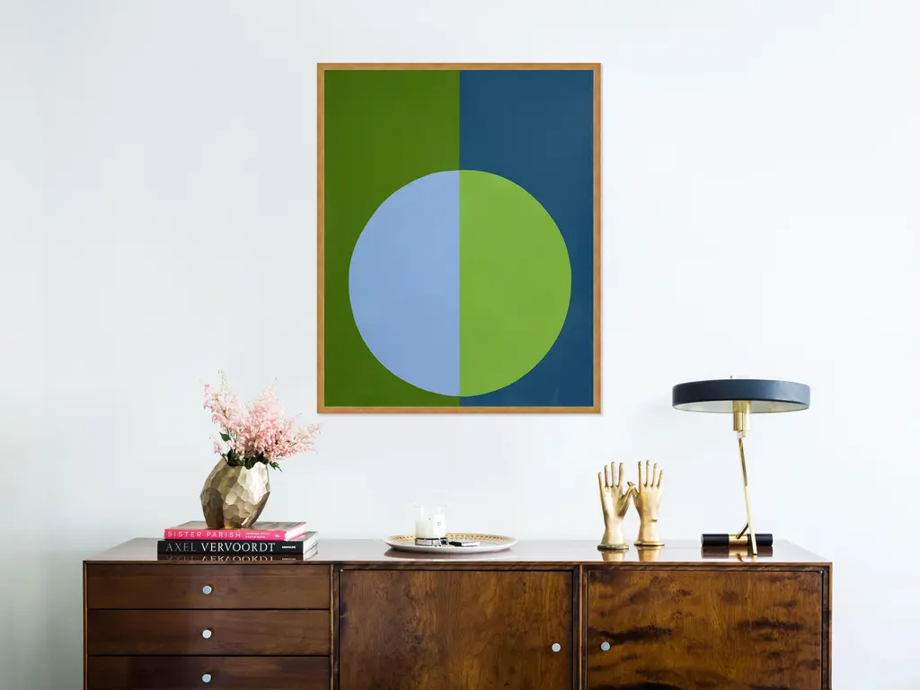 DESCRIPTION: "Green & Blue Forever" Medium Gold Framed Print by Stephanie Henderson SPECIFICATIONS: Type: Framed Paper. Framed Size (in): 29x36. Orientation: Vertical. Flush/Float/Matted: Flush. Frame Color: Gold. Hanging Hardware: Picture Perfect. FRAMING: Each art work arrives framed and ready to hang. We use handmade frames with a plexiglass glazing front, because it offers less glare than standard glass. At this time, we only offer framed prints. ARTIST BIO: Stephanie Lear Henderson is a painter living in Ponte Vedra Beach, Florida. Her work can be found in collections throughout the US and Canada. Working primarily in hard-edge abstraction, she also occasionally paints representational works in oil. A native of Thomasville, Georgia, Stephanie earned a B.A. in English Literature from the University of Virginia and an M.A. in Journalism from the University of Georgia. Stephanie’s work revolves around bold, saturated color and how colors communicate with each other and affect the observer. Her paintings contain forms that are simple, allowing the colors to express themselves without complications. Stephanie’s work reveals focus, precision, and an insatiable appetite for evocative combinations of color. She revels in the challenge of painting perfectly clean lines freehand with a brush. No tape. No masking.Stephanie embraces the belief that color alters mood, outlook, and brings absolute joy to life. Stephanie's artwork has appeared in a multitued of publications including House Beautiful and The CUT.