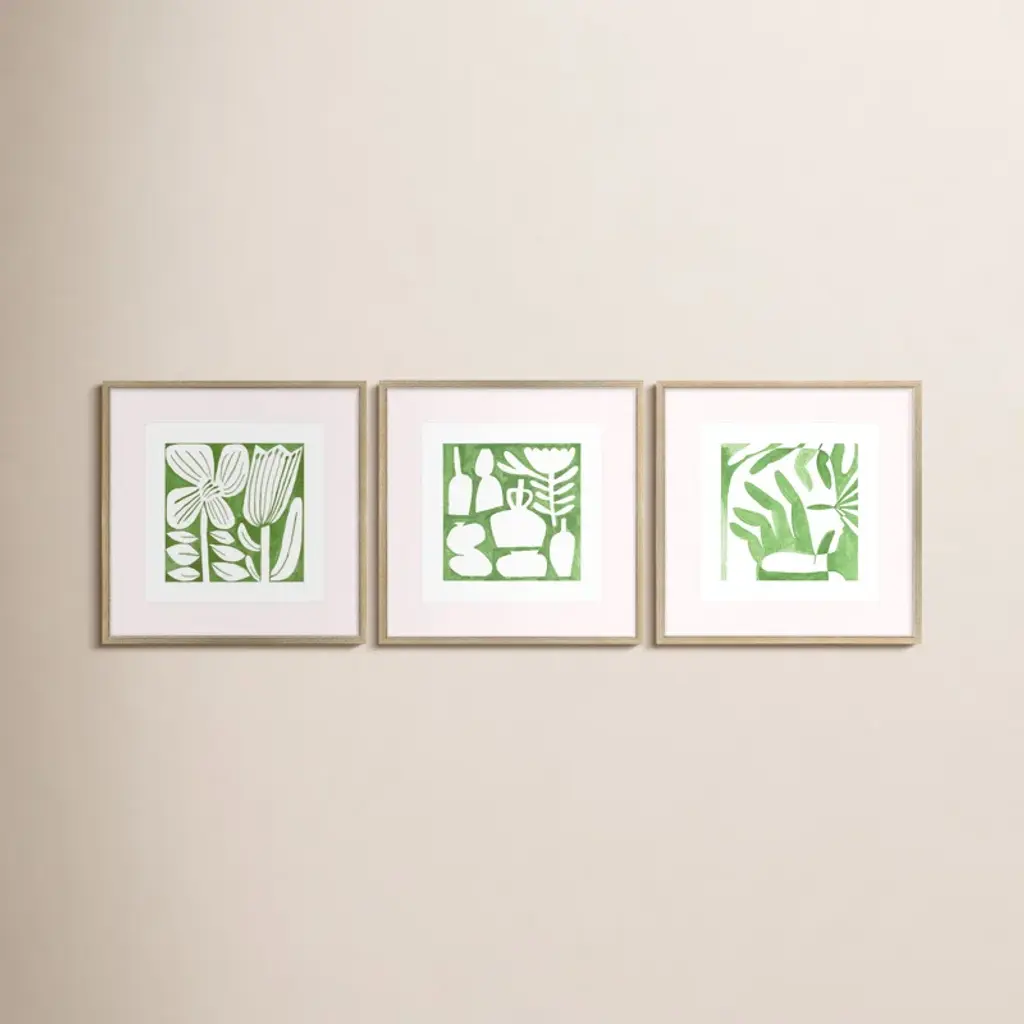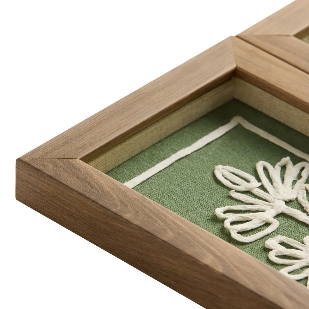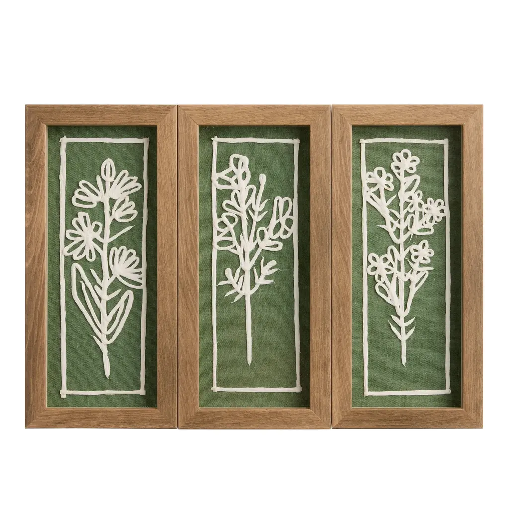 Layers of delicate rice paper are hand-formed into lovely floral shapes over green linen in our exclusive wall art. Ready to hang in lightweight shadow-box frames with a medium-oak finish, this set of three floral designs creates a welcoming arrangement over mantels, sofas, and beds. Its earthy palette and meticulous handiwork are a versatile and natural complement to pottery, textile art, and home furnishings.