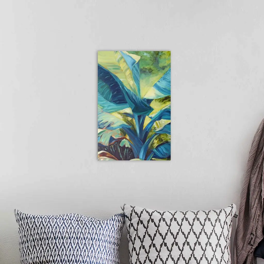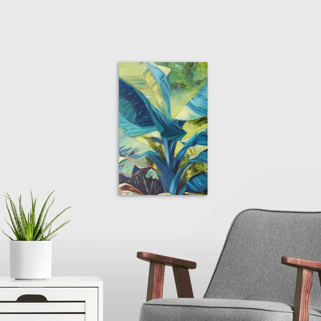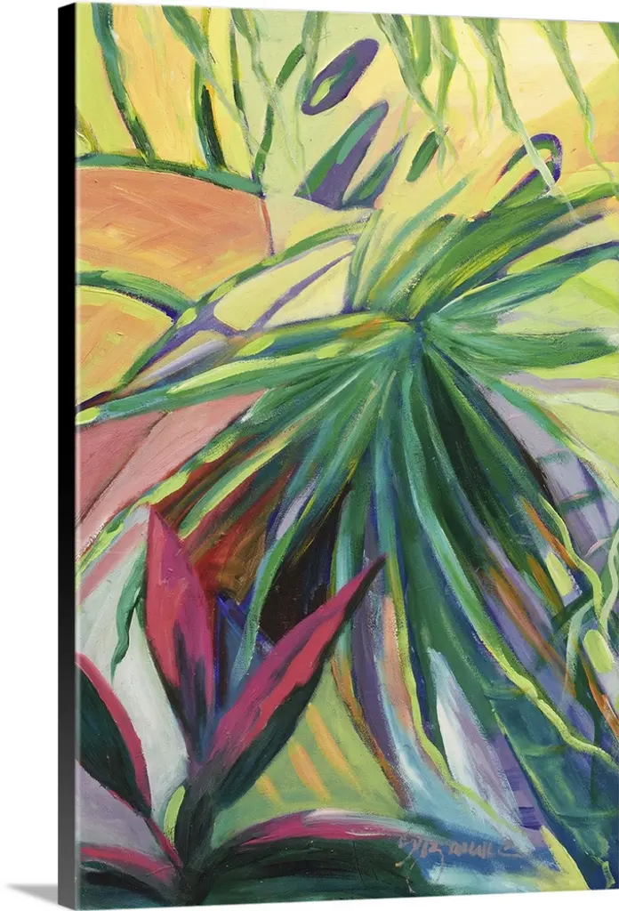 Vibrant colors and energetic brush strokes create youthful, tropical leaves in this contemporary artwork.