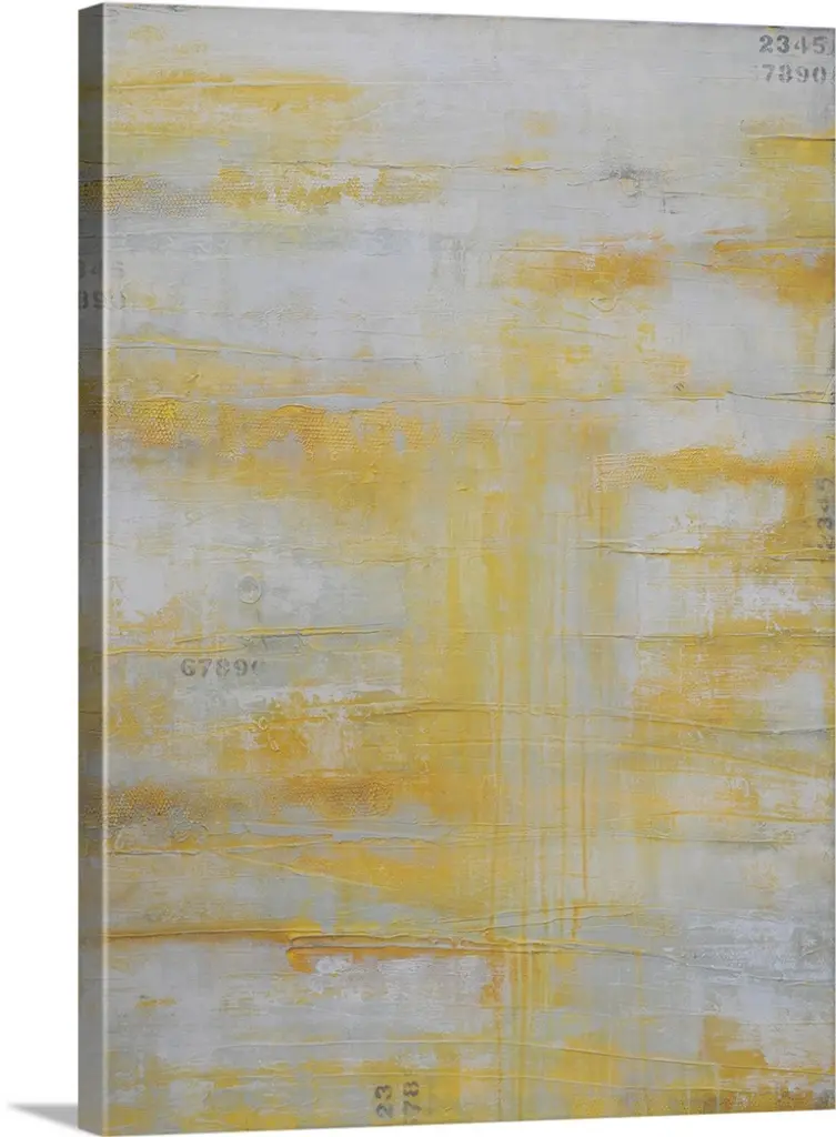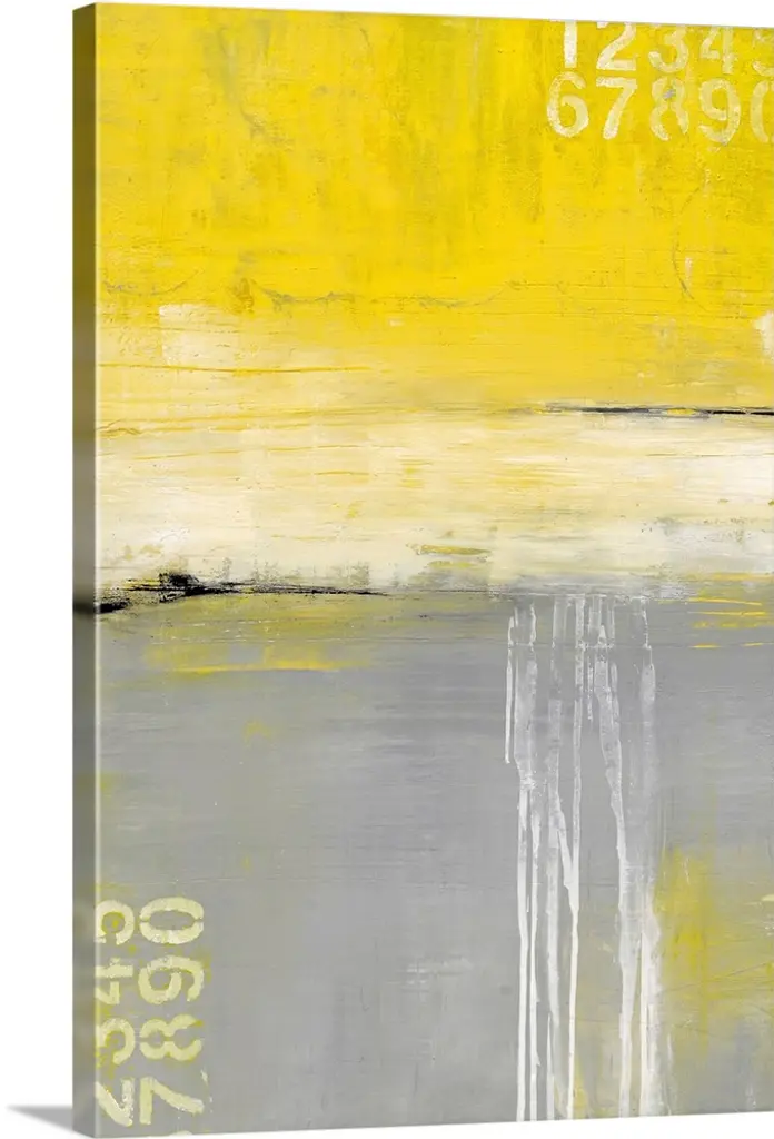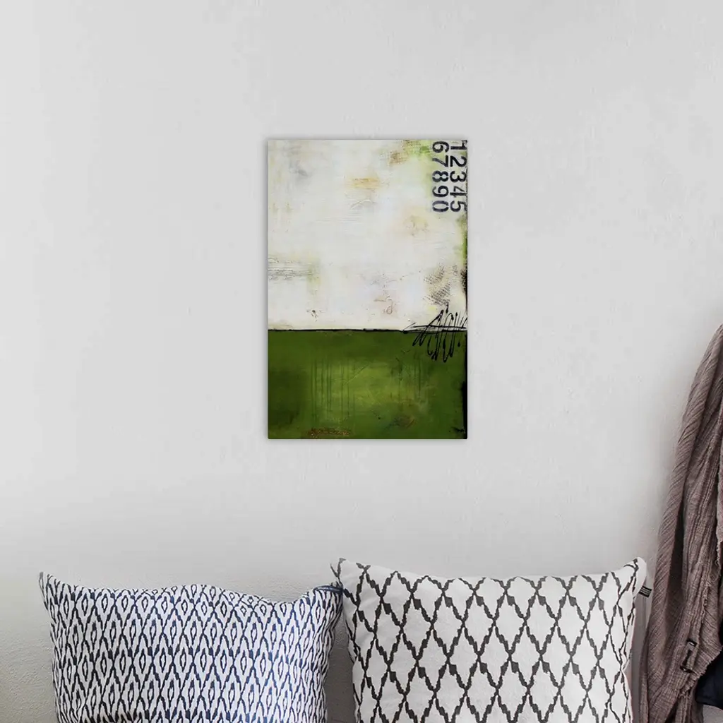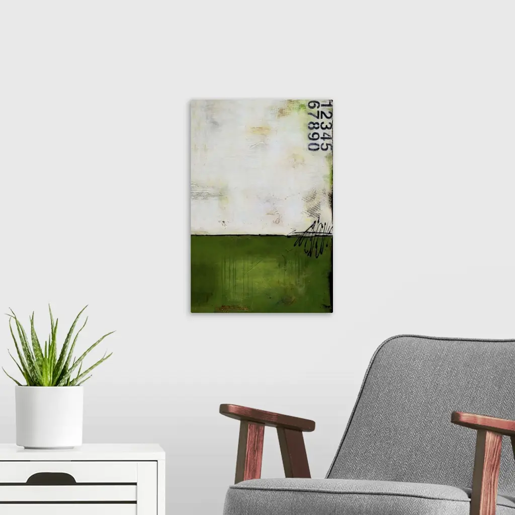 Contemporary abstract painting using dark green and stenciled numbers.