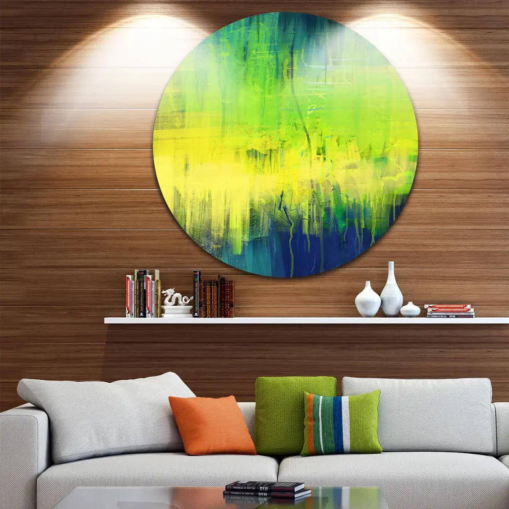 Bring Contemporary Abstraction to your home with this large Circle Metal wall art. This Green Blue Fusion Metal Artwork makes it the focal point of any room or office. - White Gloss Coating ensures colors are extra vibrant with light reflection.- Aluminum grade Sheet Metal with 1 inch mounting frame on the back giving the illusion that the artwork is floating on the wall..- Mounting Brackets are included along with instructions.- High Quality Digital images are created directly into a glossy aluminum panel producing a stunning and captivating print into the glossy finish of the metal.- Water, Fire and Scratch resistant HD Aluminum panels.- Looks better than any photo paper and guaranteed to last at least 20 years- Easy to clean with a microfiber cloth. Colors are far superior to regular Canvas Art. - Easy to Hang