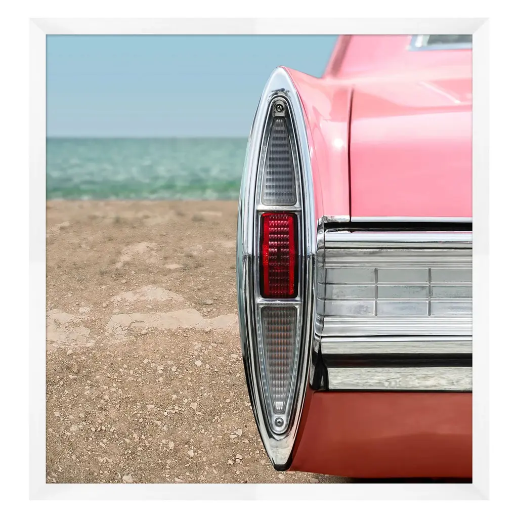 A bright-green sixties Chevrolet Camaro lit by the setting sun with a palm tree reflecting on the trunk. Unframed Green Camaro by Jens Ochlich Print, 32" x 48"