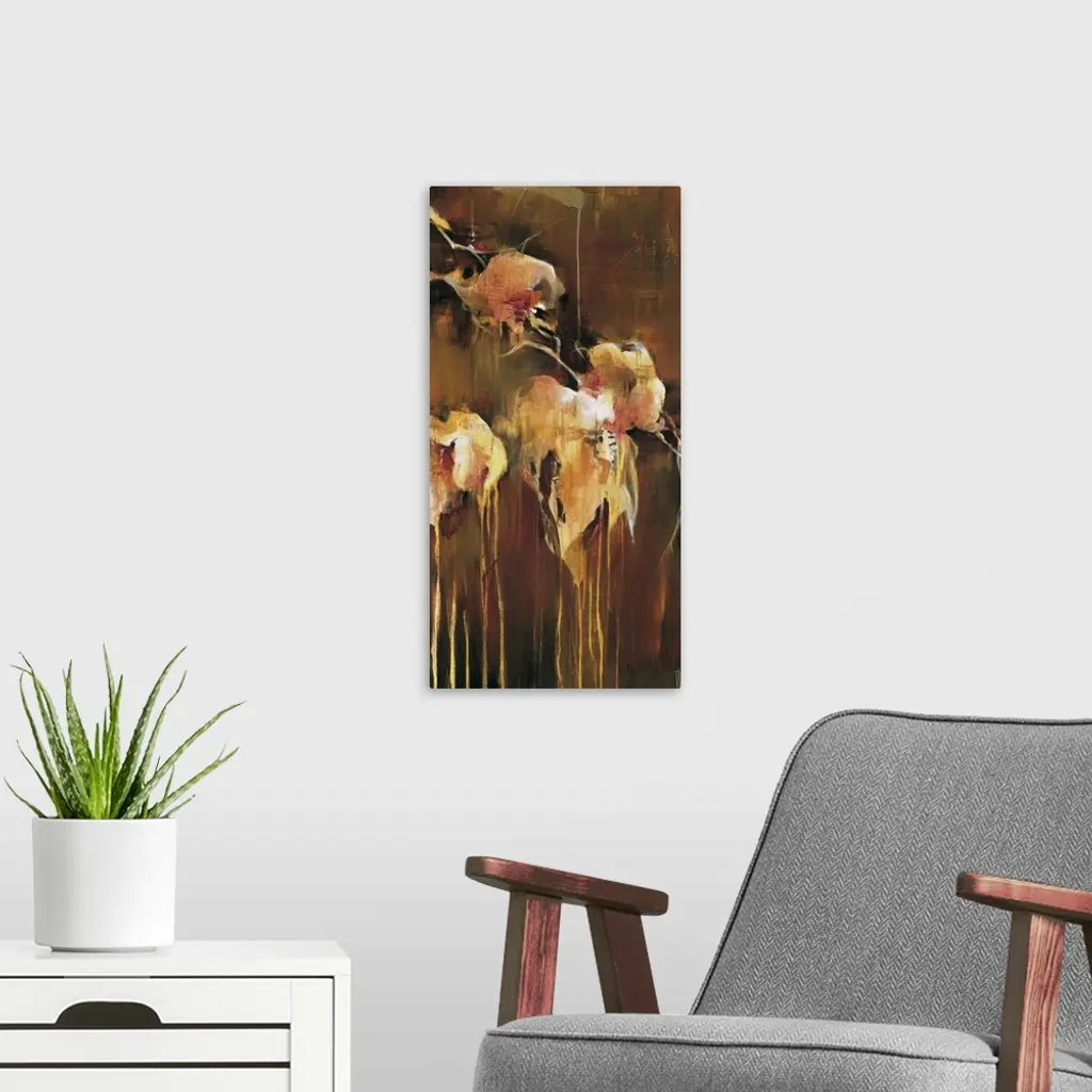 Abstract painting using earth tones to create flowers that look as though they are dripping.