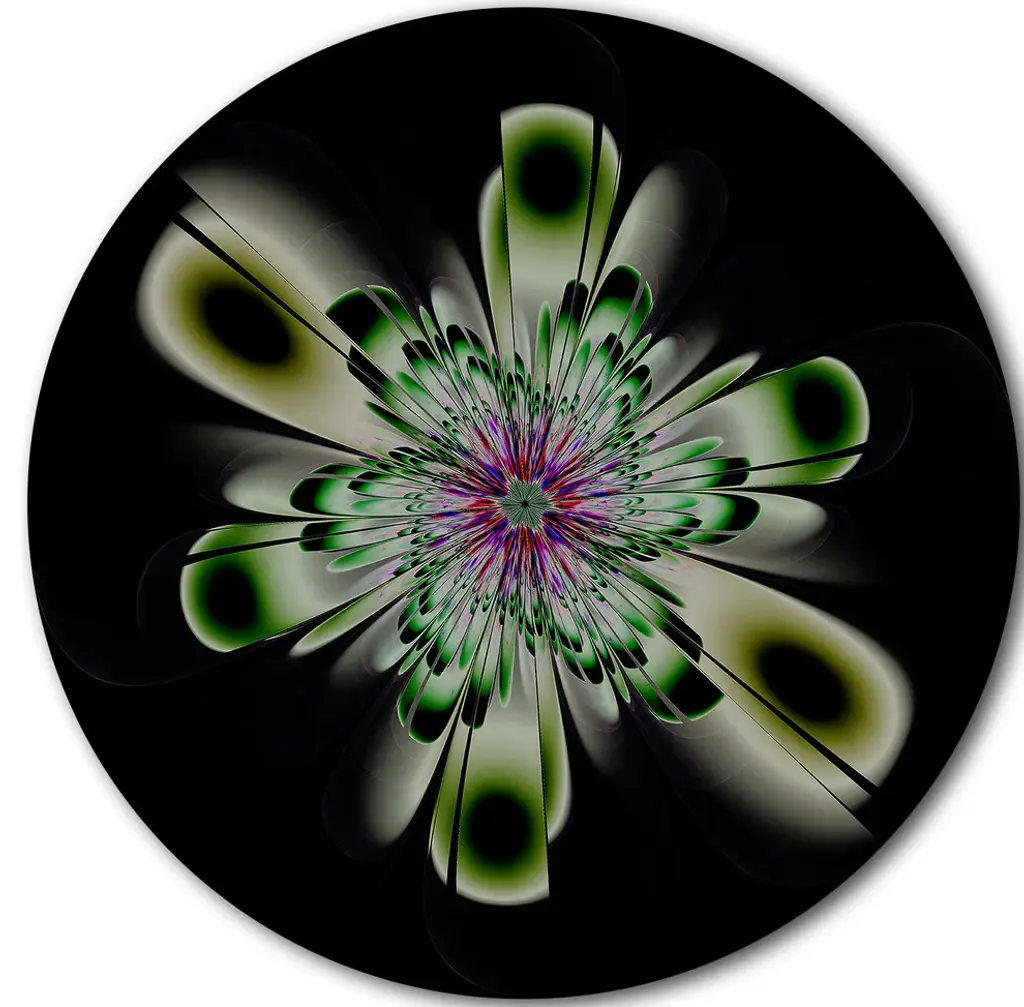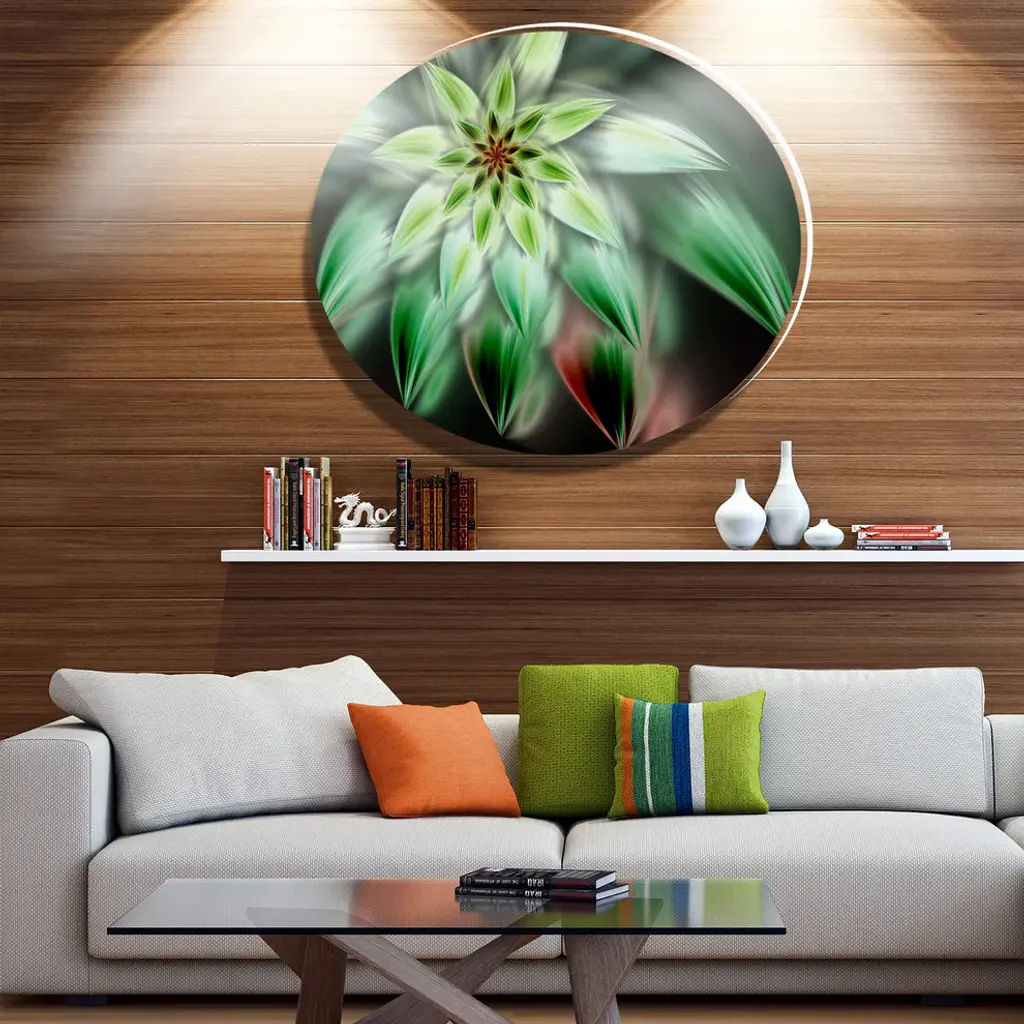 Bring Contemporary Abstraction to your home with this large Circle Metal wall art. This Green Flower Fractal Art Metal Artwork makes it the focal point of any room or office. - White Gloss Coating ensures colors are extra vibrant with light reflection.- Aluminum grade Sheet Metal with 1 inch mounting frame on the back giving the illusion that the artwork is floating on the wall..- Mounting Brackets are included along with instructions.- High Quality Digital images are created directly into a glossy aluminum panel producing a stunning and captivating print into the glossy finish of the metal.- Water, Fire and Scratch resistant HD Aluminum panels.- Looks better than any photo paper and guaranteed to last at least 20 years- Easy to clean with a microfiber cloth. Colors are far superior to regular Canvas Art. - Easy to Hang