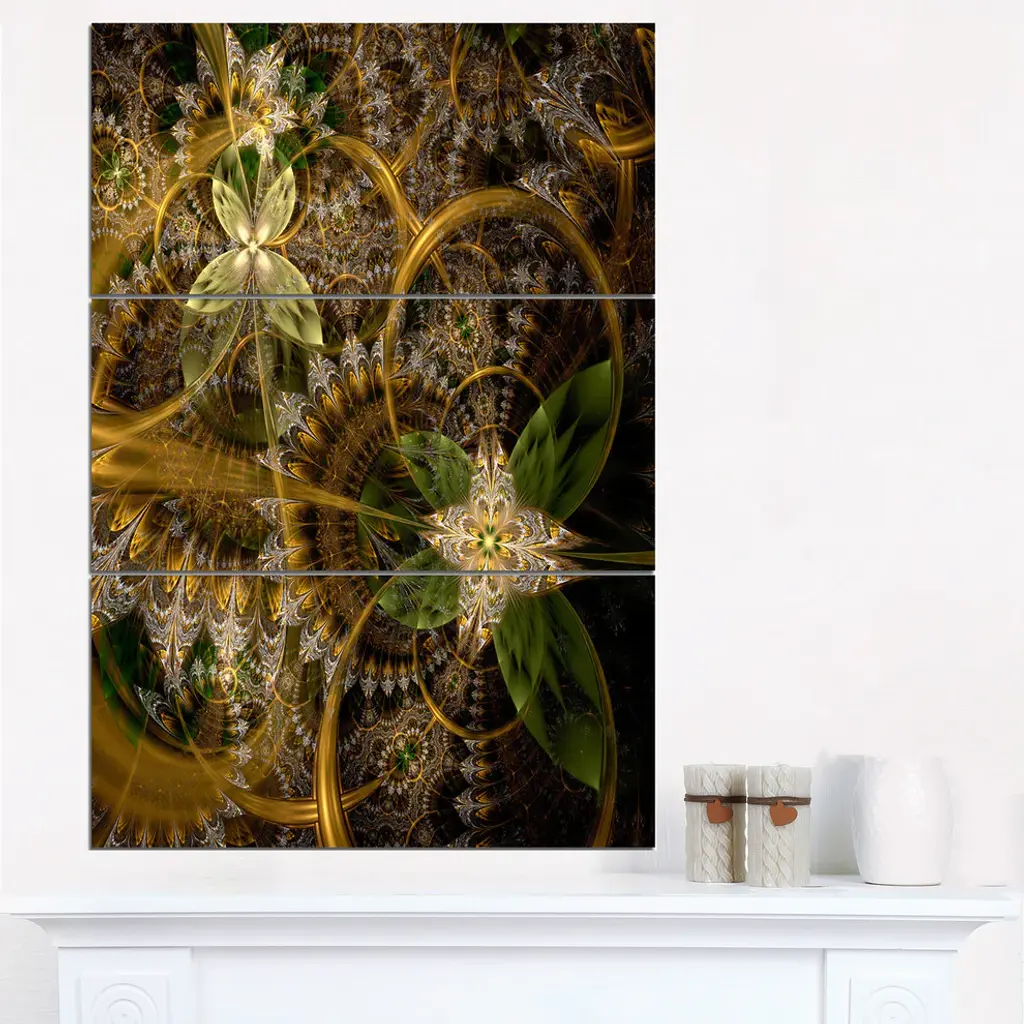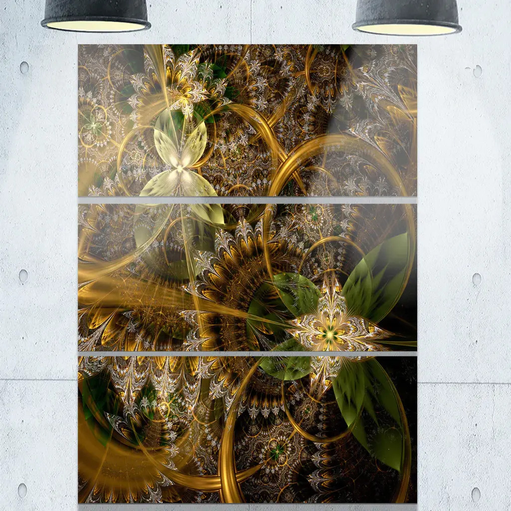 "Green Gold Digital Art Fractal Flower" Metal Wall Art, 3 Panels, 28"x36"