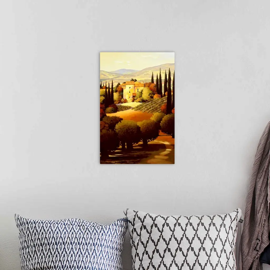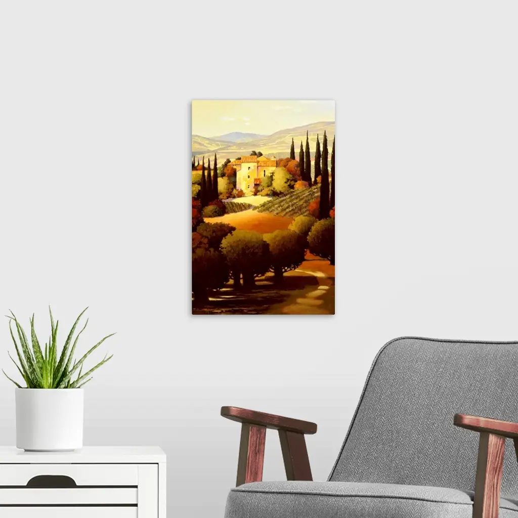 Contemporary painting of a house with circular and pointy trees with hills in the background.
