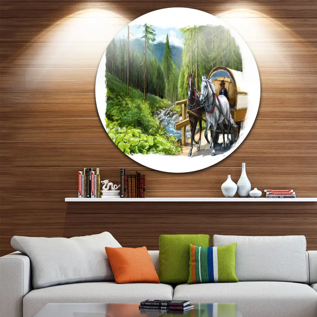 Green Landscape With Horse, Digital Art Disc Metal Artwork, 11"
