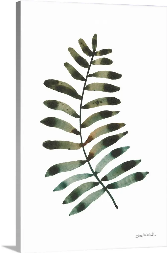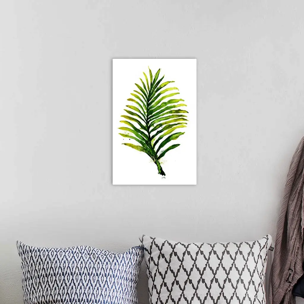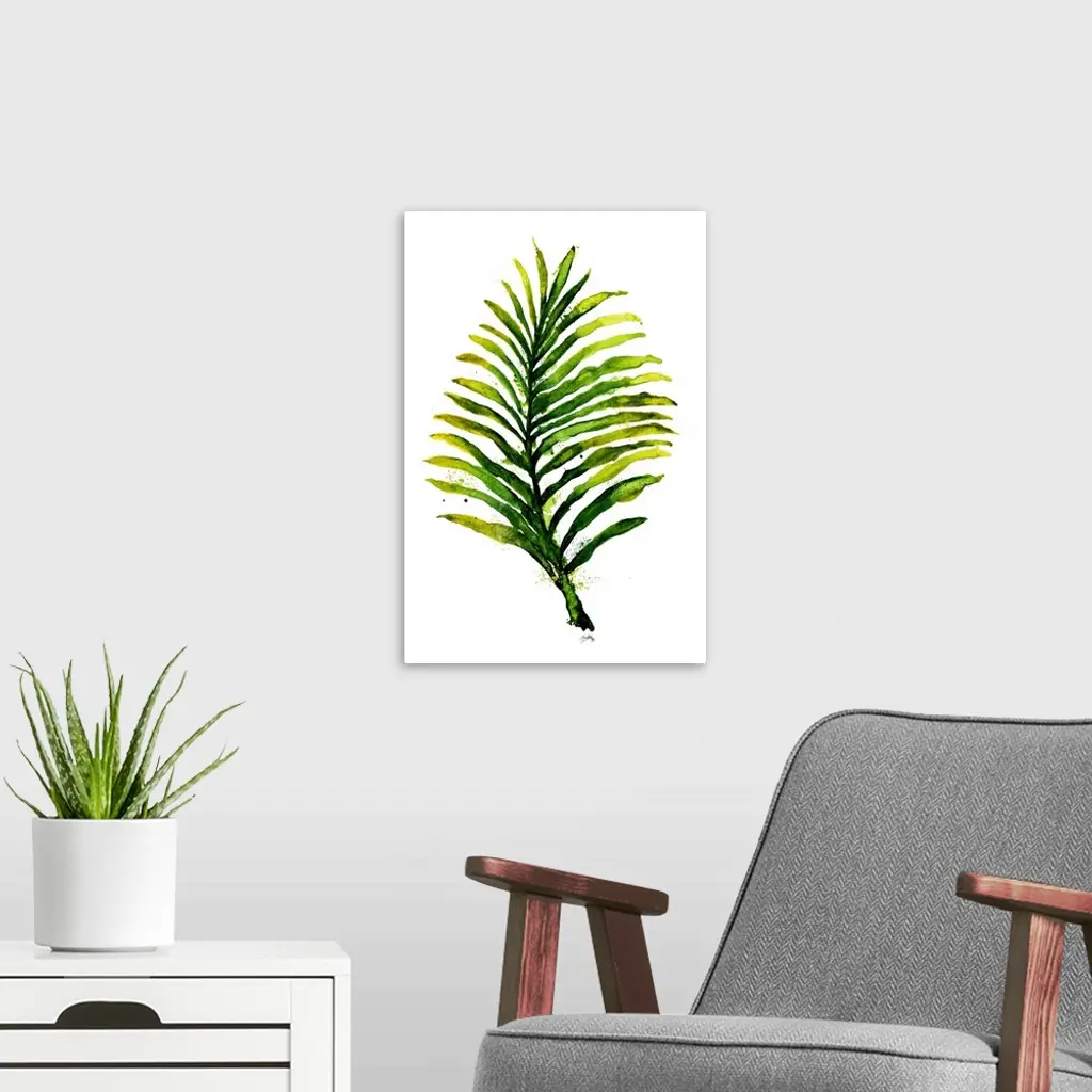 Contemporary painting of a palm leaf in shades of green on a solid white background.