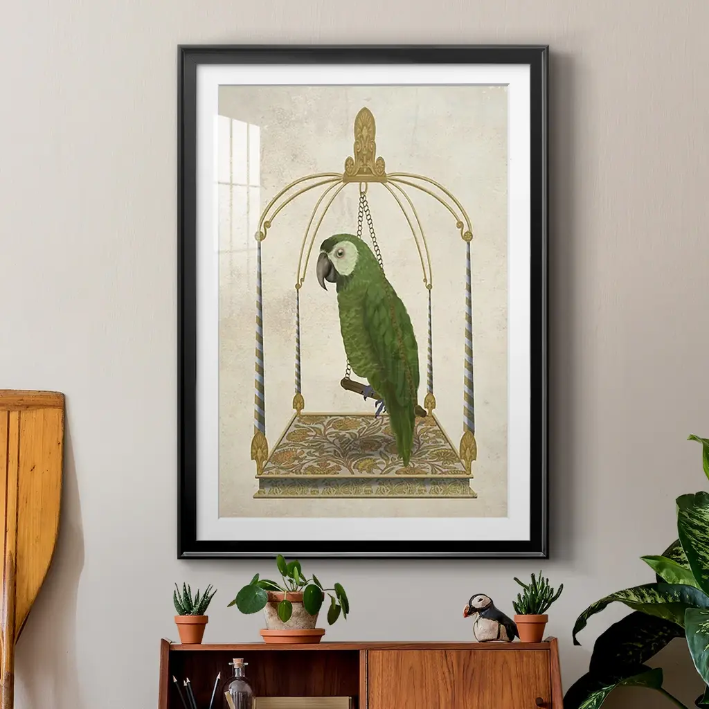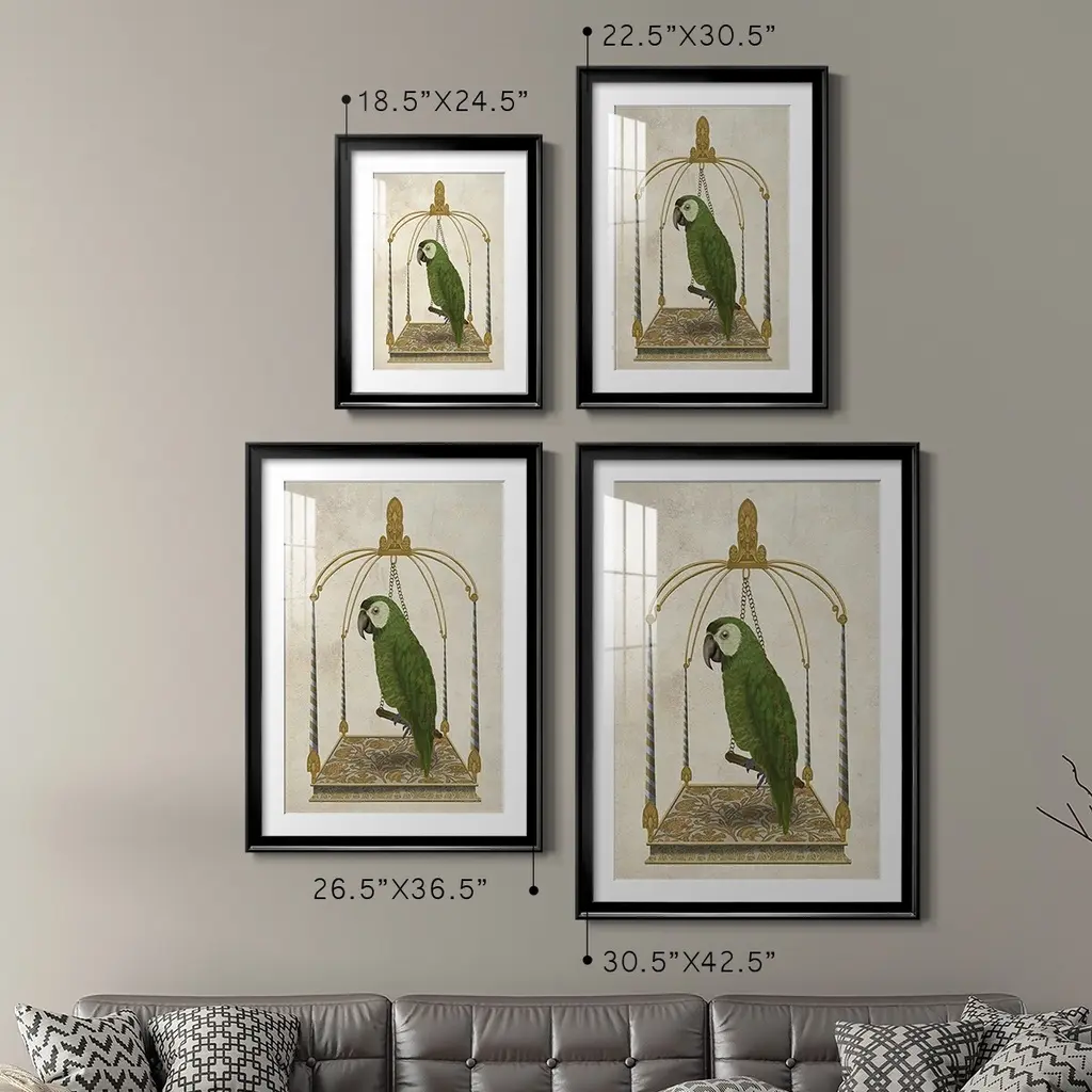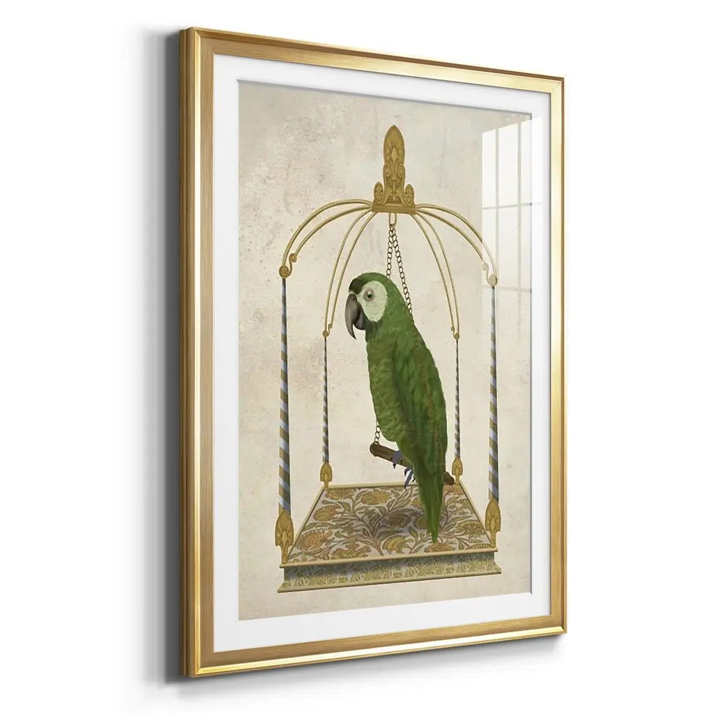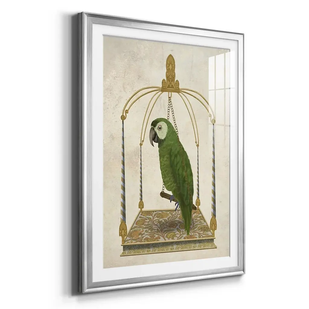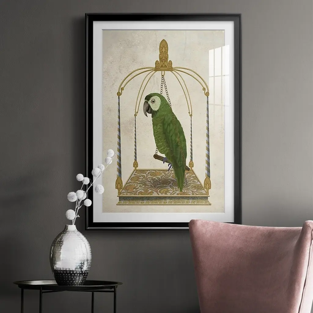 Green Parrot on Swing Premium Framed Print - Ready to Hang A Premium Framed Print created to last. Framed in distressed wood and available in an array of sizes and colors Featuring a beveled a solid wood stretcher bar, each piece comes ready to hand 4 SIZES AVAILABLE 30.5''X42.5'' - Overall Size 26.5'X36.5'' - Overall Size 22.5''x30.5'' - Overall Size 18.5''x24.5'' - Overall Size Each piece is made to order. Each piece comes with hanging hardware. Made in the USA Ready to Hang Giclee Paper Print Acrylic Glass Beveled Matt Board