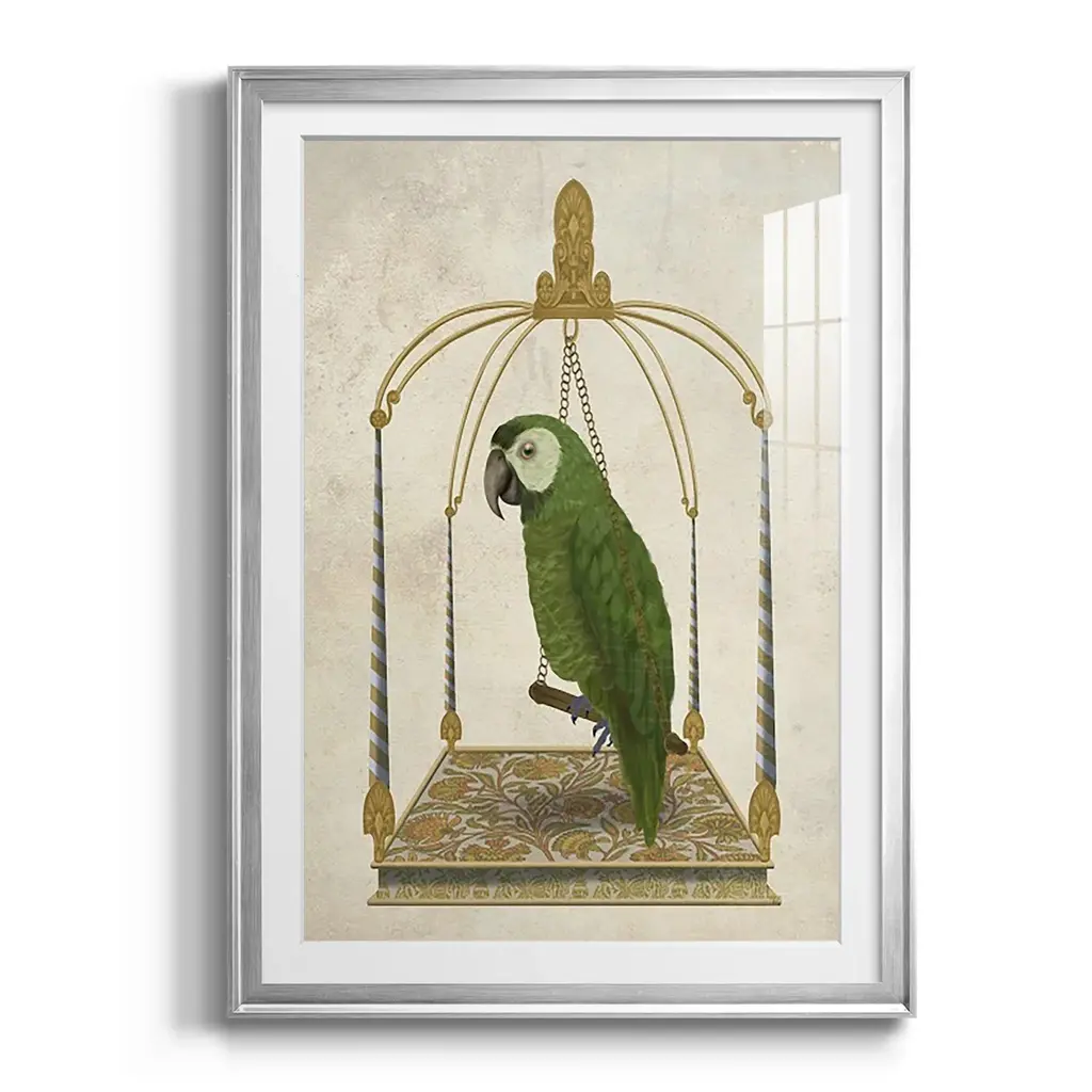 Green Parrot On Swing Premium Framed Print - Ready To Hang - 30.5x42.5 - Silver
