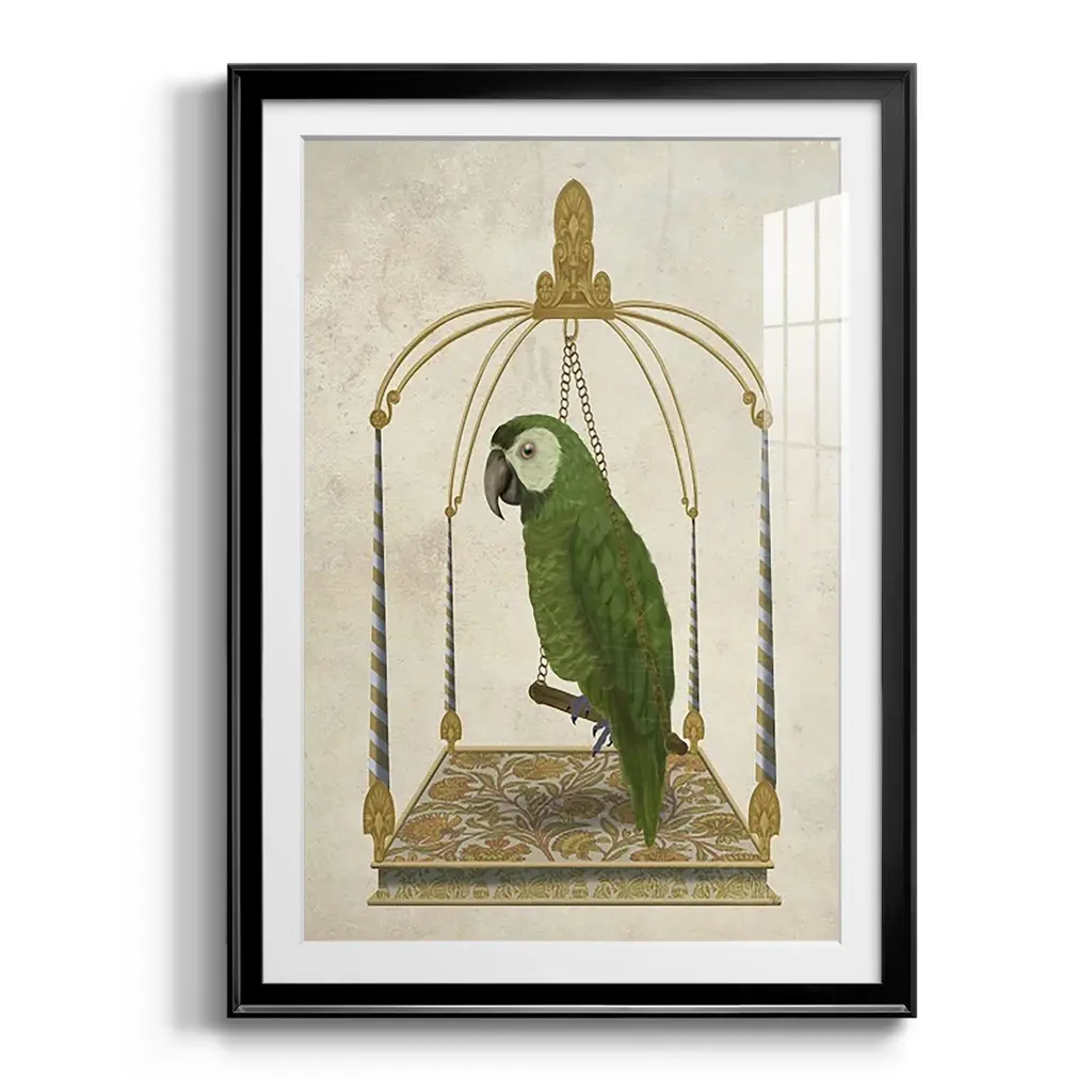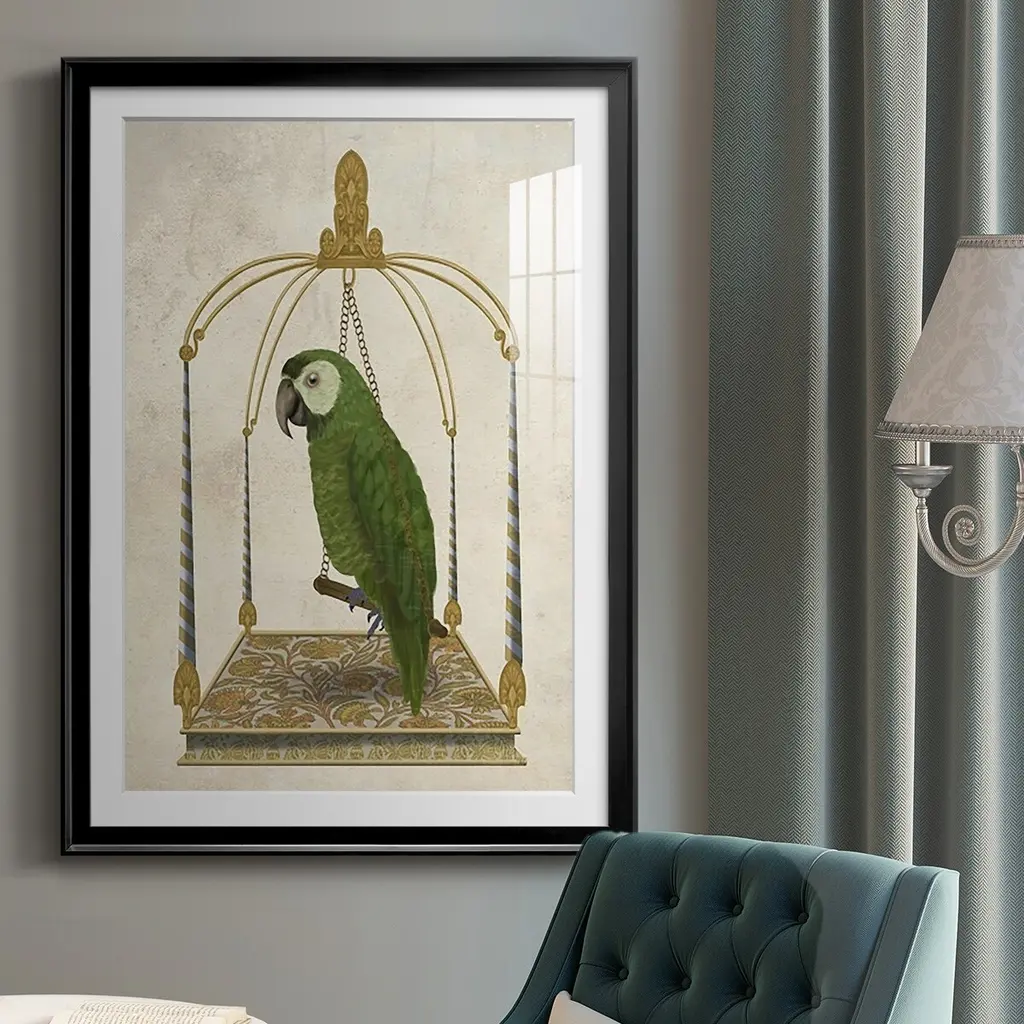 Green Parrot on Swing Premium Framed Print - Ready to Hang A Premium Framed Print created to last. Framed in distressed wood and available in an array of sizes and colors Featuring a beveled a solid wood stretcher bar, each piece comes ready to hand 4 SIZES AVAILABLE 30.5''X42.5'' - Overall Size 26.5'X36.5'' - Overall Size 22.5''x30.5'' - Overall Size 18.5''x24.5'' - Overall Size Each piece is made to order. Each piece comes with hanging hardware. Made in the USA Ready to Hang Giclee Paper Print Acrylic Glass Beveled Matt Board