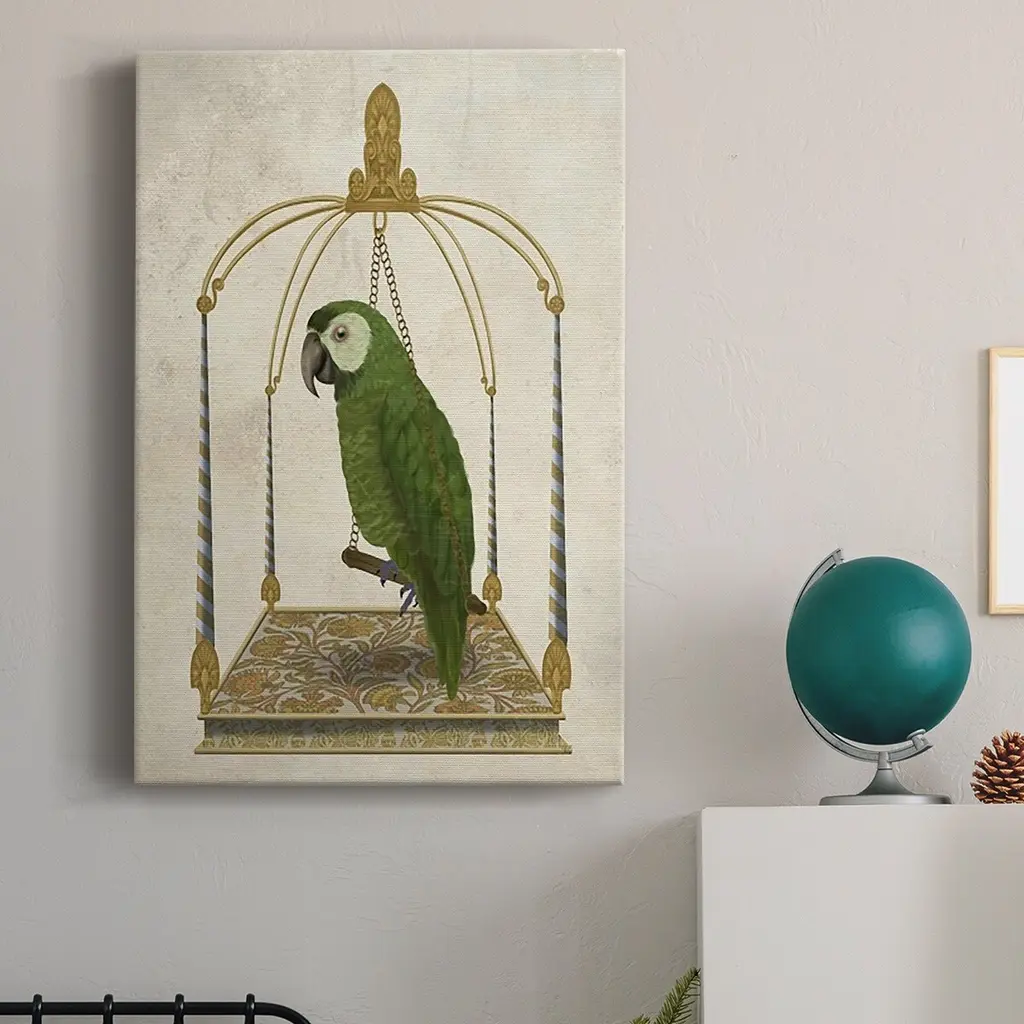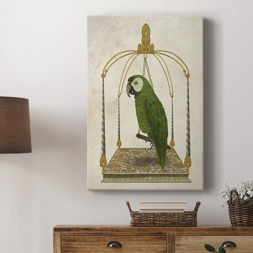 Green Parrot on Swing Premium Gallery Wrapped Canvas - Ready to Hang A premium hand stretched gallery wrapped canvas print created to last. Featuring a beveled a solid wood stretcher bar, each piece comes ready to hand 6 SIZES AVAILABLE 8''X12'' - Overall Size 12''X18'' - Overall Size 18''X27'' - Overall Size 24''x36'' - Overall Size 32''x48'' - Overall Size 40''x60'' - Overall Size Each piece is made to order. Built to Last Each piece comes ready to hang Solid wood stretcher Fade and Water resistant Made domestically