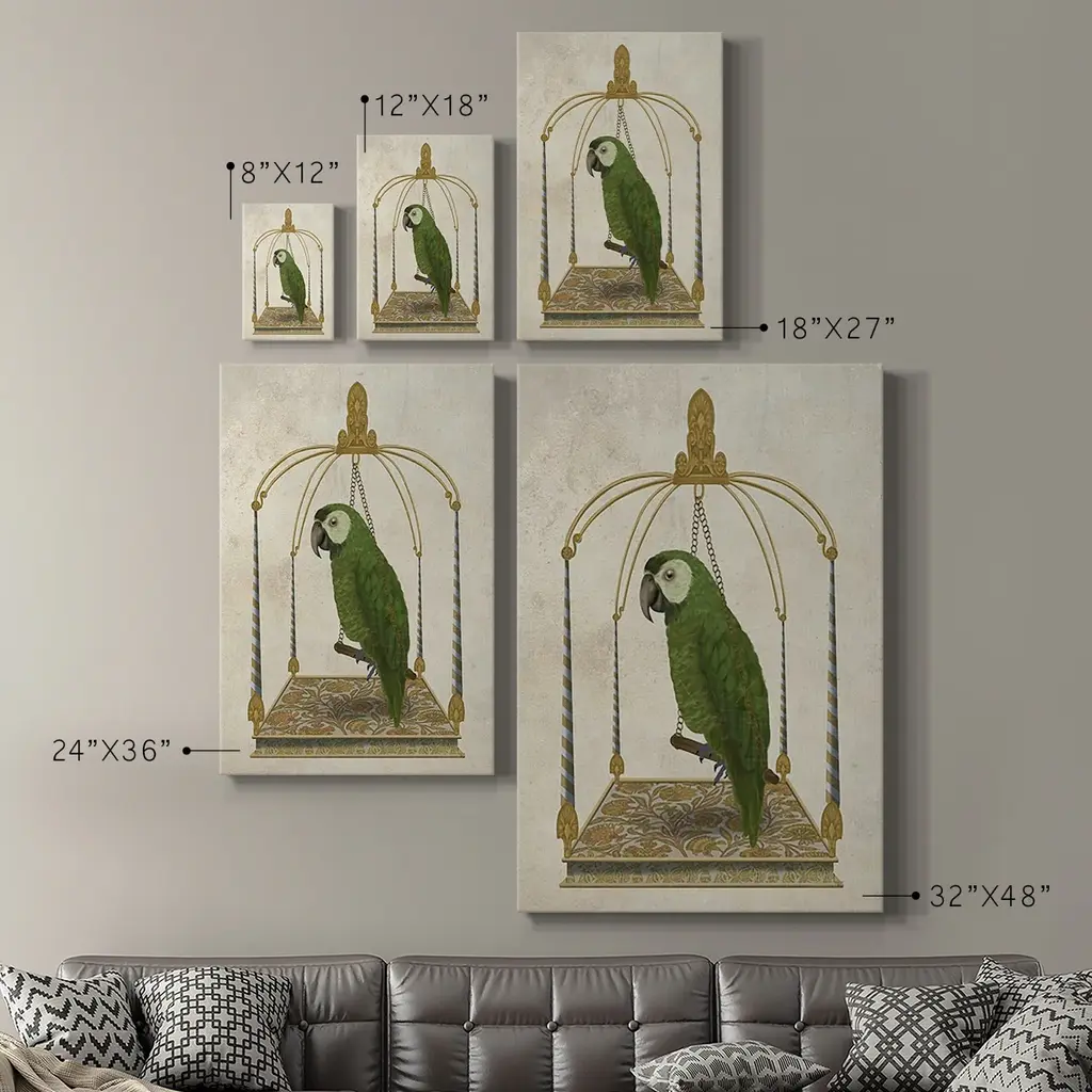Green Parrot on Swing Premium Gallery Wrapped Canvas - Ready to Hang A premium hand stretched gallery wrapped canvas print created to last. Featuring a beveled a solid wood stretcher bar, each piece comes ready to hand 6 SIZES AVAILABLE 8''X12'' - Overall Size 12''X18'' - Overall Size 18''X27'' - Overall Size 24''x36'' - Overall Size 32''x48'' - Overall Size 40''x60'' - Overall Size Each piece is made to order. Built to Last Each piece comes ready to hang Solid wood stretcher Fade and Water resistant Made domestically