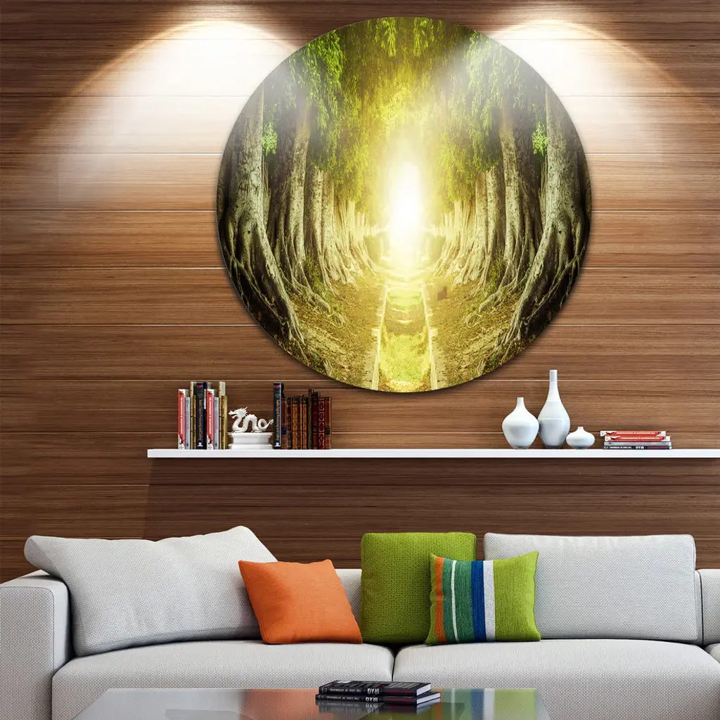 Bring Contemporary Abstraction to your home with this large Circle Metal wall art. This Green Tree Tunnel Metal Artwork makes it the focal point of any room or office. - White Gloss Coating ensures colors are extra vibrant with light reflection.- Aluminum grade Sheet Metal with 1 inch mounting frame on the back giving the illusion that the artwork is floating on the wall..- Mounting Brackets are included along with instructions.- High Quality Digital images are created directly into a glossy aluminum panel producing a stunning and captivating print into the glossy finish of the metal.- Water, Fire and Scratch resistant HD Aluminum panels.- Looks better than any photo paper and guaranteed to last at least 20 years- Easy to clean with a microfiber cloth. Colors are far superior to regular Canvas Art. - Easy to Hang
