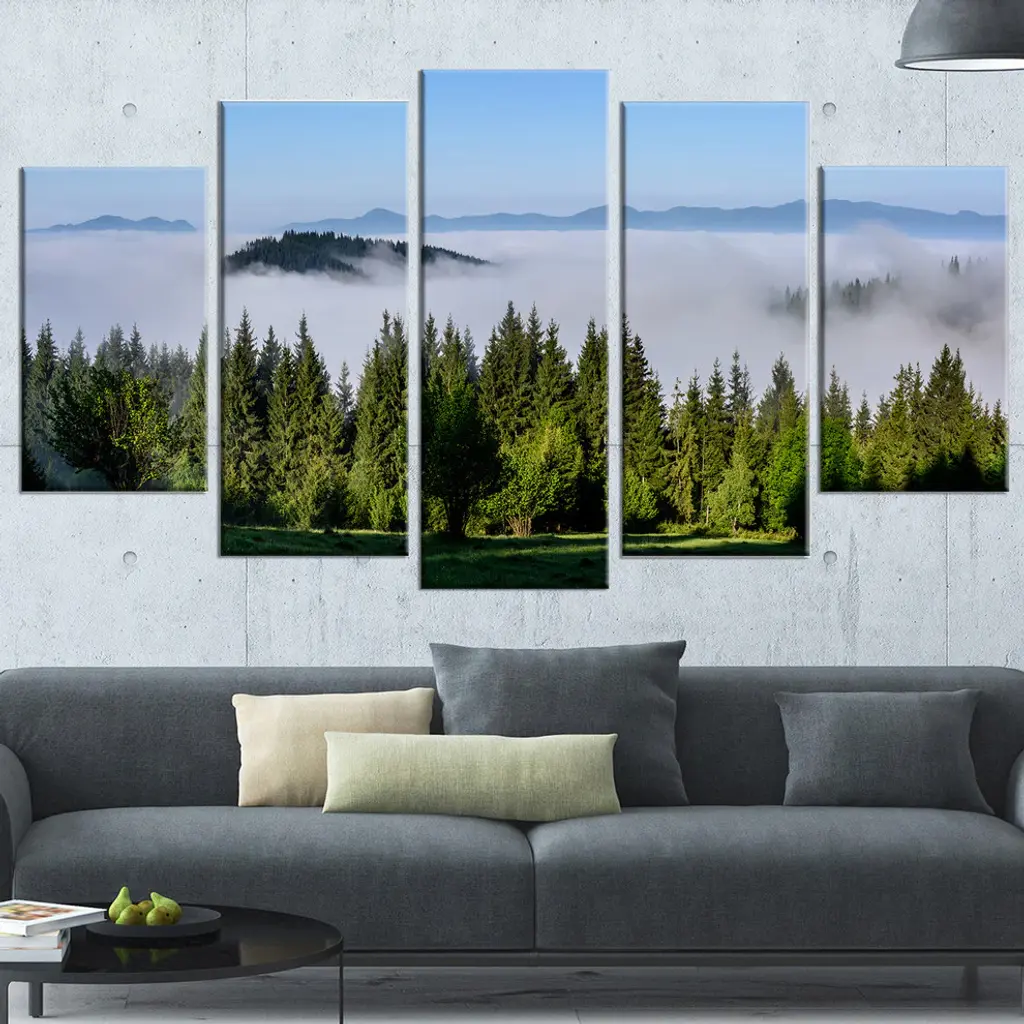 "Green Trees And Fog Over Mountains" Landscape Wall Artwork, 5 Panels