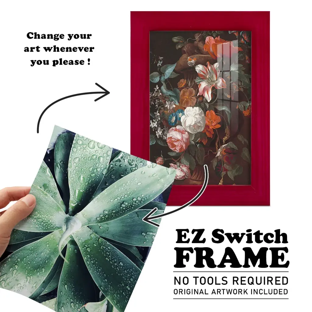 Green Tropical Succulent III -EZ SWITCH Framed Print w/glass-Cherry Red A delightful, framed print. Featuring a solid wood frame with real wood glass. This premium print is giclee quality. In addition, every frame features a removable back and table top stand. This allows you to change your art in the future or to just stand the art on a table for a new look. We are sure you'll enjoy our new series of EZ SWITCH Framed Art. Solid Wood Frame Real Glass Removable / Replaceable Art Built in Tabletop Stand Sizes range from 4x6 up to 12x15 - buy just one or pair them up as sets as you see fit.