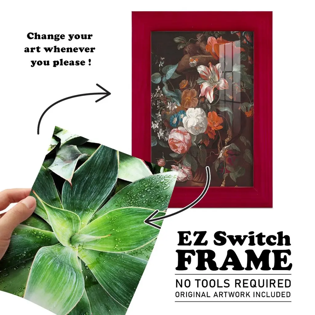 Green Tropical Succulent IV -EZ SWITCH Framed Print w/glass-Cherry Red A delightful, framed print. Featuring a solid wood frame with real wood glass. This premium print is giclee quality. In addition, every frame features a removable back and table top stand. This allows you to change your art in the future or to just stand the art on a table for a new look. We are sure you'll enjoy our new series of EZ SWITCH Framed Art. Solid Wood Frame Real Glass Removable / Replaceable Art Built in Tabletop Stand Sizes range from 4x6 up to 12x15 - buy just one or pair them up as sets as you see fit.
