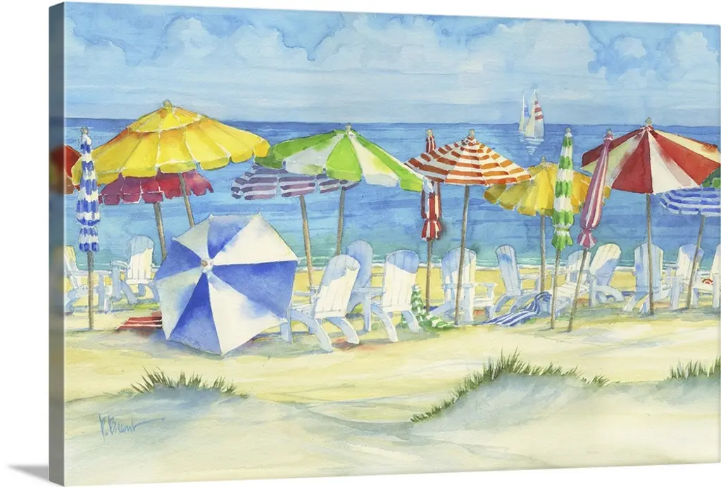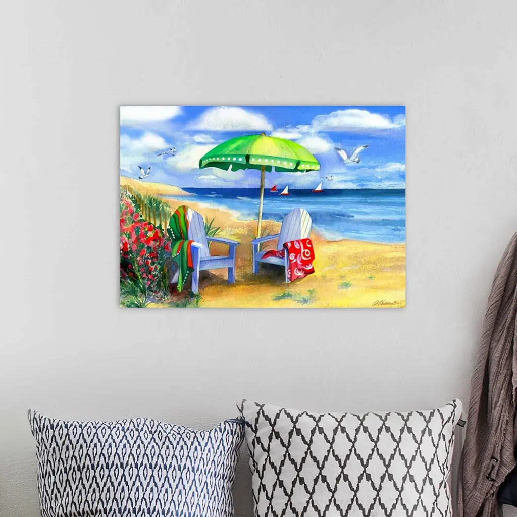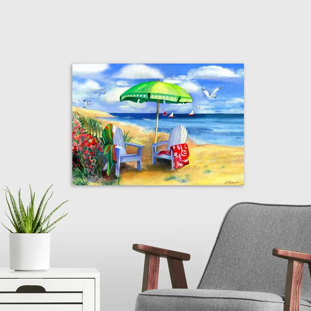 Decorative artwork of two beach chairs sitting on the sand with towels draped over them and an umbrella in between them. Seagulls are shown flying above the water that has 3 sailboats in the distance.