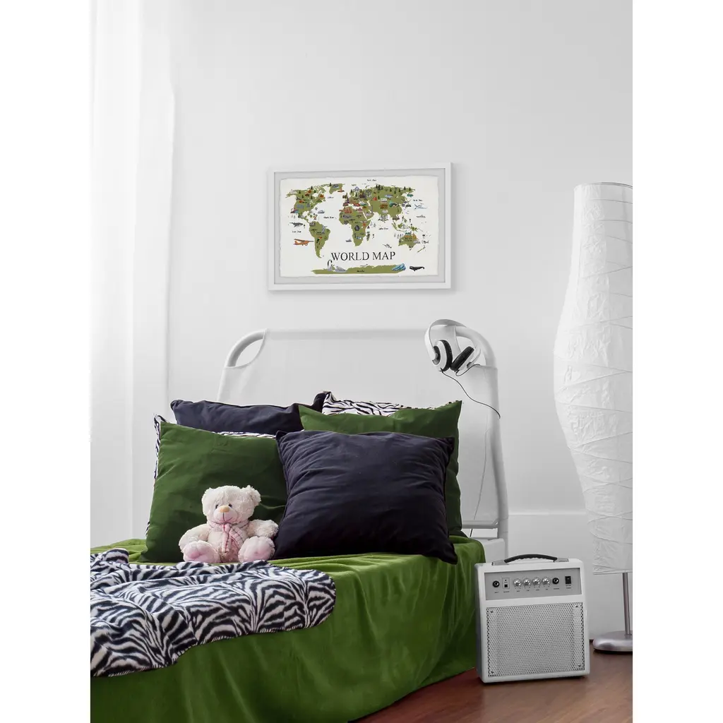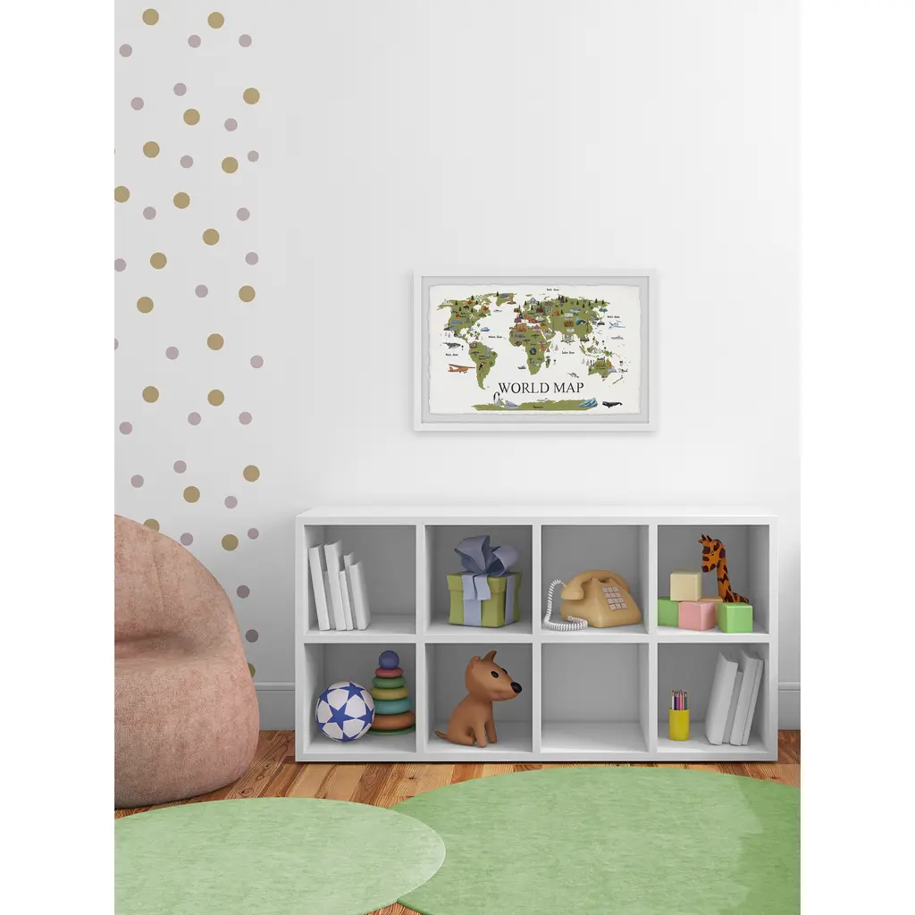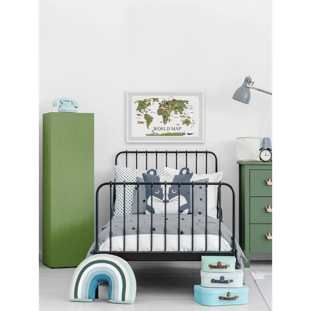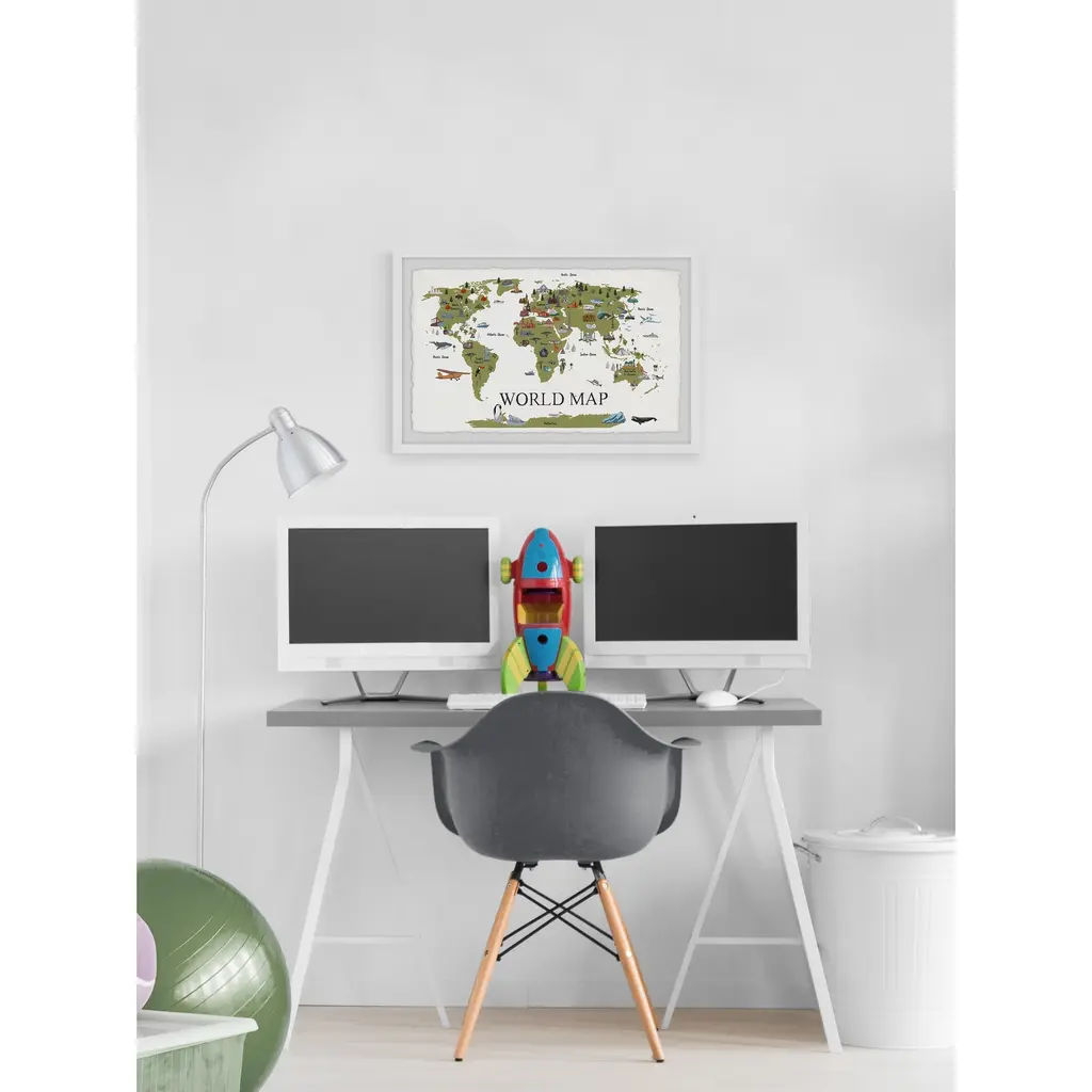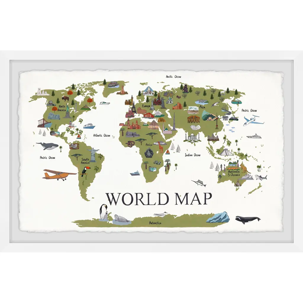 See the international symbols of the world from your living room in this grassy green map of where to find them. This beautifully detailed piece shows you monuments, landmarks, and wildlife across the planet and even includes the residents of the vast ocean. Proudly printed in the USA, this piece is printed on high quality archive paper and professionally hand-framed. With wall-mounting hooks included, this artful accent is ready to hang up as soon as it reaches your front door. • Top quality Giclee print on high resolution Archive Paper • Hand cut deckled edges • High quality durable non-warping frame • Finished under shatter resistant plexiglass • Arrives ready to hang • Includes a certificate of authenticity • Printed in the USA