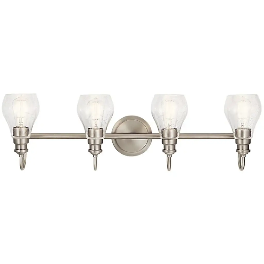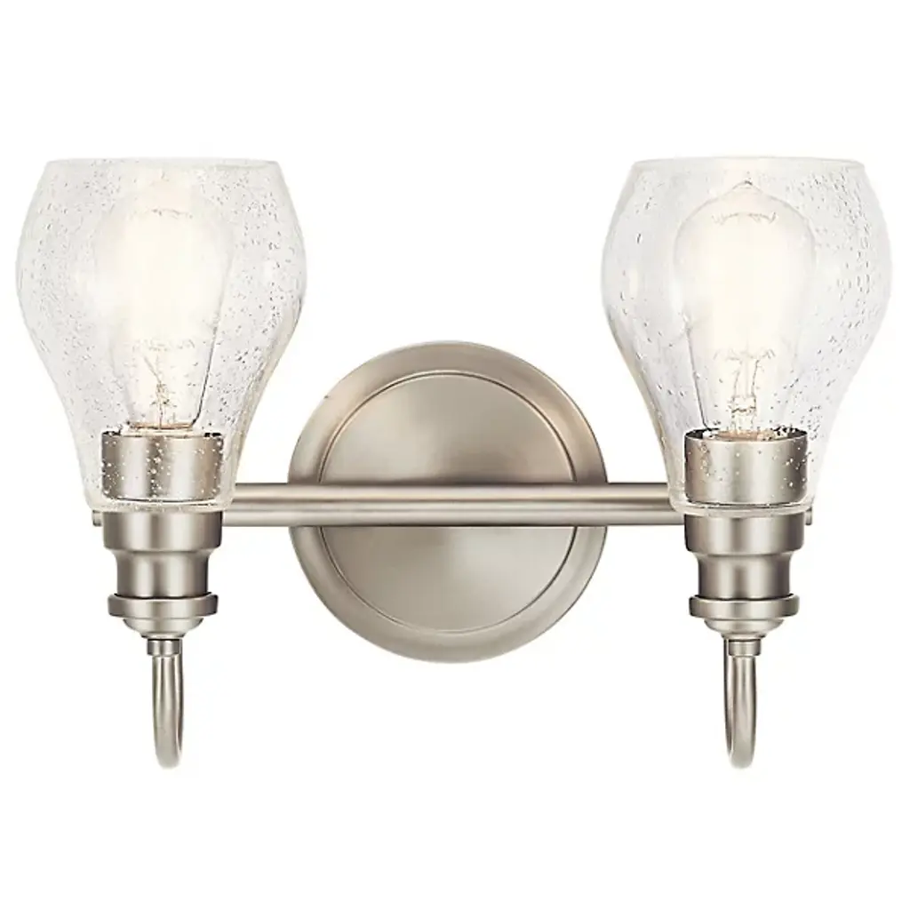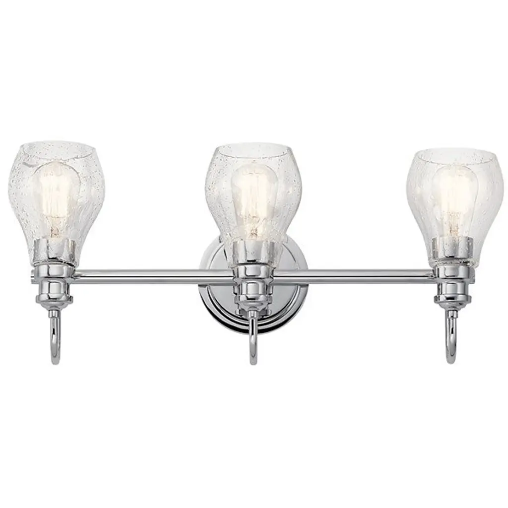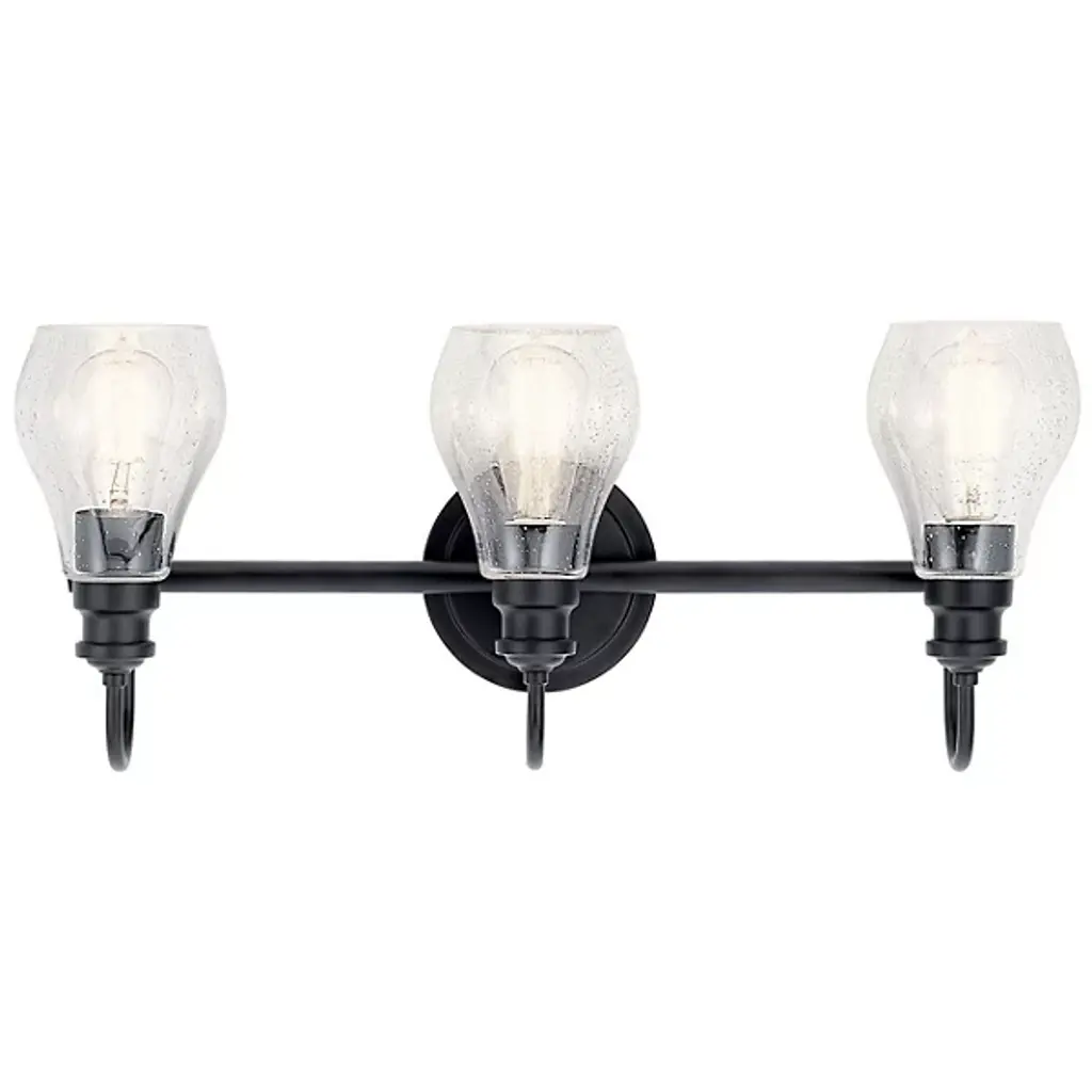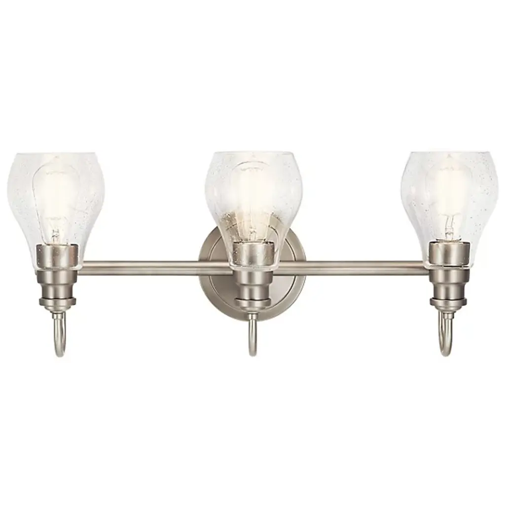 Update your home’s bathroom or vanity space with the antique charm of the Greenbrier Vanity Light by Kichler. A circular stepped backplate secures the piece in place and holds a slender horizontal bar. Short arms drop from below the bar to rise and hold teardrop-shaped shades crafted from clear seeded glass. Its incandescent light glistens delicately through the glass as it fills the space with a practical and pleasant ambient illumination.