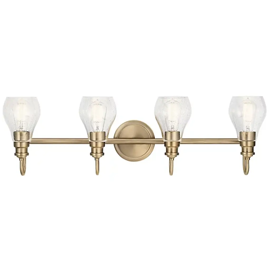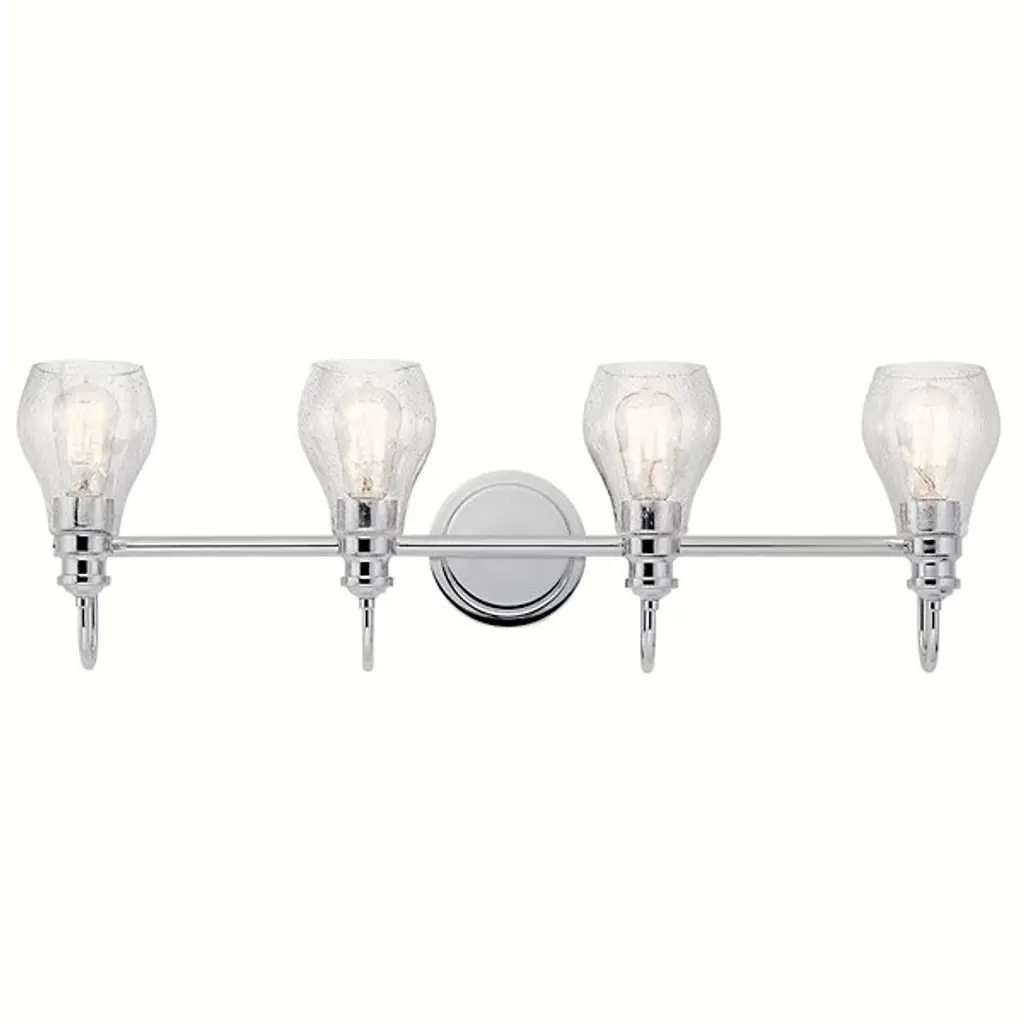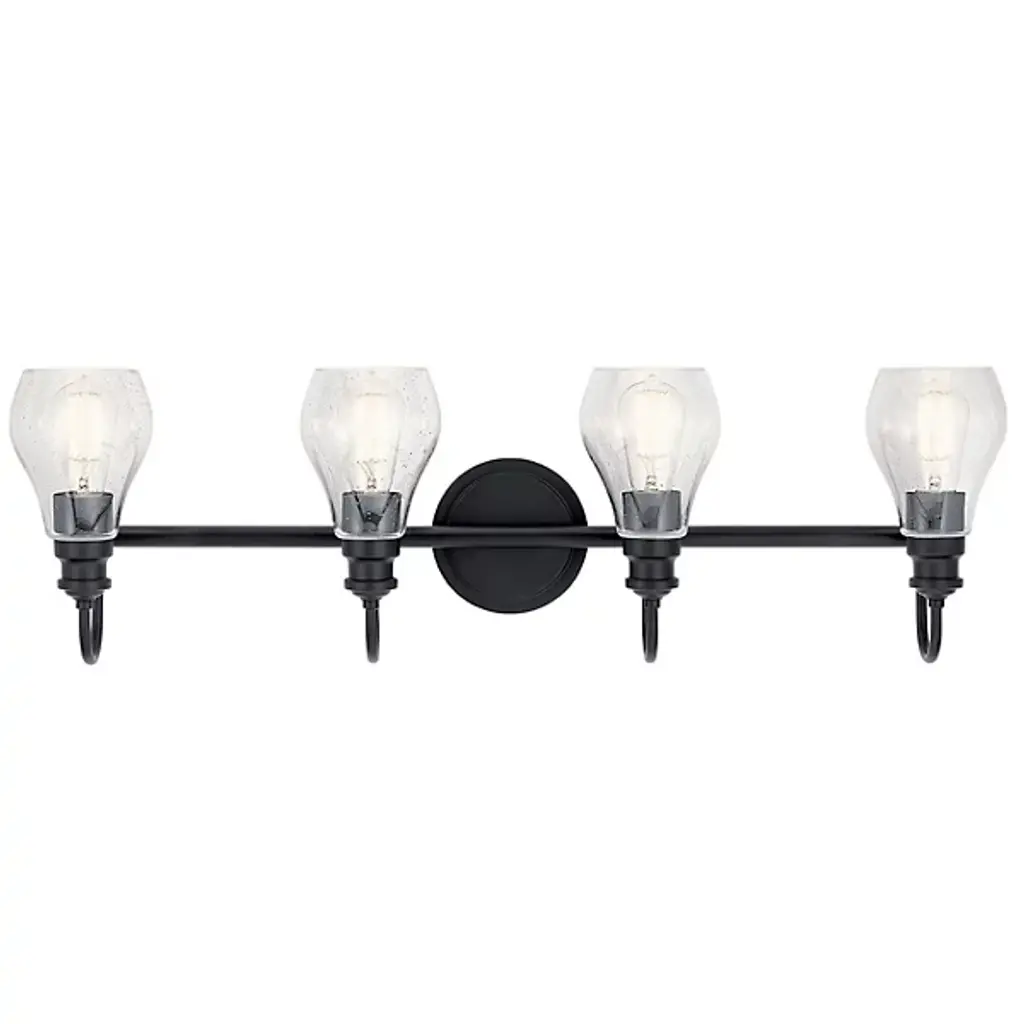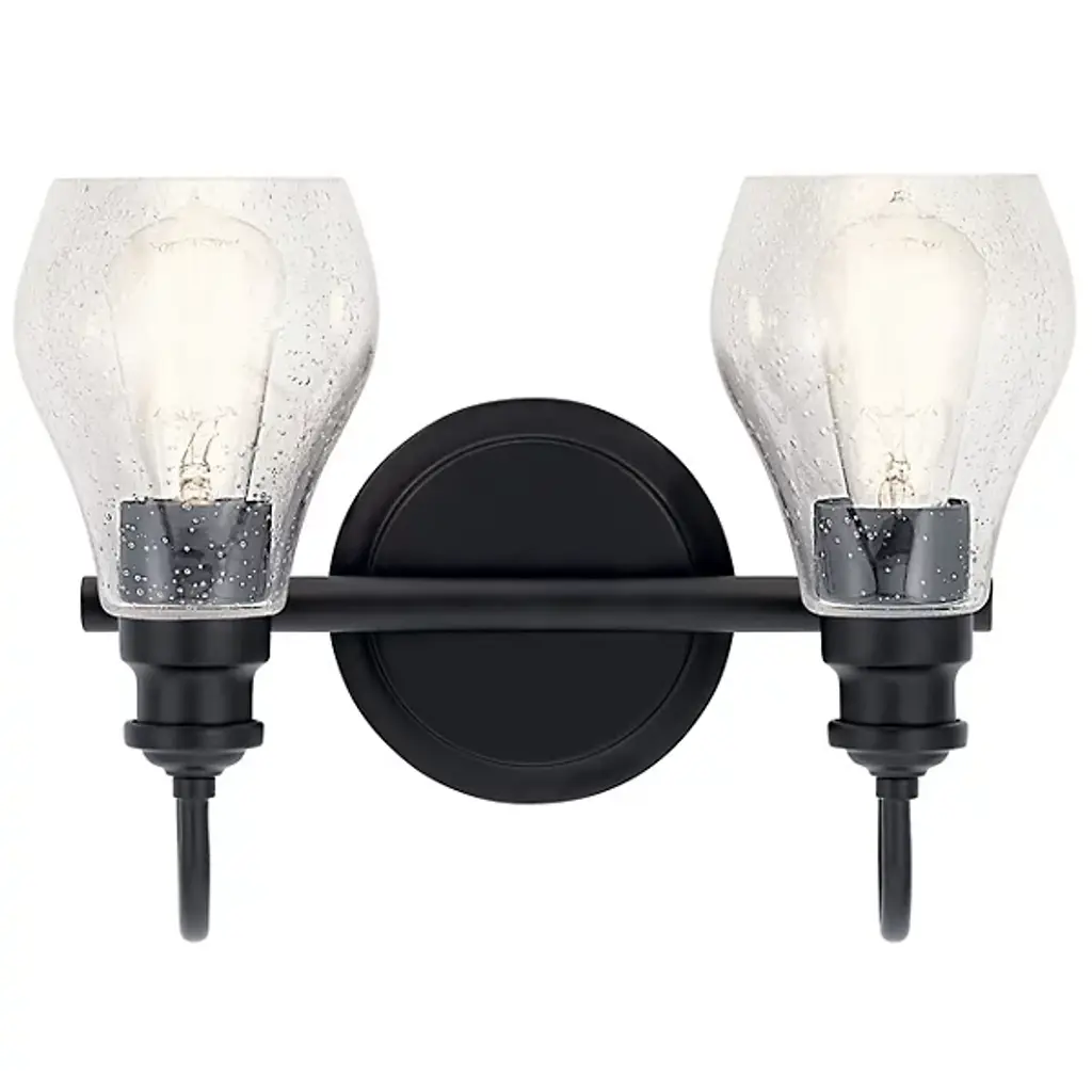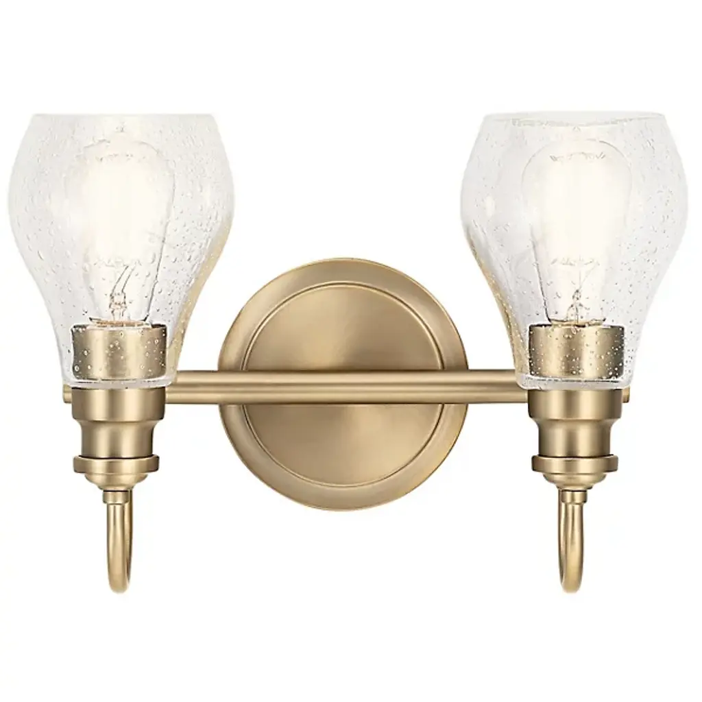 Update your home’s bathroom or vanity space with the antique charm of the Greenbrier Vanity Light by Kichler. A circular stepped backplate secures the piece in place and holds a slender horizontal bar. Short arms drop from below the bar to rise and hold teardrop-shaped shades crafted from clear seeded glass. Its incandescent light glistens delicately through the glass as it fills the space with a practical and pleasant ambient illumination.