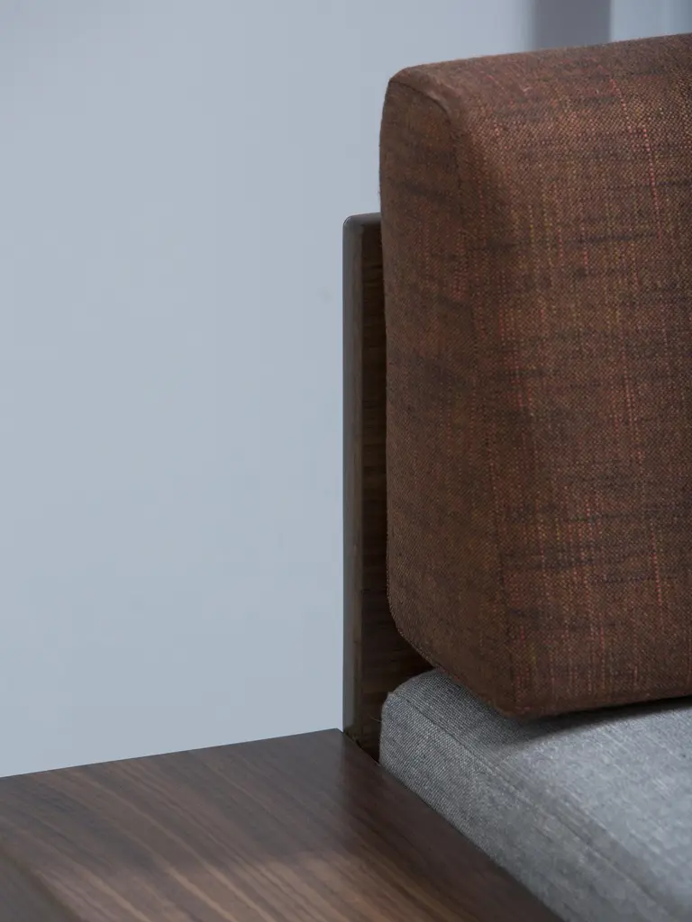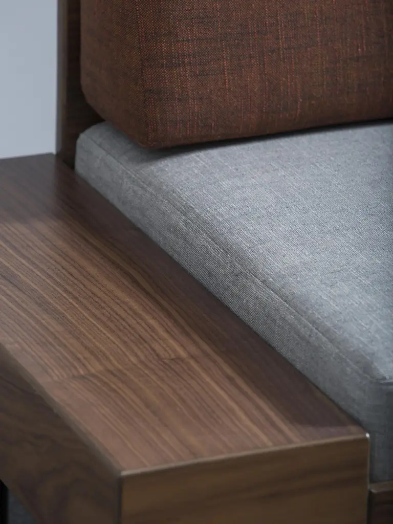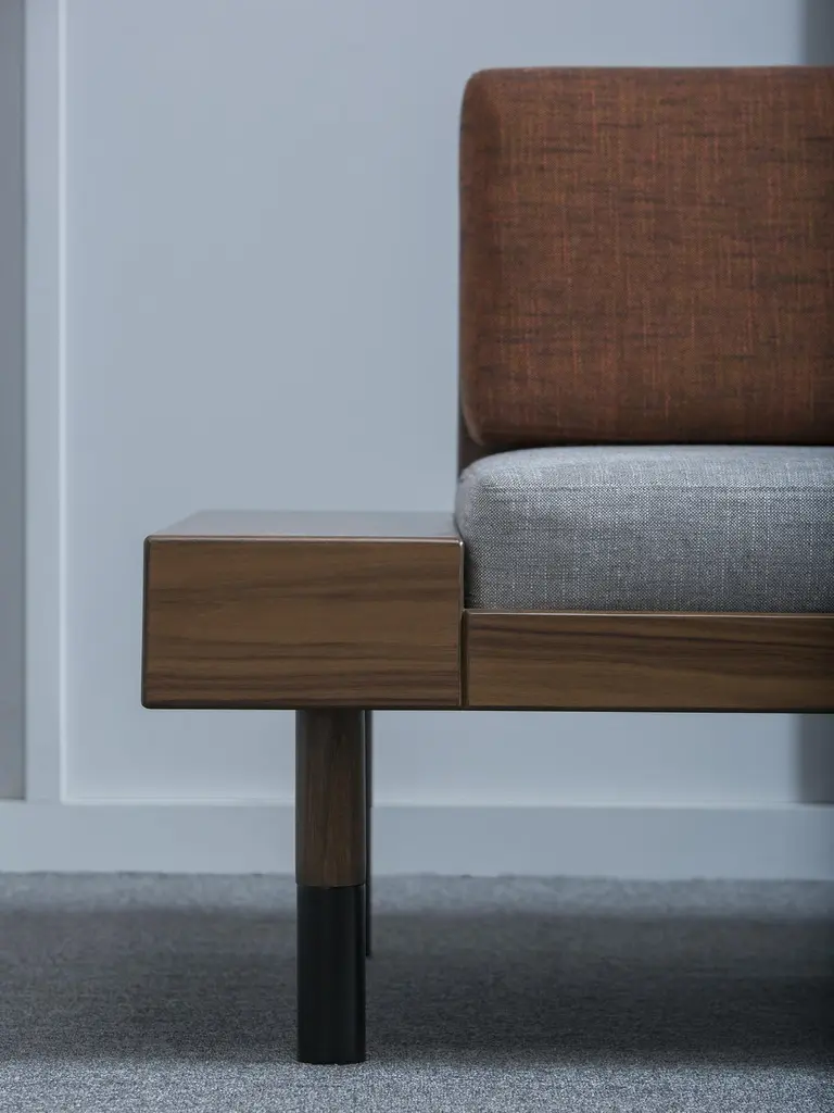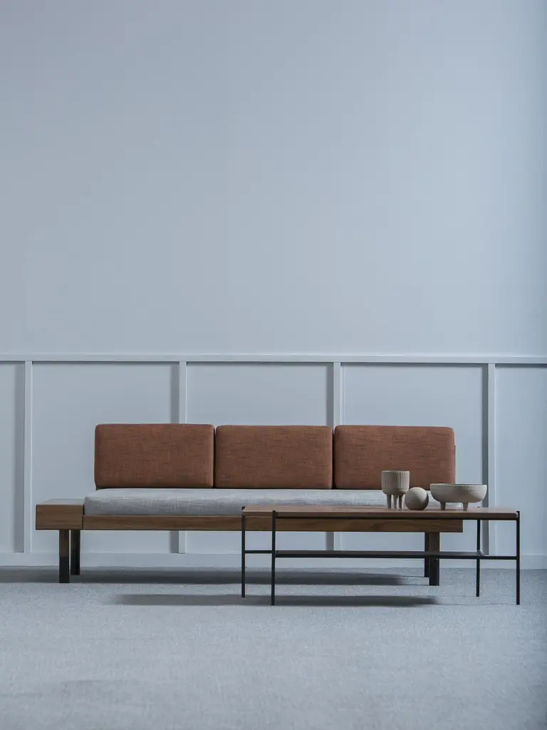 Grey and Brick Red Mid Sofa by Kann DesignDimensions: D 70 x W 200 x H 74 cm.Materials: Solid wood, steel, wood veneer, HR foam, fabric upholstery - seating: Sahco Ellis 4- back: Sahco Ellis 18 (70% viscose, 30 % linen).Available in other fabrics.Designed by Meghedi Simonian, the lines of the Mid straight sofa are straight and clear. Itsparticularity is the walnut seat that extends to one of its ends, perfect to set a lamp, a book, or perhaps a vase on... Highly customizable, the design of the daybed offers a broad choice of woolen fabric.Founded in 2010, Kann Design is a furniture-making brand that brings together the know-how of the Kanaan workshop and the talents of independent designers. Kann’s adventure is above all a family story: what distinguishes it from the rest is the skilled work of the craftsmen of Kanaan, a collective founded in 1958 in Beit Chabab, Lebanon, by the father of Houssam, the founder of Kann Design, himself a cabinetmaker.Since its creation, the studio has shown and gained great skills in cabinetmaking, painting, tapestry, and welding, and since 2017, thanks to Houssam’s brother, Samer Kanaan, the workshops have been modernized and expanded to accommodate Kann’s ever-more ambitious projects, particularly customized orders for specific projects carried out in collaboration with architects.