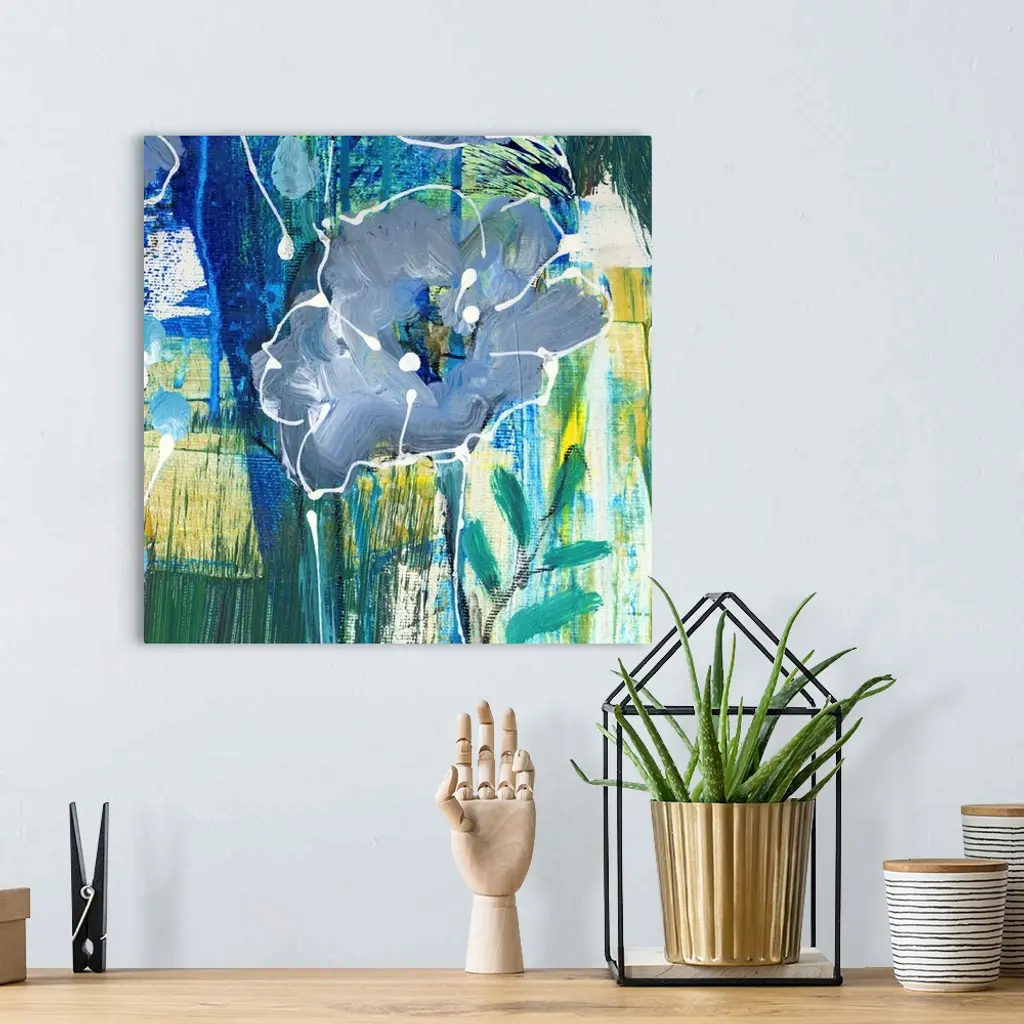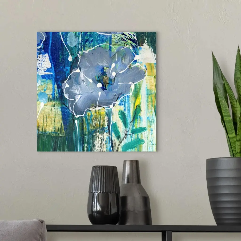 Contemporary vibrant colorful painting using green and blue tones with flowers and abstract elements.