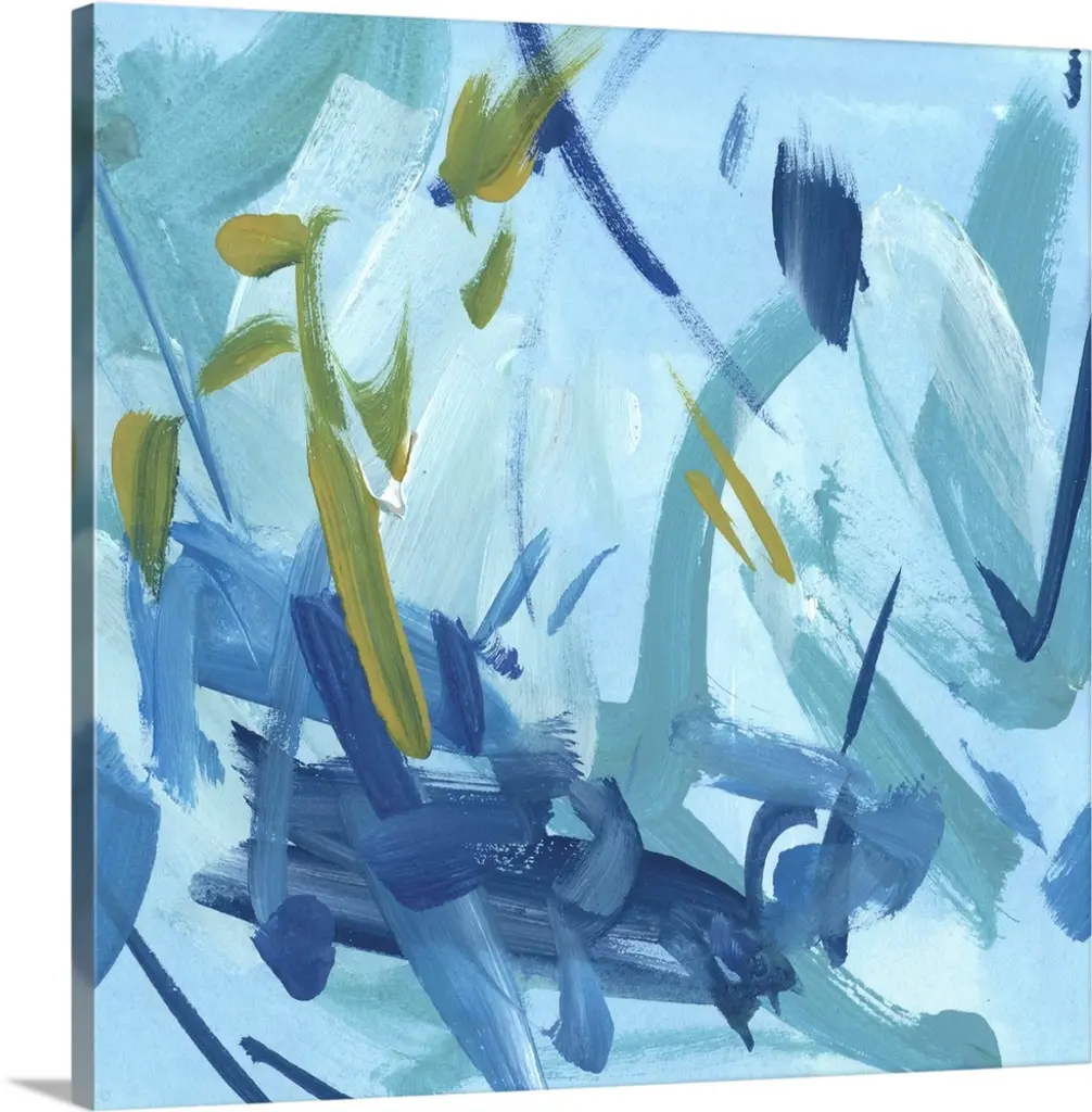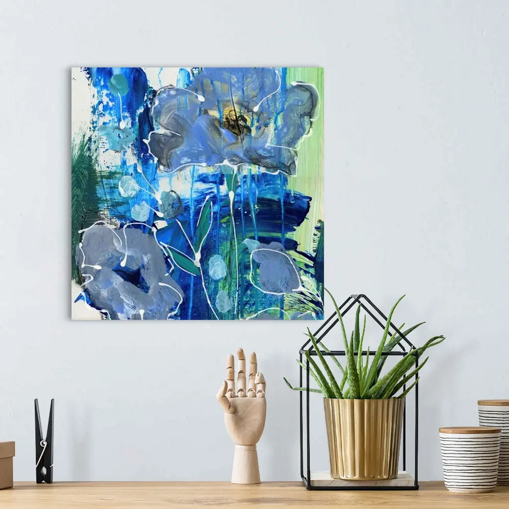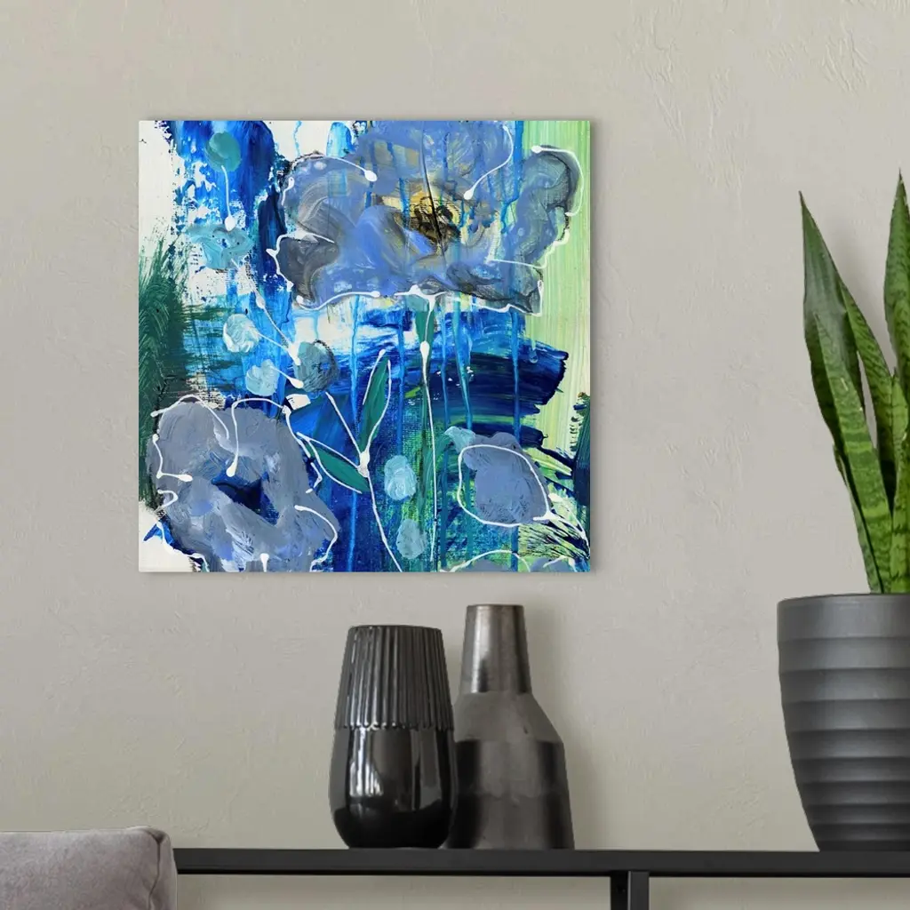 Contemporary vibrant colorful painting using green and blue tones with flowers and abstract elements.