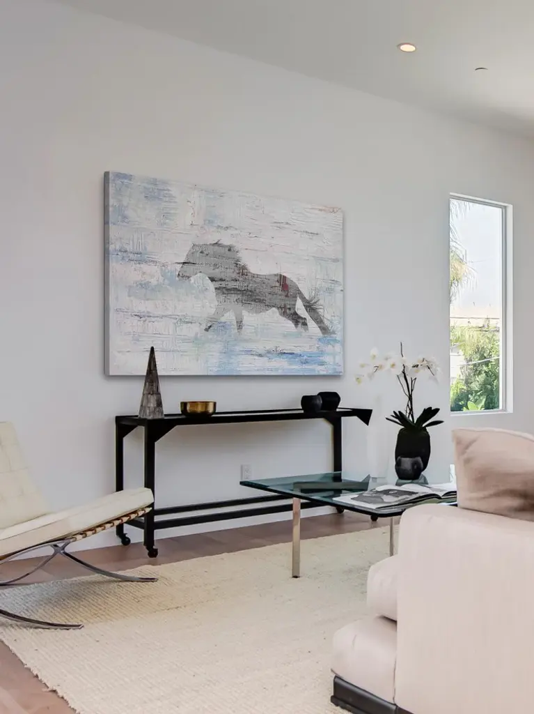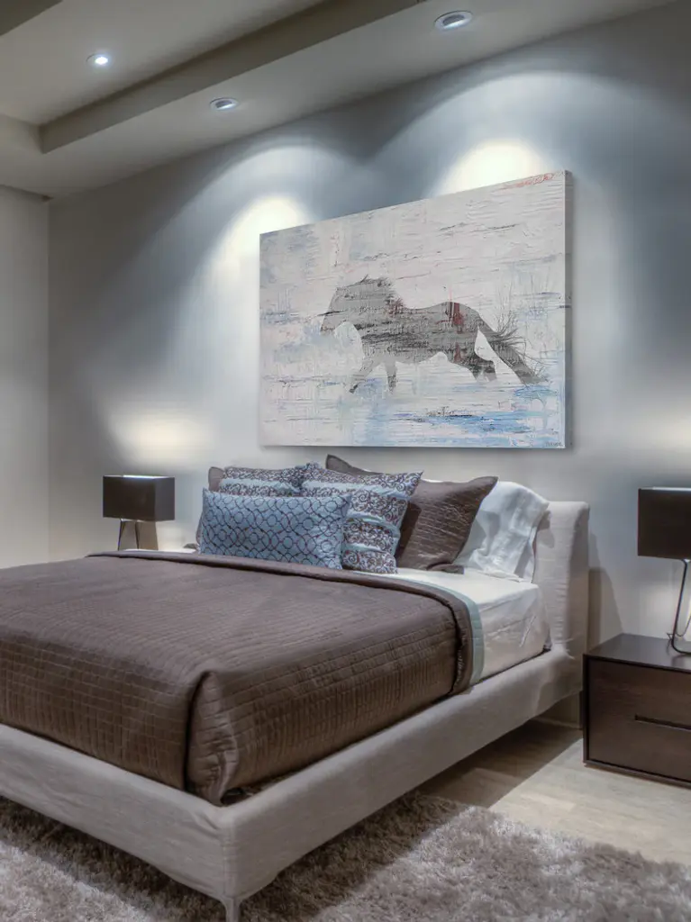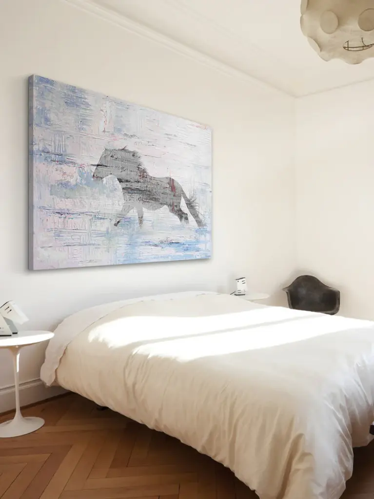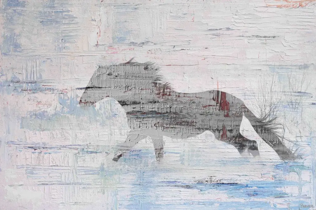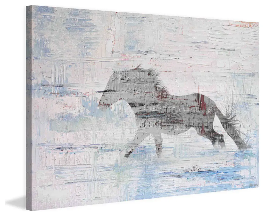 Striking and unique, the "Grey Horse Trot 2" Painting Print on Wrapped Canvas by Parvez Taj will bring your walls to life. Printed on canvas, this 36 inch wide by 24 inch tall contemporary artwork will make a statement in any living room, dining room, or bedroom.- Fine art canvas print by Parvez Taj- Professionally hand stretched- Gallery wrapped in sustainable, non-warping Wood- Arrives ready to hang- Made in the USA- Includes a certificate of authenticity- Artist signature on the front