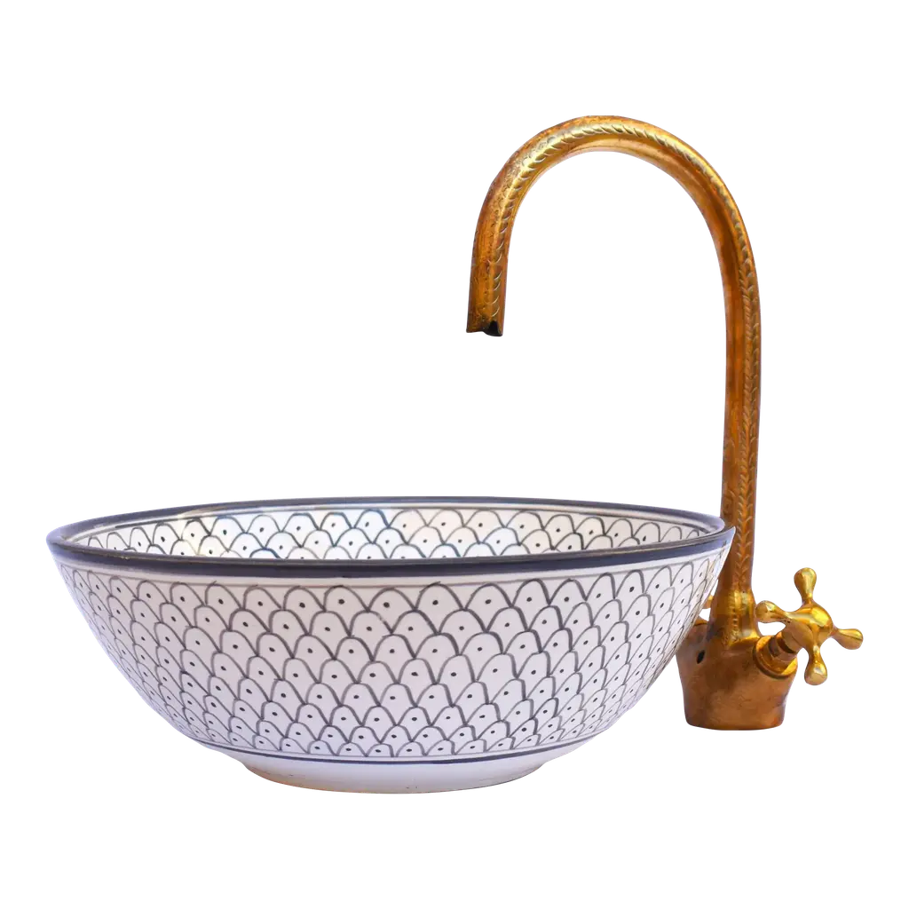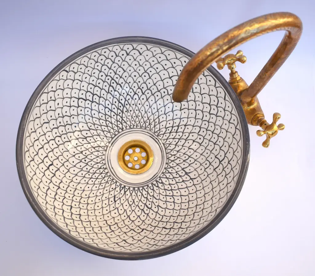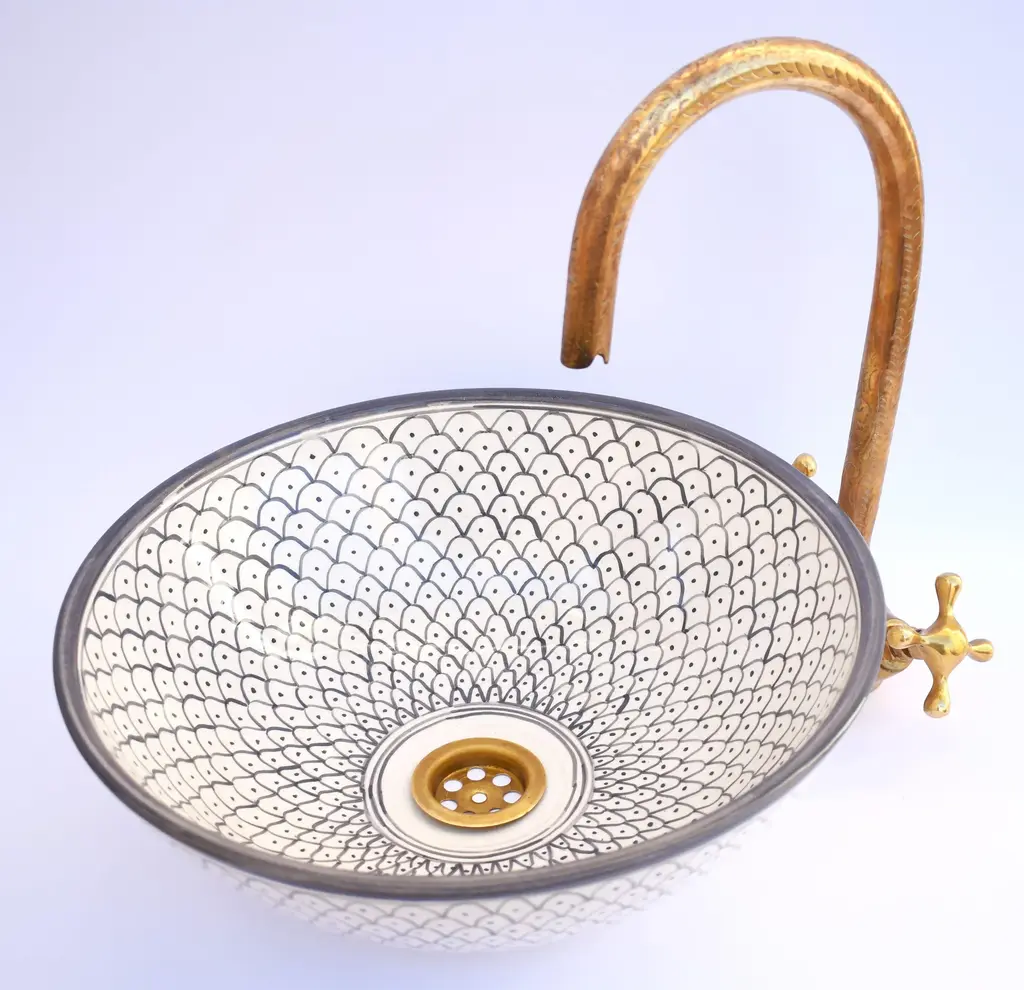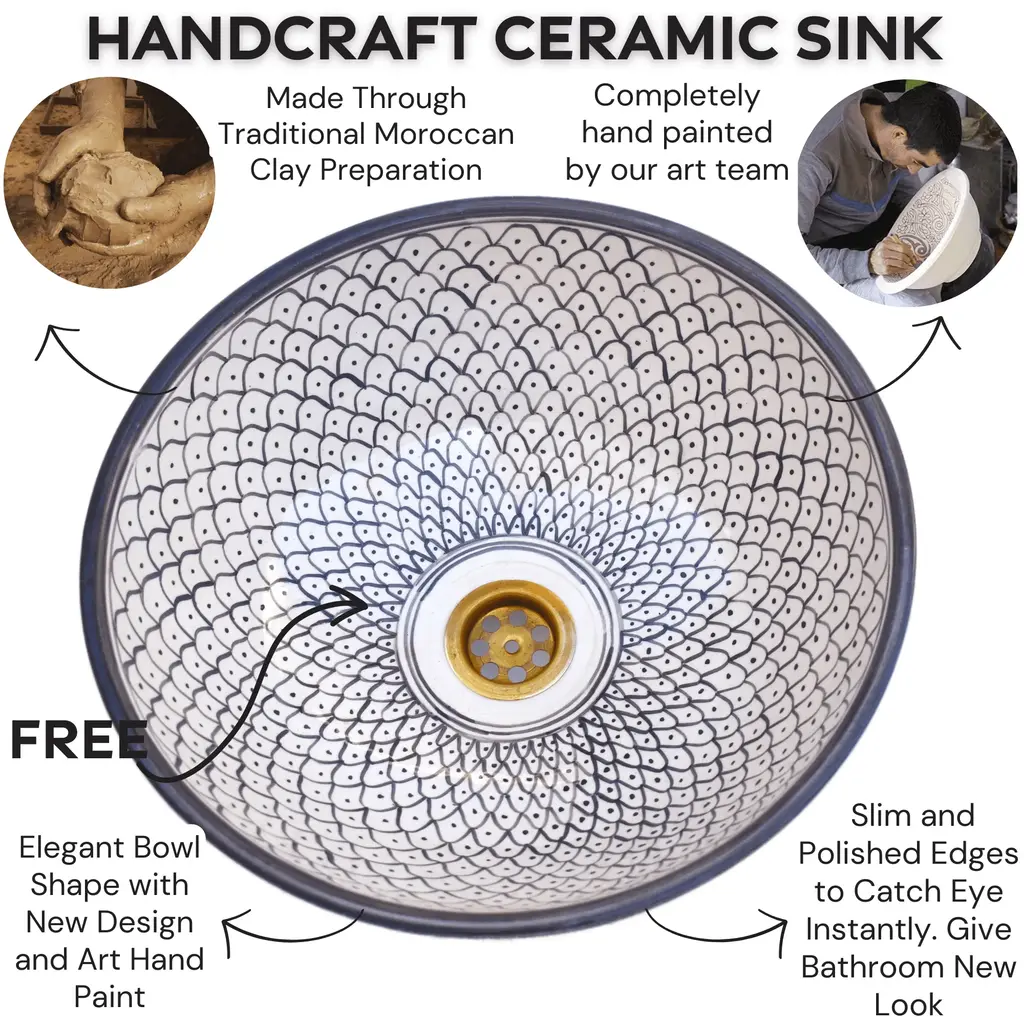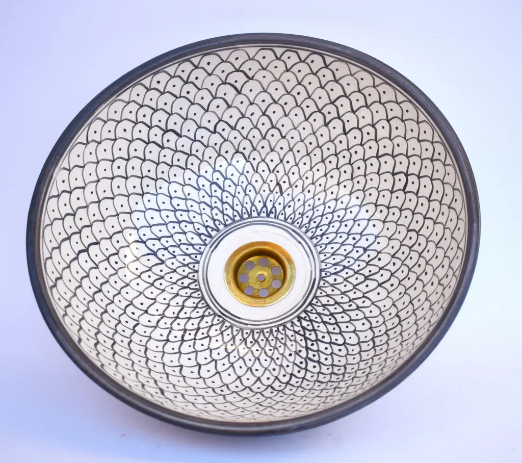 Elevate your bathroom with Stunning Grey Round Vessel Sink, a stunning piece of functional art meticulously crafted by our Moroccan artisans. This above-counter ceramic sink boasts a captivating nature fish scale motif, hand-painted by our skilled craft team, adding a touch of timeless elegance to your lavatory. Each sink is a testament to our commitment to quality, showcasing the artistry and expertise of our Moroccan craftsmen. The intricate detailing and meticulous painting process result in a unique and stylish sink that effortlessly combines form and function, this Moroccan vessel sink offers versatile options to suit any bathroom space. Designed for both aesthetic appeal and practicality, our hand-painted sink bowl comes complete with a free brass drain, providing a cohesive and functional addition to your bathroom ensemble. The grey hue of the sink adds a sophisticated touch, effortlessly complementing a variety of interior styles. Transform your bathroom into a sanctuary of style with our Grey Round Vessel Sink, a harmonious blend of Moroccan craftsmanship and contemporary design. experience the luxury of a hand-painted sink that not only enhances your space but also reflects your individuality. Please note that due to the handcrafted nature of this sink, there may be slight variations in color and pattern, making each piece truly unique.