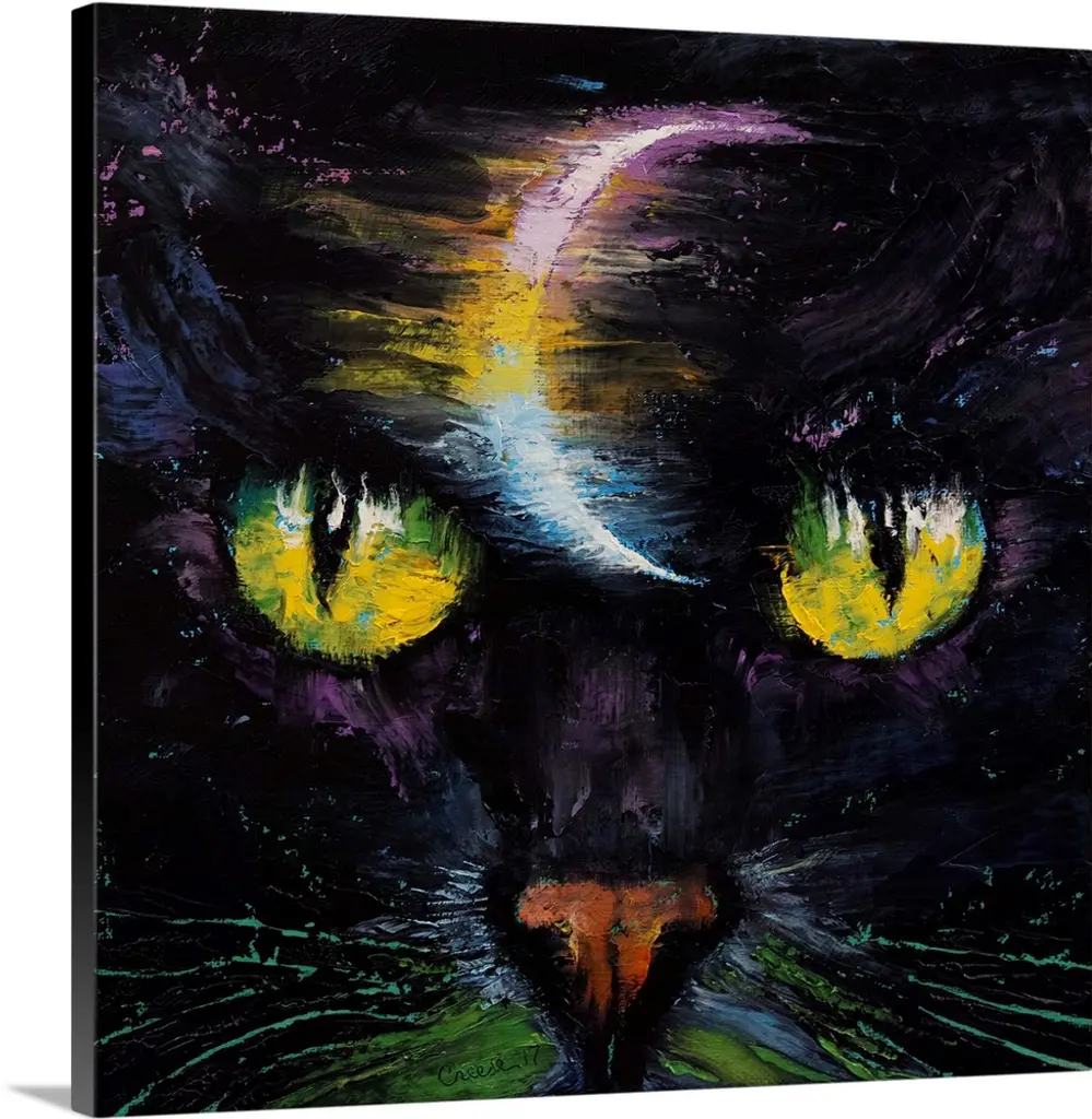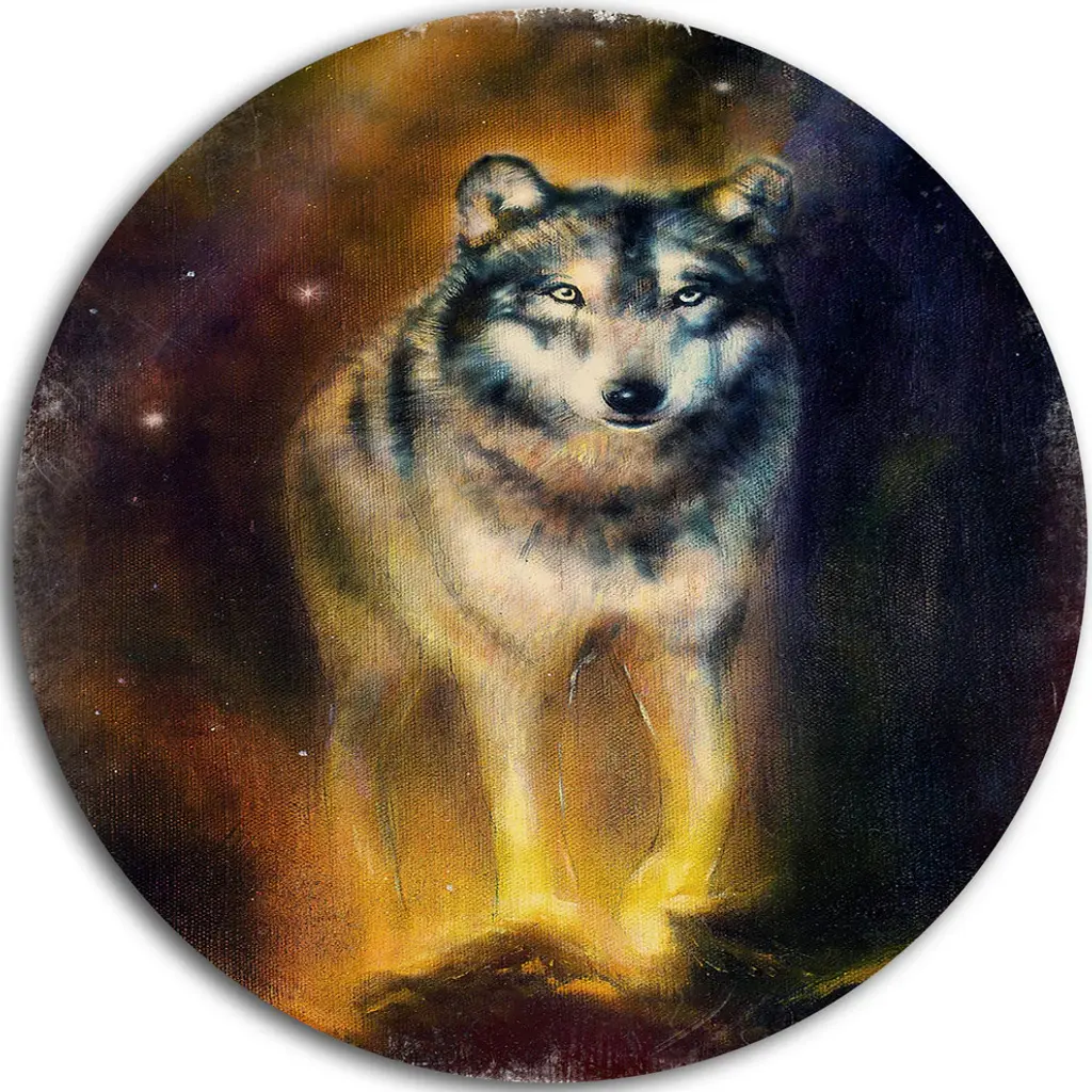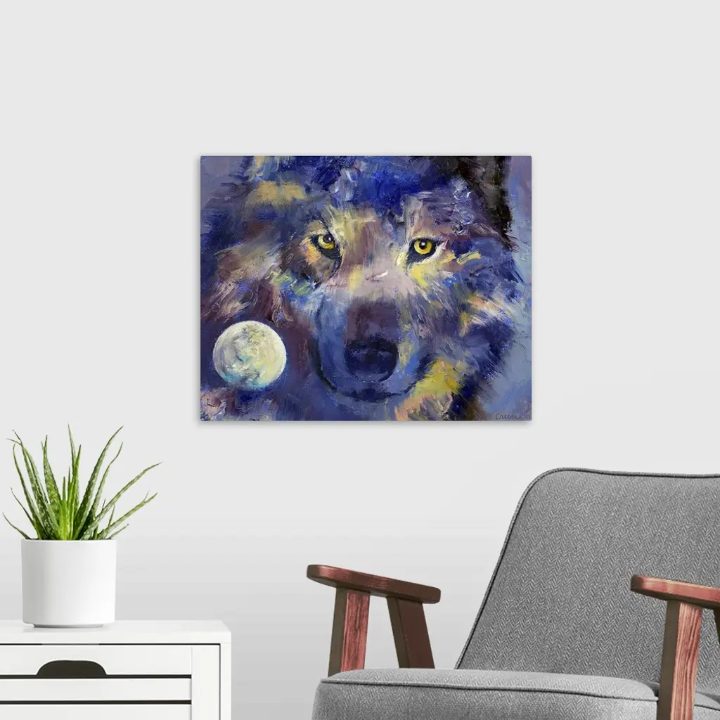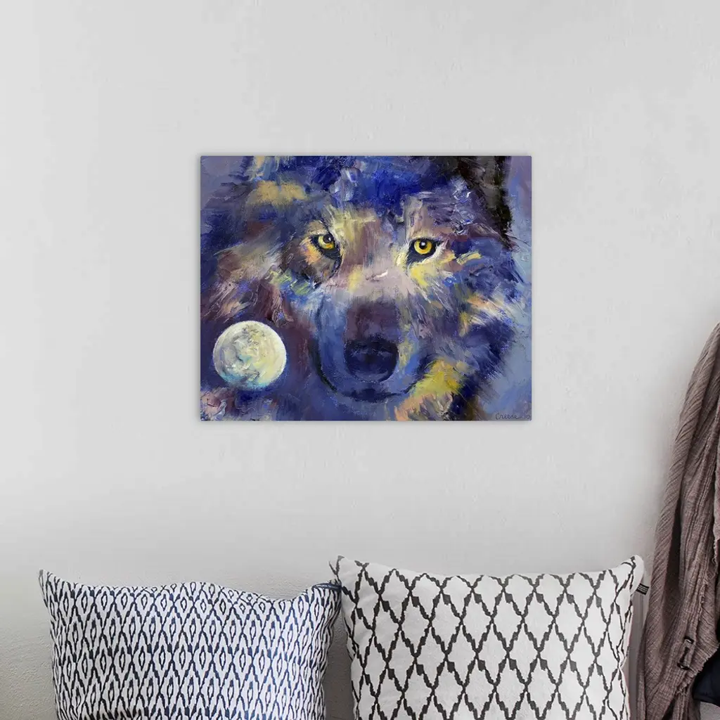 Oil painting with visible brush strokes of a wolf with a full moon inset in the lower left corner by an American artist.