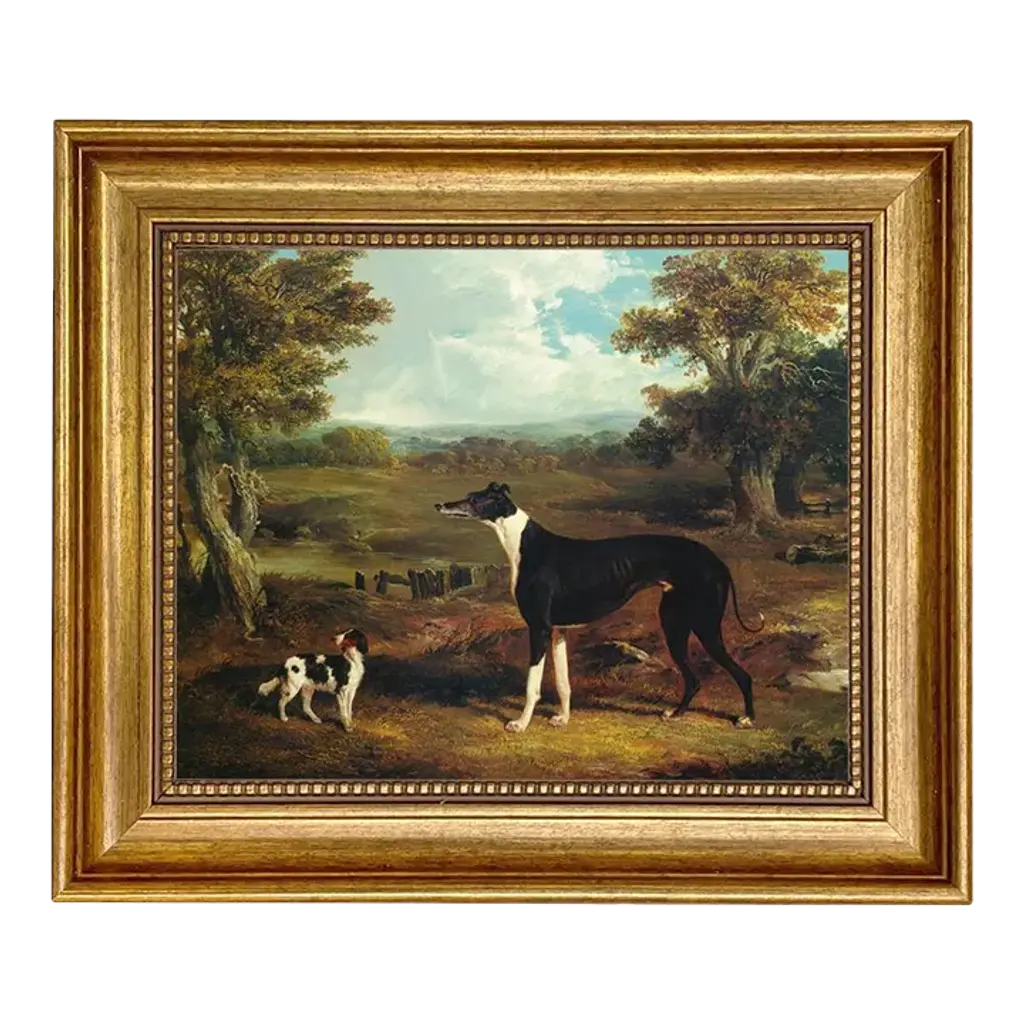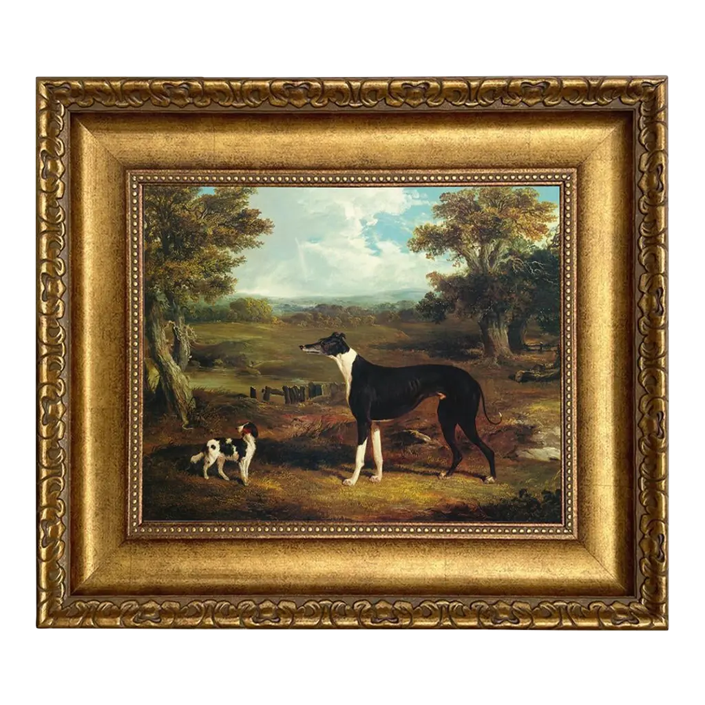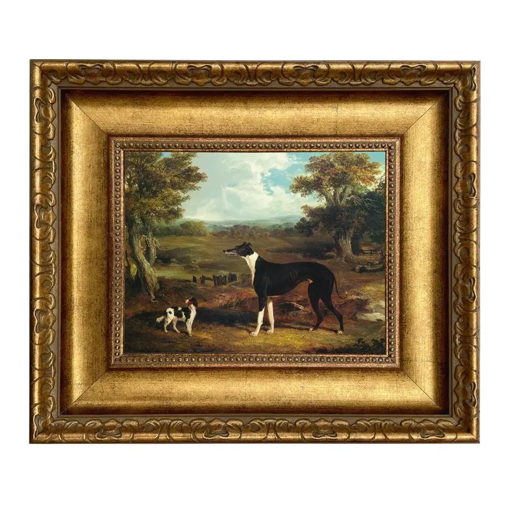Greyhound And King Charles Spaniel Print On Canvas In Wide Antiqued Gold Frame- 8X10 Framed To 14" X 16"