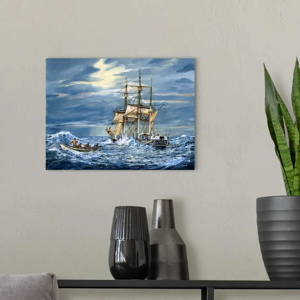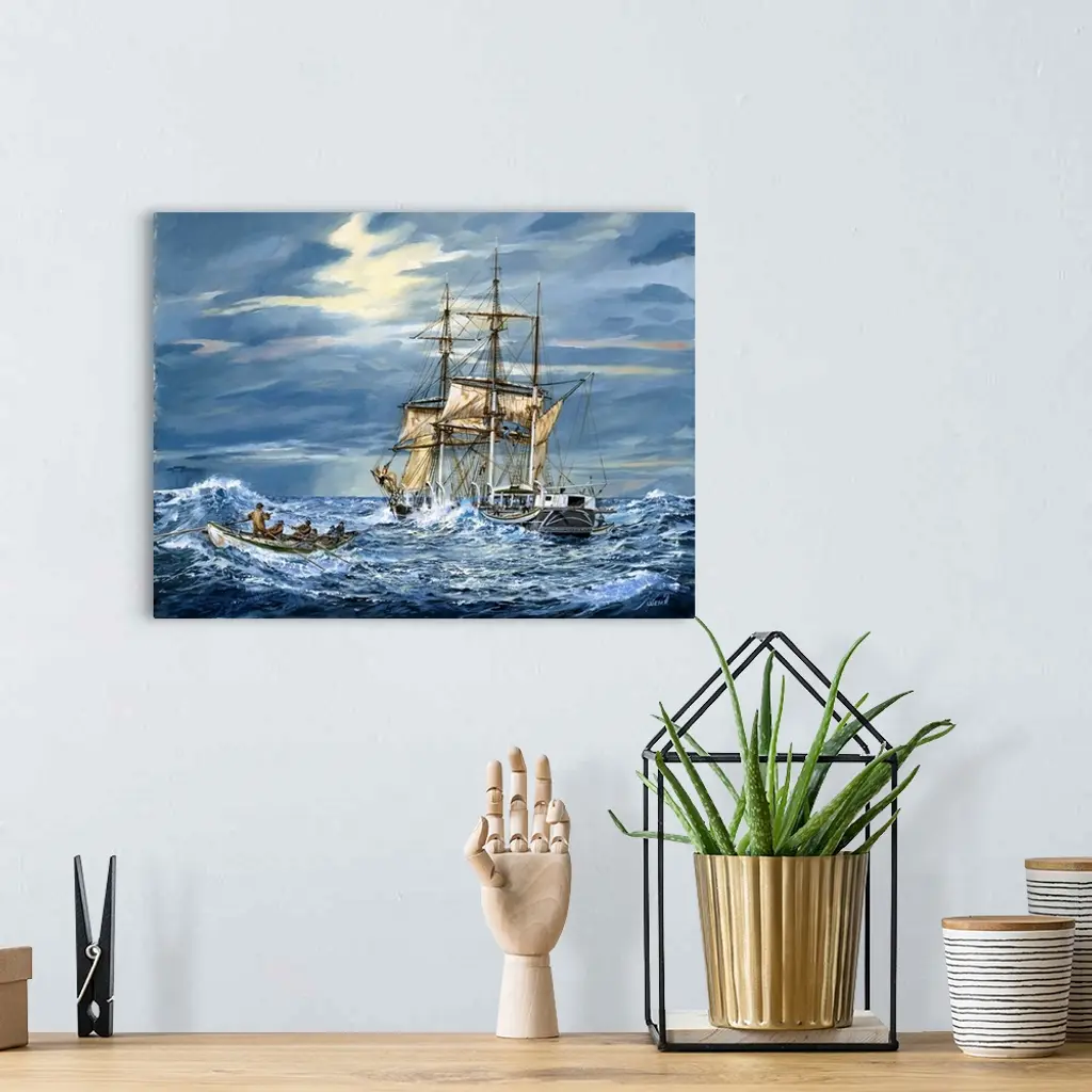 Contemporary painting of an idyllic scene of a ship sailing the open waters.