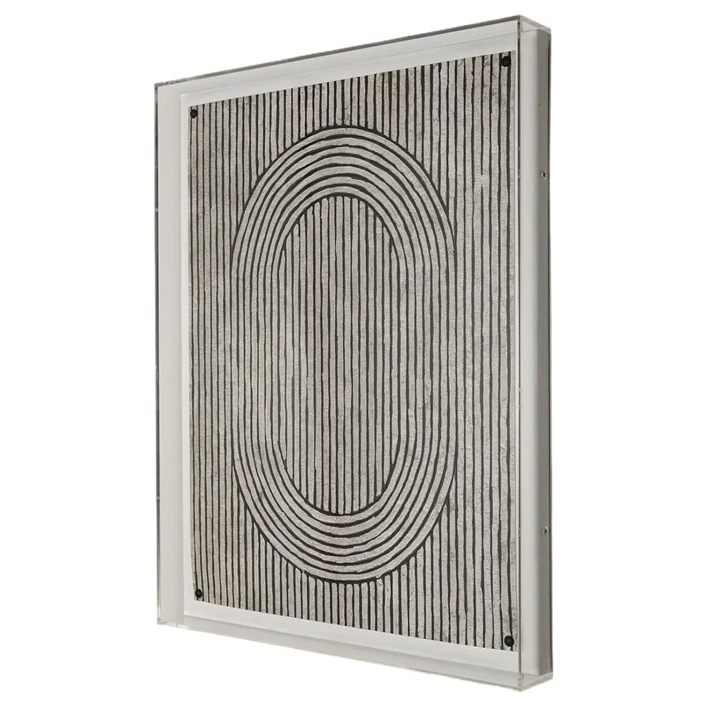 Grooves is a nod back to the 70's and early 80's in design with graphic giclee prints featuring lines in circular movements. Modern and transitional, the Grooves series of artwork is striking when shown as a set of four or individually on the wall. Featuring a giclee print mounted under a 2.5-inch deep lucite shadow box, the artwork print is attached to a linen-wrapped interior panel and finished with black nail heads in each corner. Each panel is sold individually and may be hung individually or as a set of four. Measurements: 26 inches high by 20 inches wide by 2.5 inches deep. Materials include an acrylic frame, interior board mount, and giclee paper print.