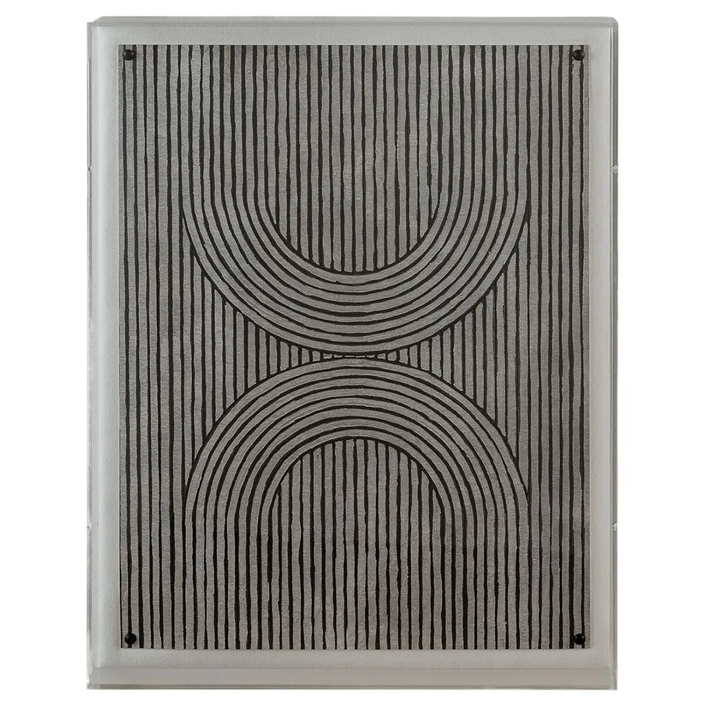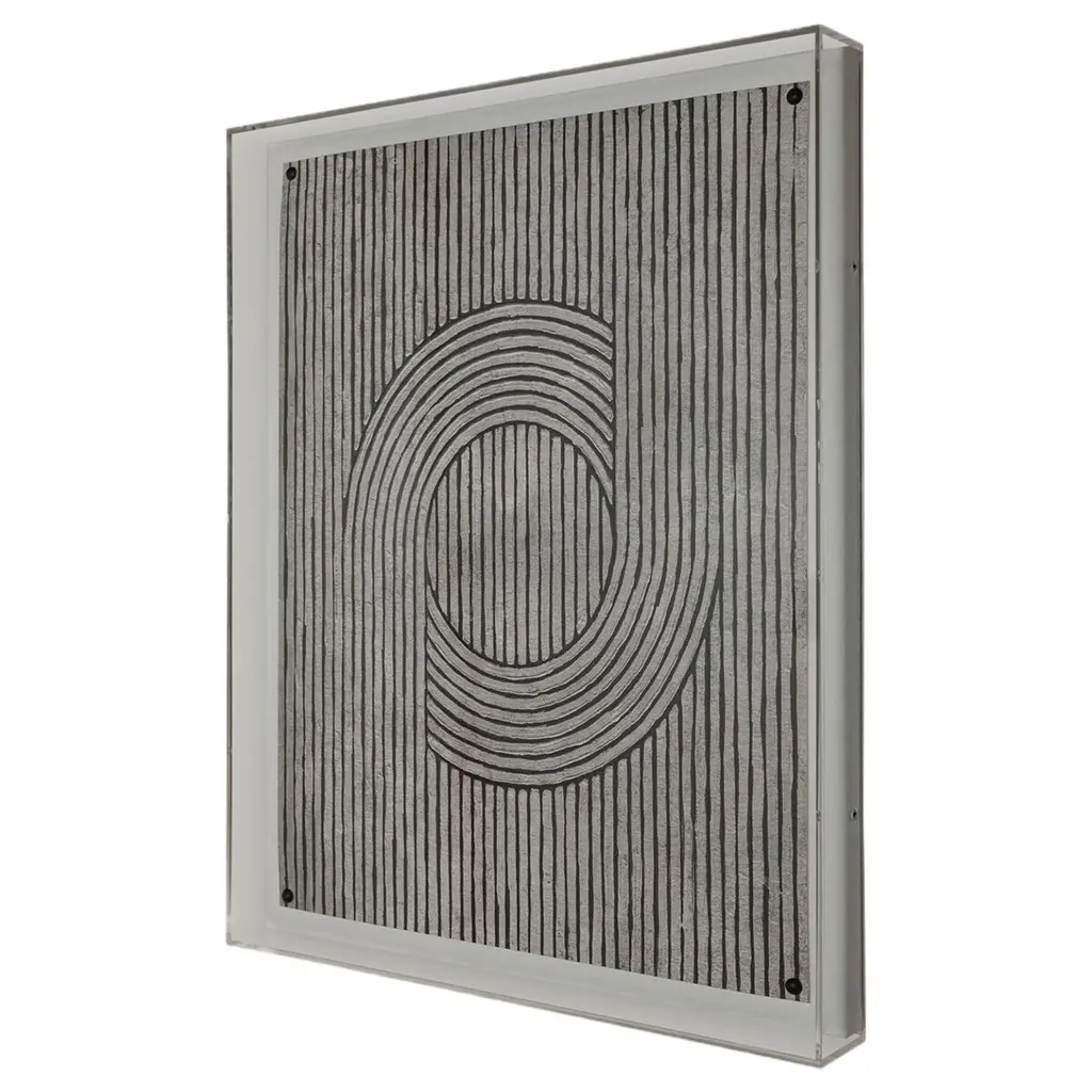 Grooves is a nod back to the 70's and early 80's in design with graphic giclee prints featuring lines in circular movements. Modern and transitional, the Grooves series of artwork is striking when shown as a set or individually on the wall. Featuring a giclee print mounted under a deep lucite shadow box, the artwork print is attached to a linen wrapped interior panel and finished with black nail head in each corner. Each panel is sold individually and may be hung individually or as a set. Measurements: 26"H x 20"W x 2.5"D. Materials: acrylic frame, interior board mount, giclee paper print.