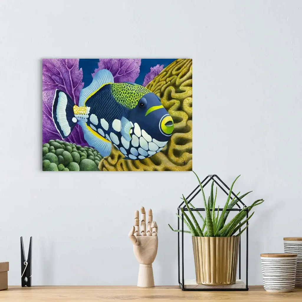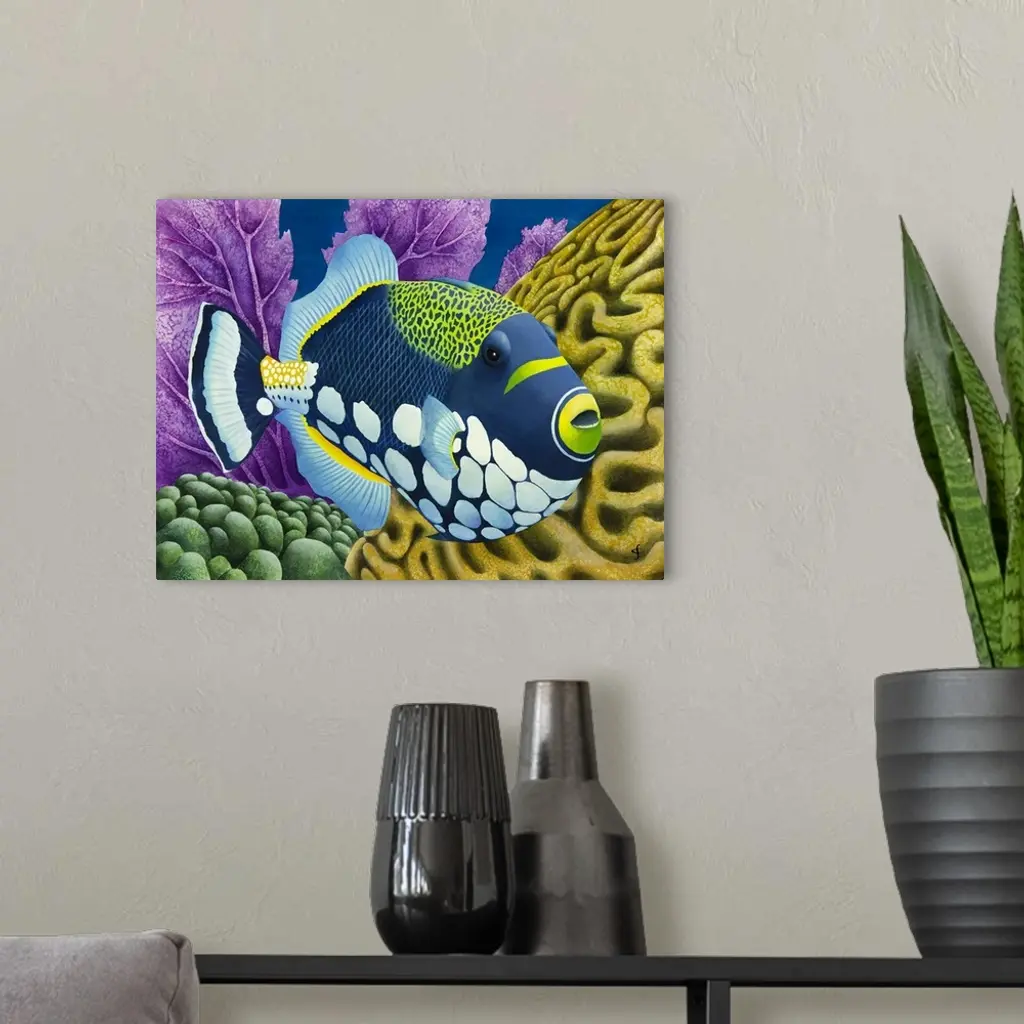 Contemporary painting of a large blue and green fish surrounded by coral reefs.