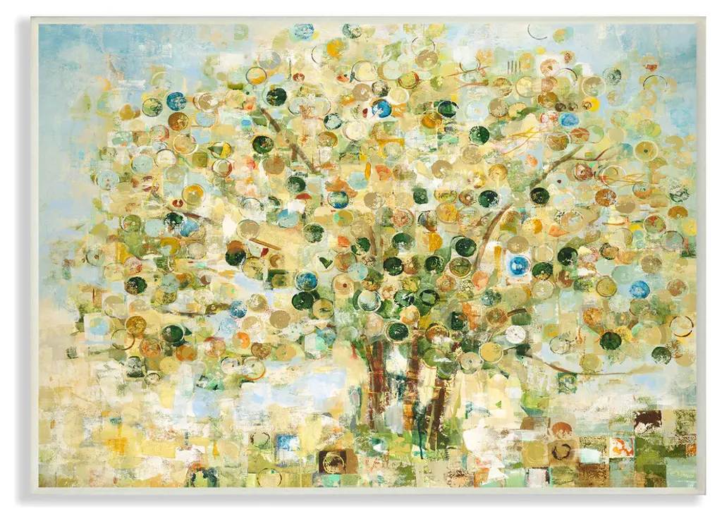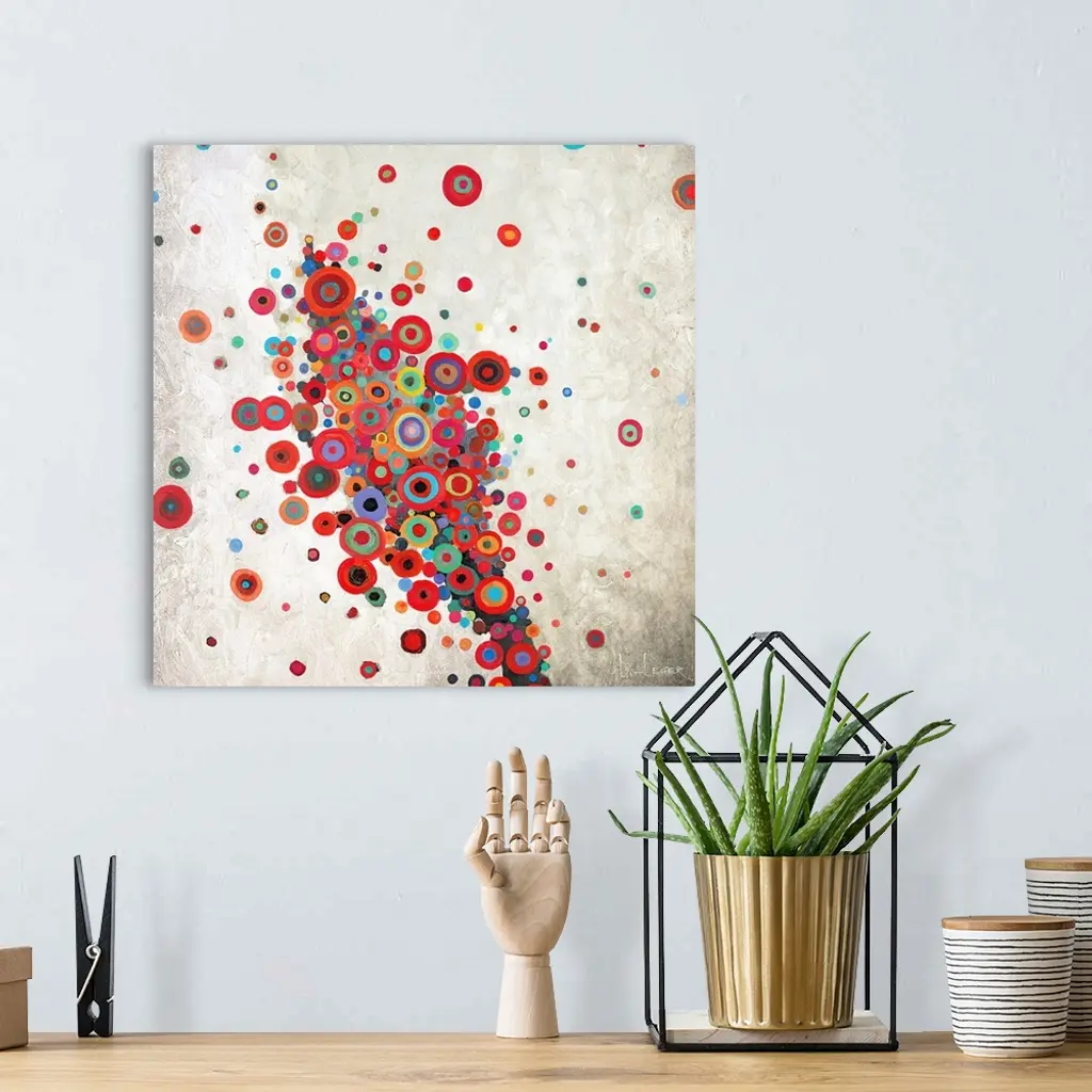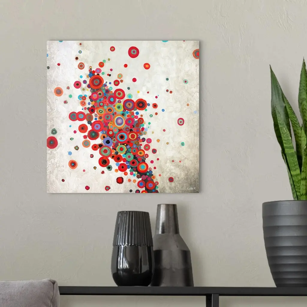 Square painting of a group of multi-colored circles against a neutral backdrop.