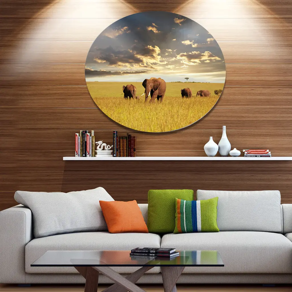 Group Of Elephants In Africa, African Large Disc Metal Wall Art, 23"
