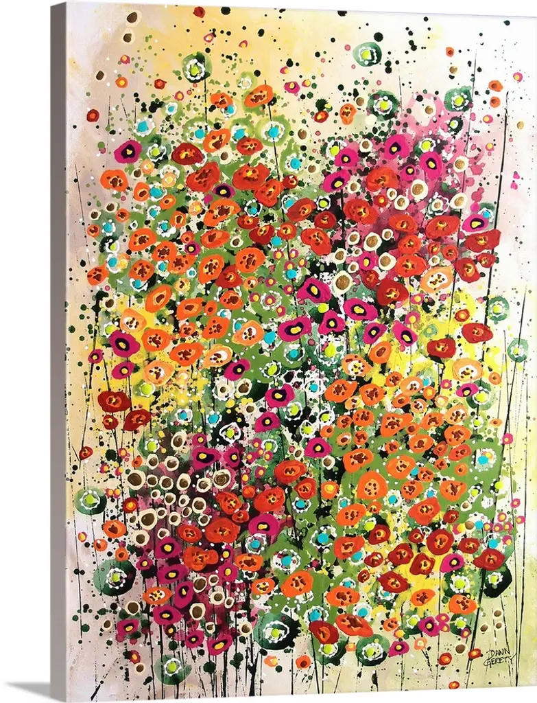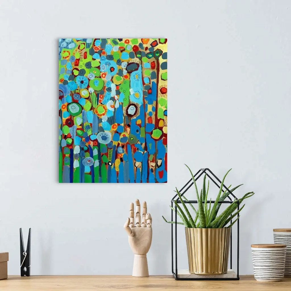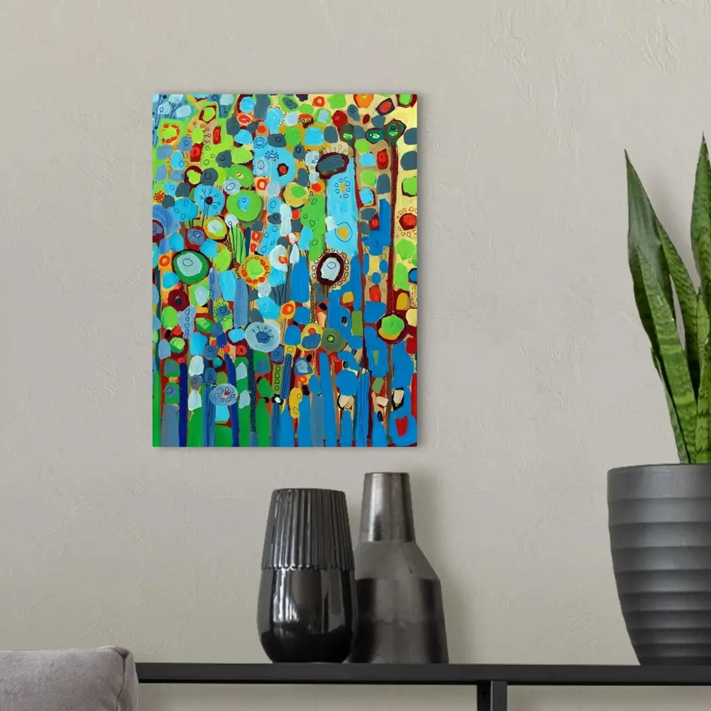 Large portrait abstract painting of a variety of circular flowers growing vertically in mainly cool tones.