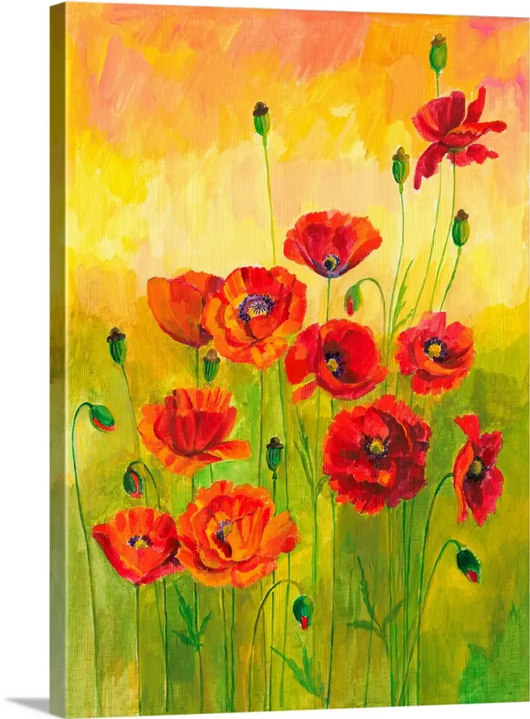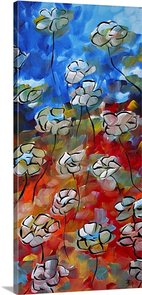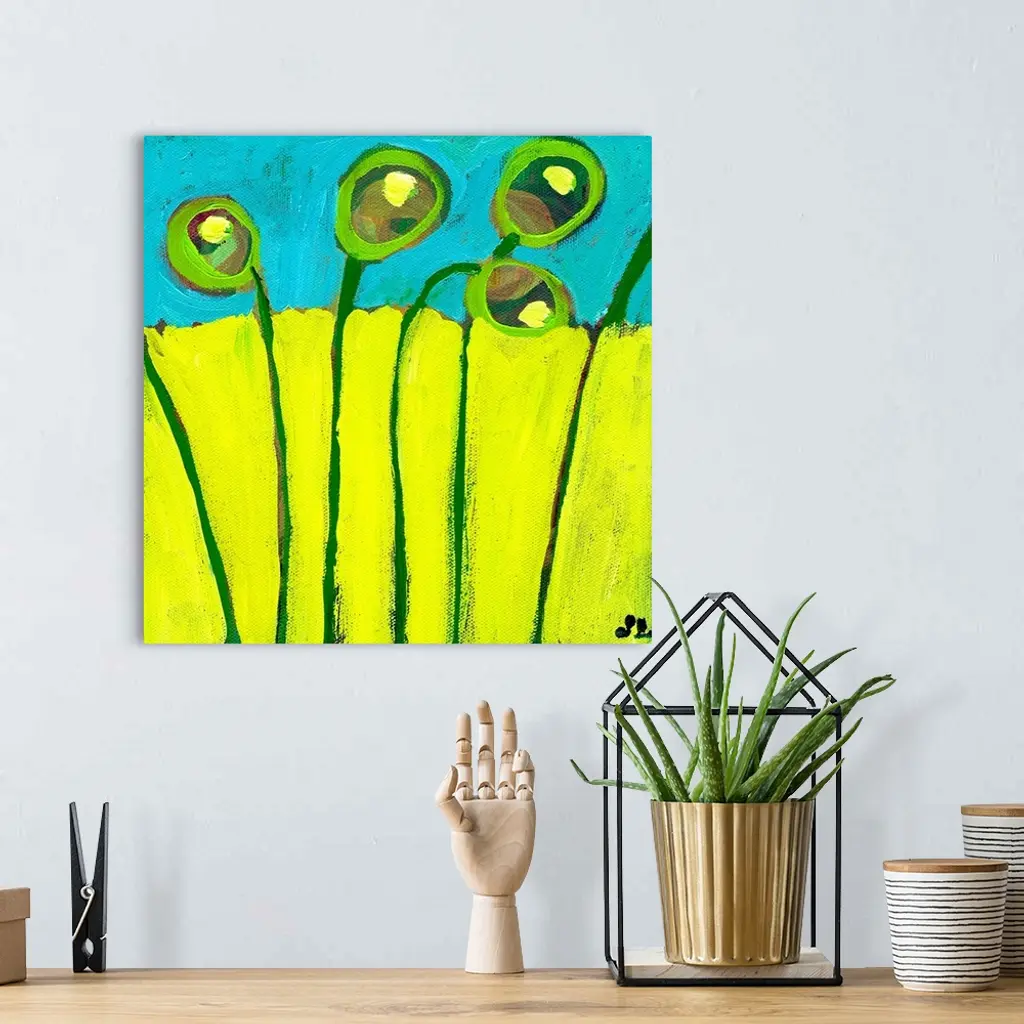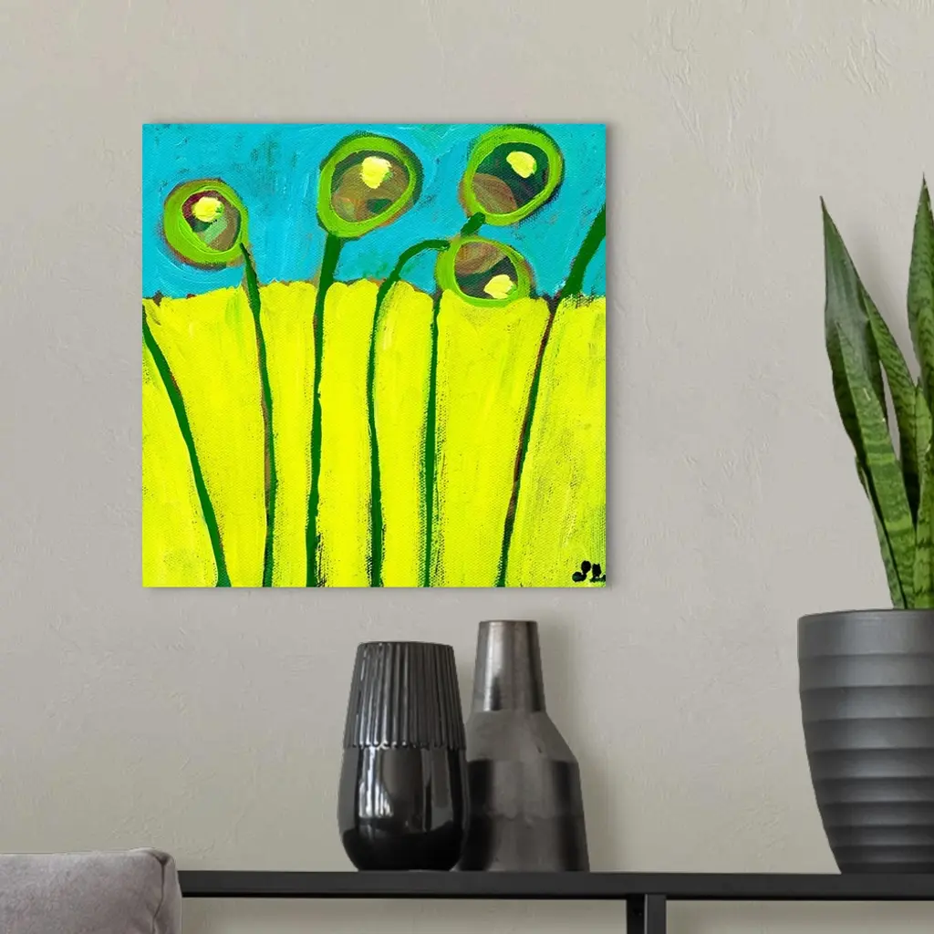Contemporary painting of circular flowers coming up through the earth and growing towards the sky.