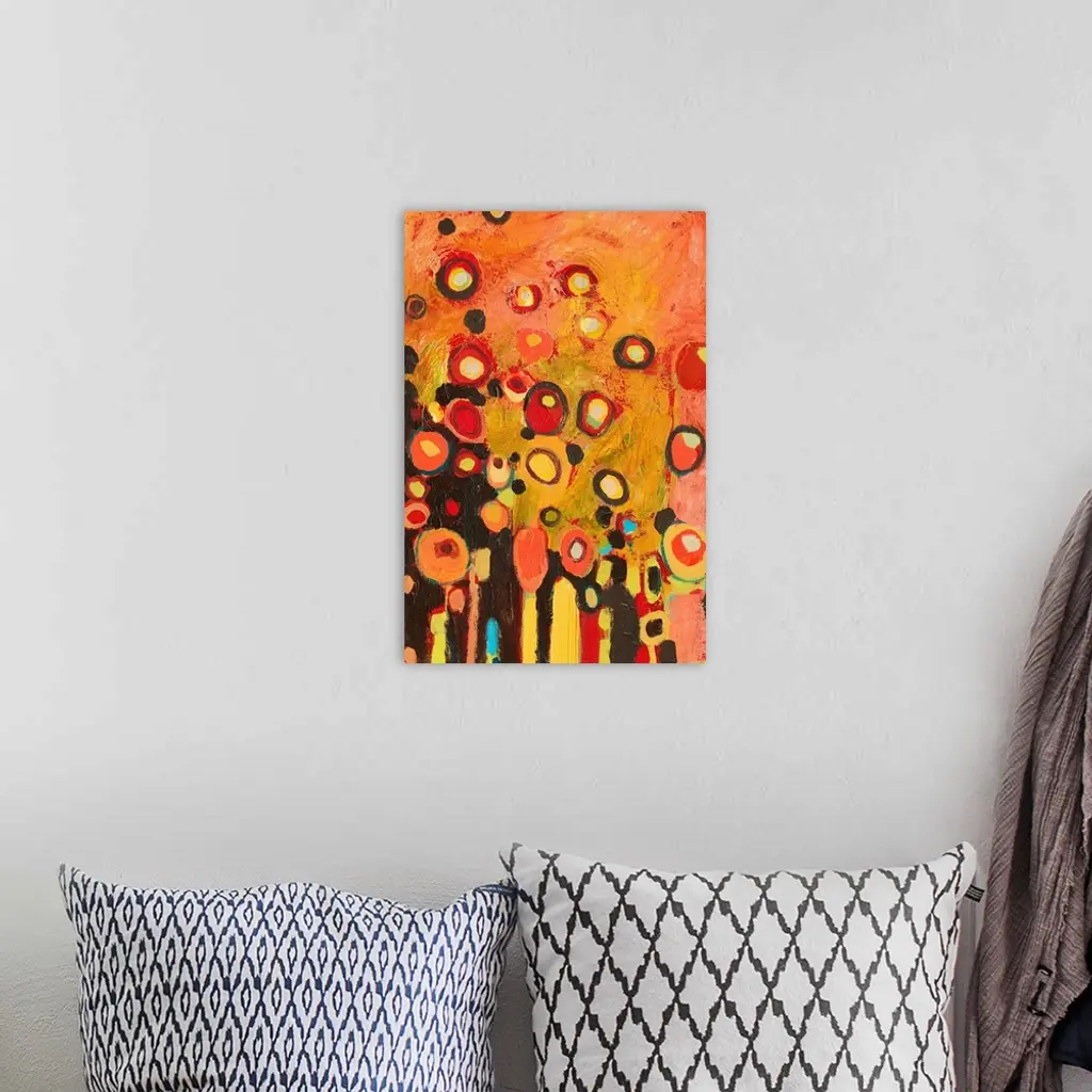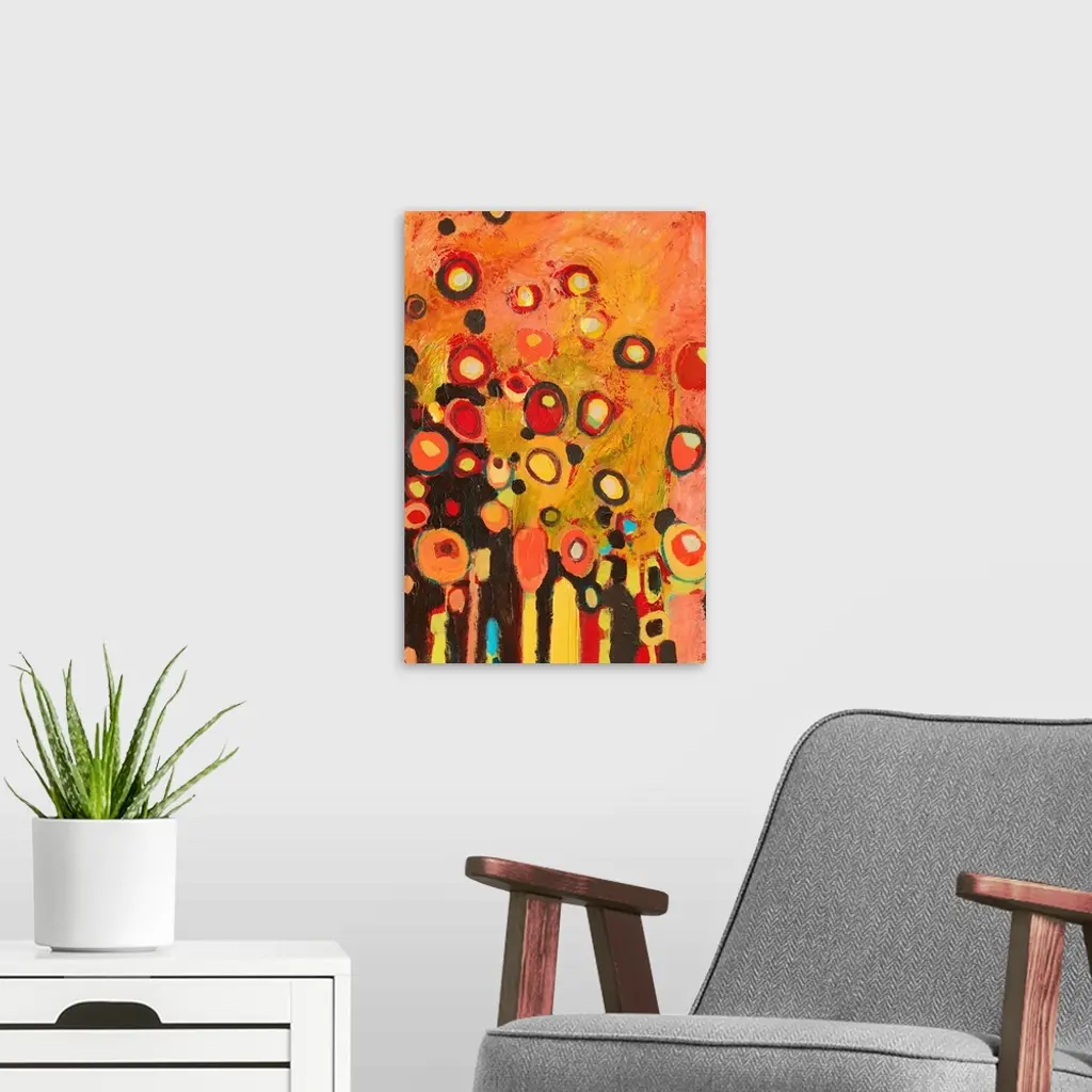 A colorful contemporary piece with mostly warmer tones and circles with several colors throughout the painting.