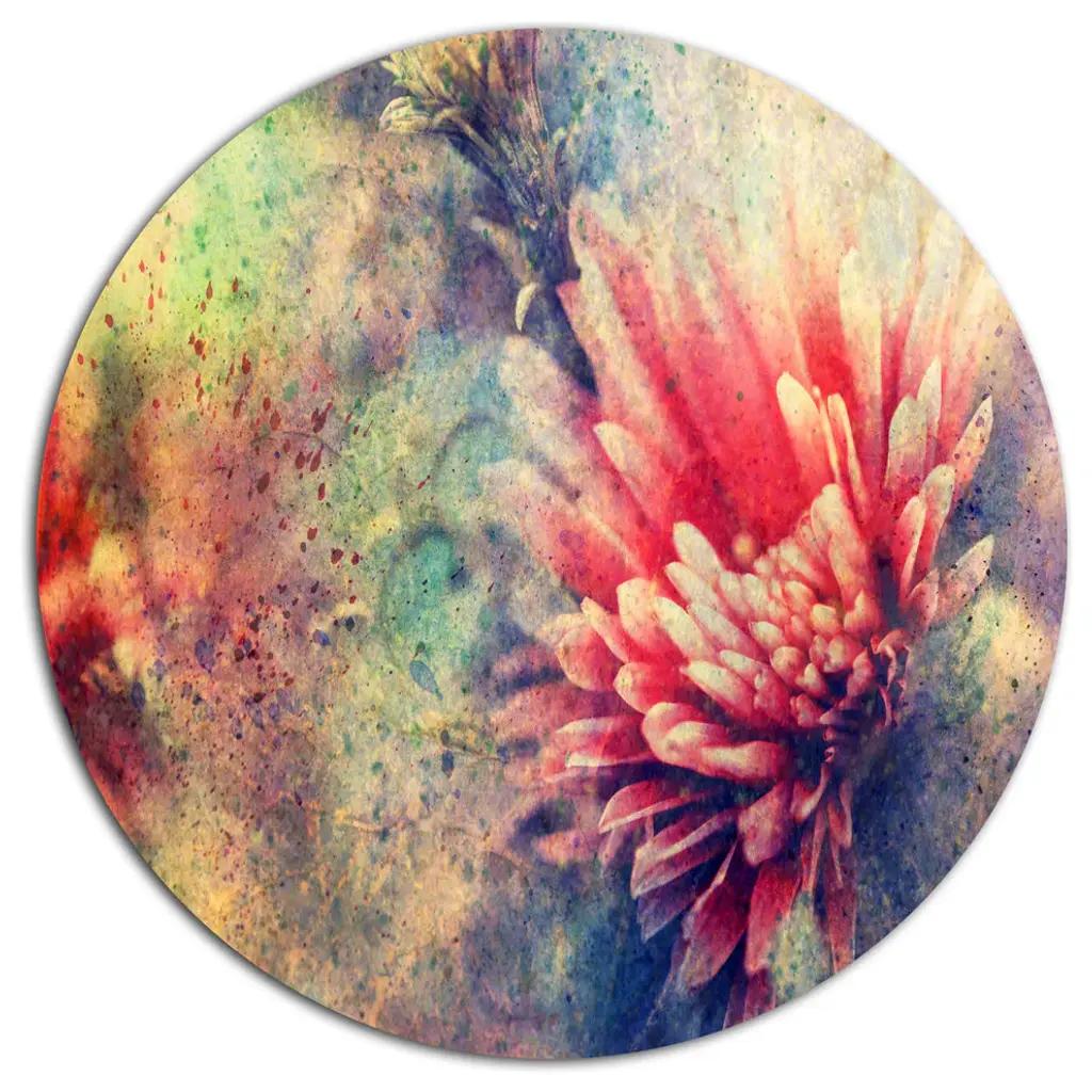 Bring Contemporary Abstraction to your home with this large Circle Metal wall art. This Grunge Art with Flower and Splashes Metal Artwork makes it the focal point of any room or office. - White Gloss Coating ensures colors are extra vibrant with light reflection.- Aluminum grade Sheet Metal with 1 inch mounting frame on the back giving the illusion that the artwork is floating on the wall..- Mounting Brackets are included along with instructions.- High Quality Digital images are created directly into a glossy aluminum panel producing a stunning and captivating print into the glossy finish of the metal.- Water, Fire and Scratch resistant HD Aluminum panels.- Looks better than any photo paper and guaranteed to last at least 20 years- Easy to clean with a microfiber cloth. Colors are far superior to regular Canvas Art. - Easy to Hang