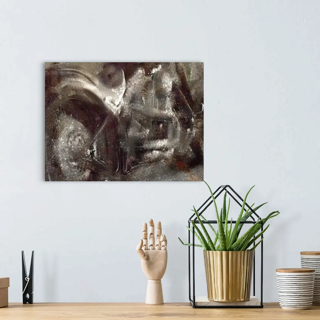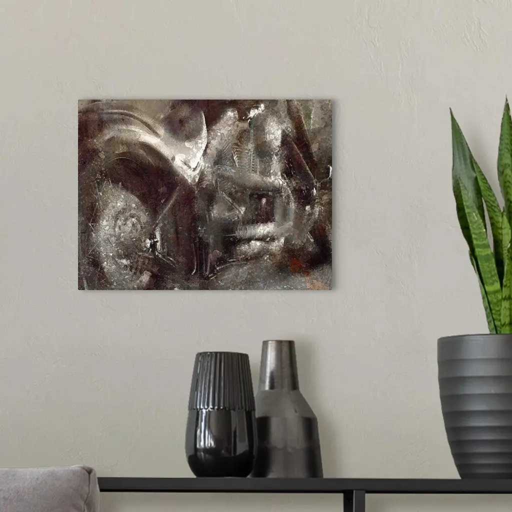 Abstract painting of a motorcycle in dark grey shades.