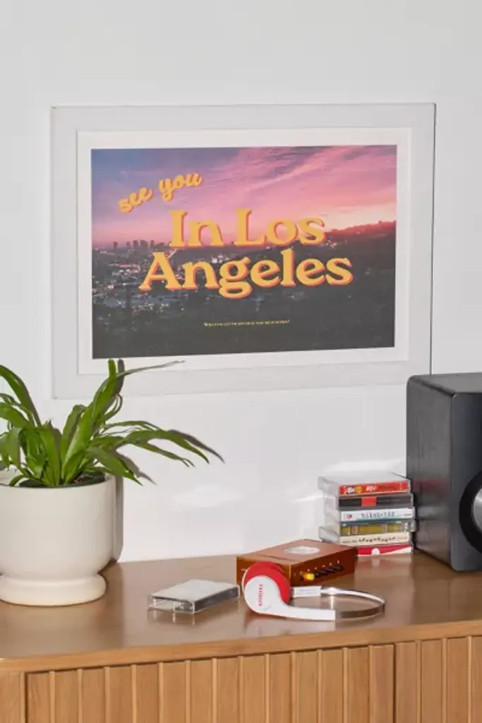 Art print by GS Print Shoppe featuring See You in Los Angeles text. Printed on archival paper made from cotton pressed in Italian mills, this high-quality art print is available in sizes and frames just right for your space. First select your frame (or go frameless), then select your size. **About the Frames** \- The exact width of each frame may vary slightly \- All frames are manufactured in the US \- Matte frames are durable poly \- Wood frames are recycled wood \- All are fitted with protective plexiglass \- Finished with wood moldings, archival backer and protective bumpers **Size** \- Available in multiple sizes \- Use the Size Guides to find the size that fits your space **Content + Care** \- Wipe clean \- Made in the USA