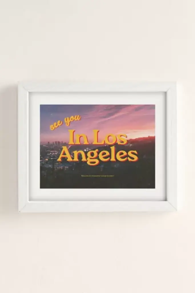 Art print by GS Print Shoppe featuring See You in Los Angeles text. Printed on archival paper made from cotton pressed in Italian mills, this high-quality art print is available in sizes and frames just right for your space. First select your frame (or go frameless), then select your size. **About the Frames** \- The exact width of each frame may vary slightly \- All frames are manufactured in the US \- Matte frames are durable poly \- Wood frames are recycled wood \- All are fitted with protective plexiglass \- Finished with wood moldings, archival backer and protective bumpers **Size** \- Available in multiple sizes \- Use the Size Guides to find the size that fits your space **Content + Care** \- Wipe clean \- Made in the USA