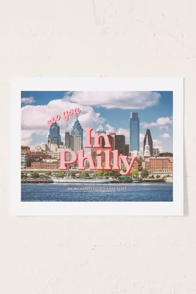 Art print from GS Print Shoppe featuring a Philly photo postcard. Printed on archival paper made from cotton pressed in Italian mills, this high-quality art print is available in sizes and frames just right for your space. First select your frame (or go frameless), then select your size. **About the Frames** \- The exact width of each frame may vary slightly \- All frames are manufactured in the US \- Matte frames are durable poly \- Wood frames are recycled wood \- All are fitted with protective plexiglass \- Finished with wood moldings, archival backer and protective bumpers **Size** \- Available in multiple sizes \- Use the Size Guides to find the size that fits your space **Content + Care** \- Wipe clean \- Made in the USA