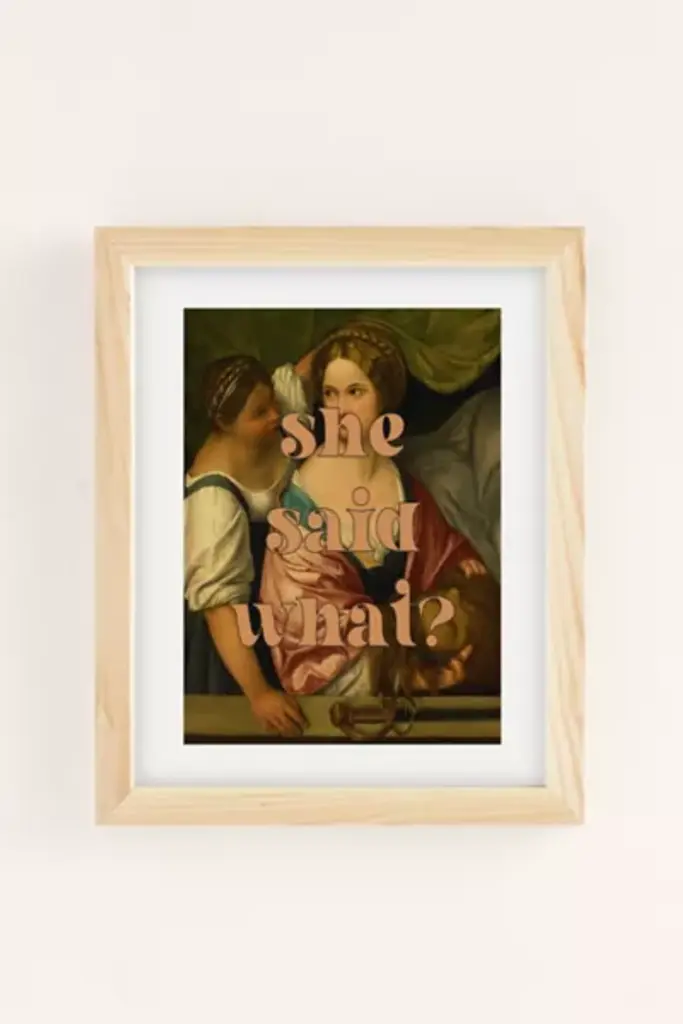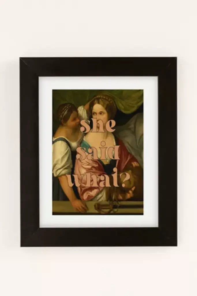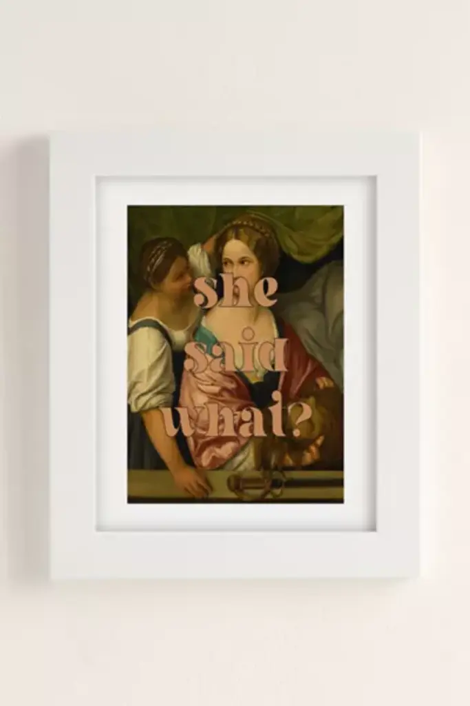 Art print from GS Print Shoppe featuring She Said What text over a classic painting. Printed on archival paper made from cotton pressed in Italian mills, this high-quality art print is available in sizes and frames just right for your space. First select your frame (or go frameless), then select your size. **About the Frames** \- The exact width of each frame may vary slightly \- All frames are manufactured in the US \- Matte frames are durable poly \- Wood frames are recycled wood \- All are fitted with protective plexiglass \- Finished with wood moldings, archival backer and protective bumpers **Size** \- Available in multiple sizes \- Use the Size Guides to find the size that fits your space **Content + Care** \- Wipe clean \- Made in the USA
