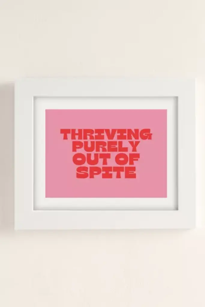 Art print from GS Print Shoppe featuring Thriving Purely Out Of Spite text. Printed on archival paper made from cotton pressed in Italian mills, this high-quality art print is available in sizes and frames just right for your space. First select your frame (or go frameless), then select your size. **About the Frames** \- The exact width of each frame may vary slightly \- All frames are manufactured in the US \- Matte frames are durable poly \- Wood frames are recycled wood \- All are fitted with protective plexiglass \- Finished with wood moldings, archival backer and protective bumpers **Size** \- Available in multiple sizes \- Use the Size Guides to find the size that fits your space **Content + Care** \- Wipe clean \- Made in the USA